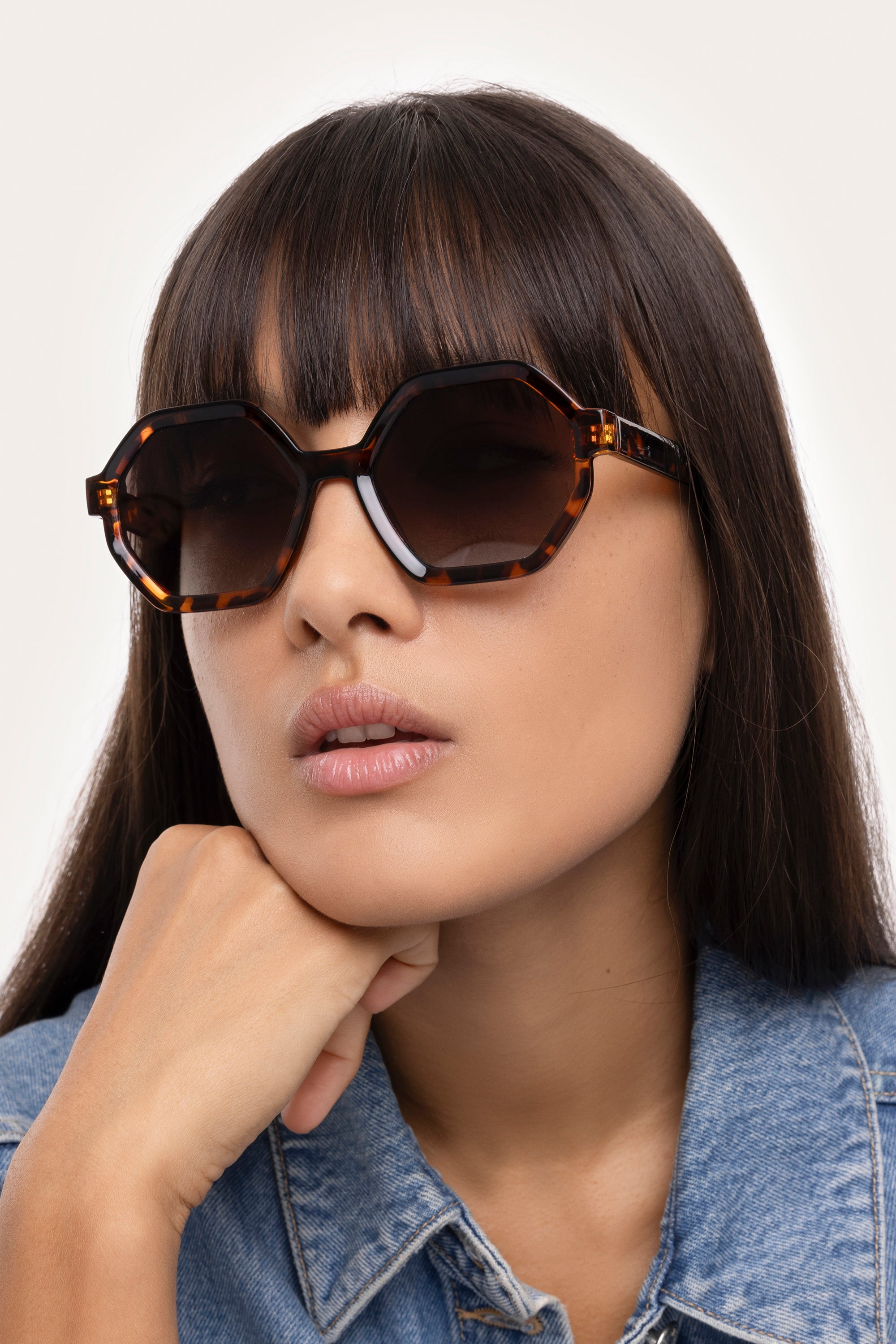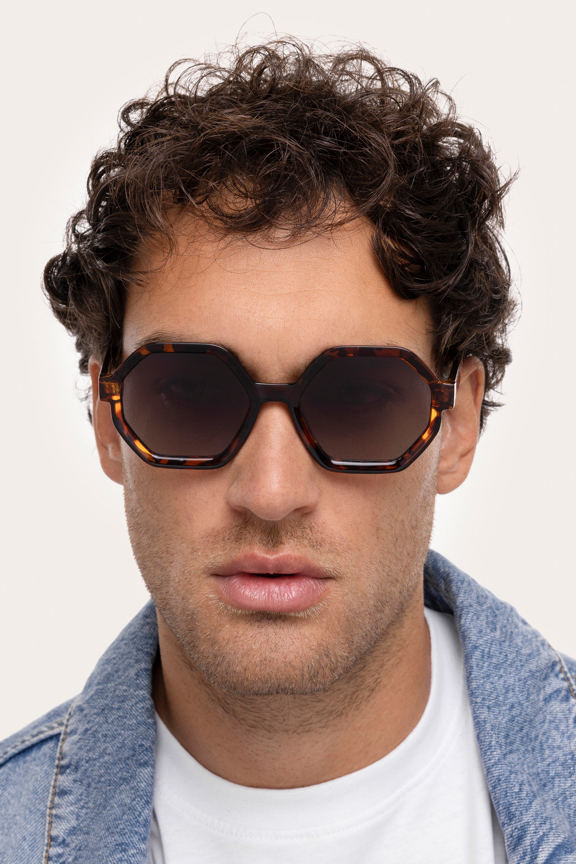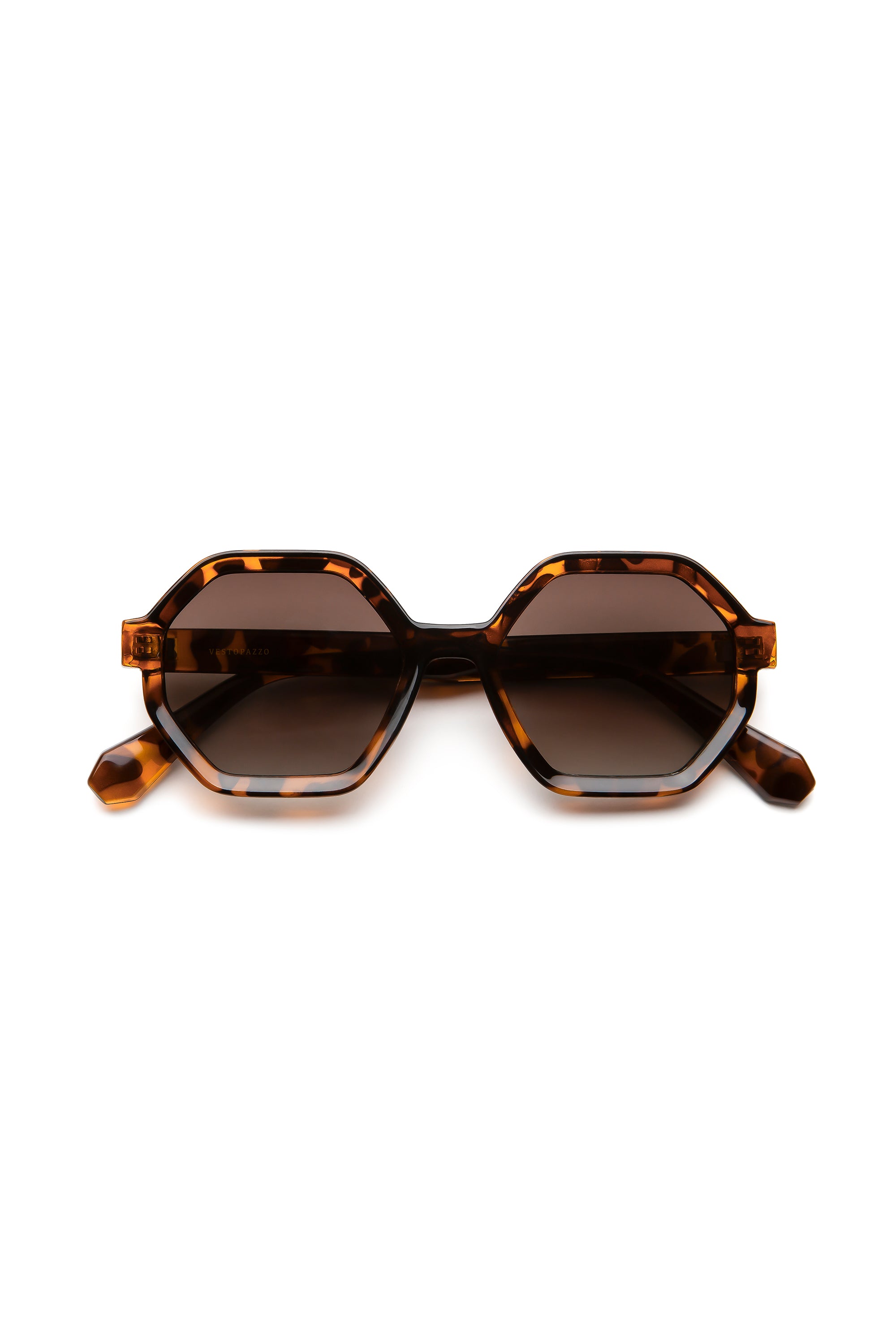 Occhiali da sole London esagonali. Montatura trasparente colore caramello/tartarugato in materiale riciclato e lenti polarizzate. Nella confezione è inclusa una custodia morbida con panno per la pulizia del prodotto. Categoria di filtro 3. Abbina gli occhiali da sole ai tuoi gioielli preferiti e portali sempre con te. Leggeri, pratici e comodi da indossare, sono i compagni di viaggio perfetti per le avventure di ogni giorno.