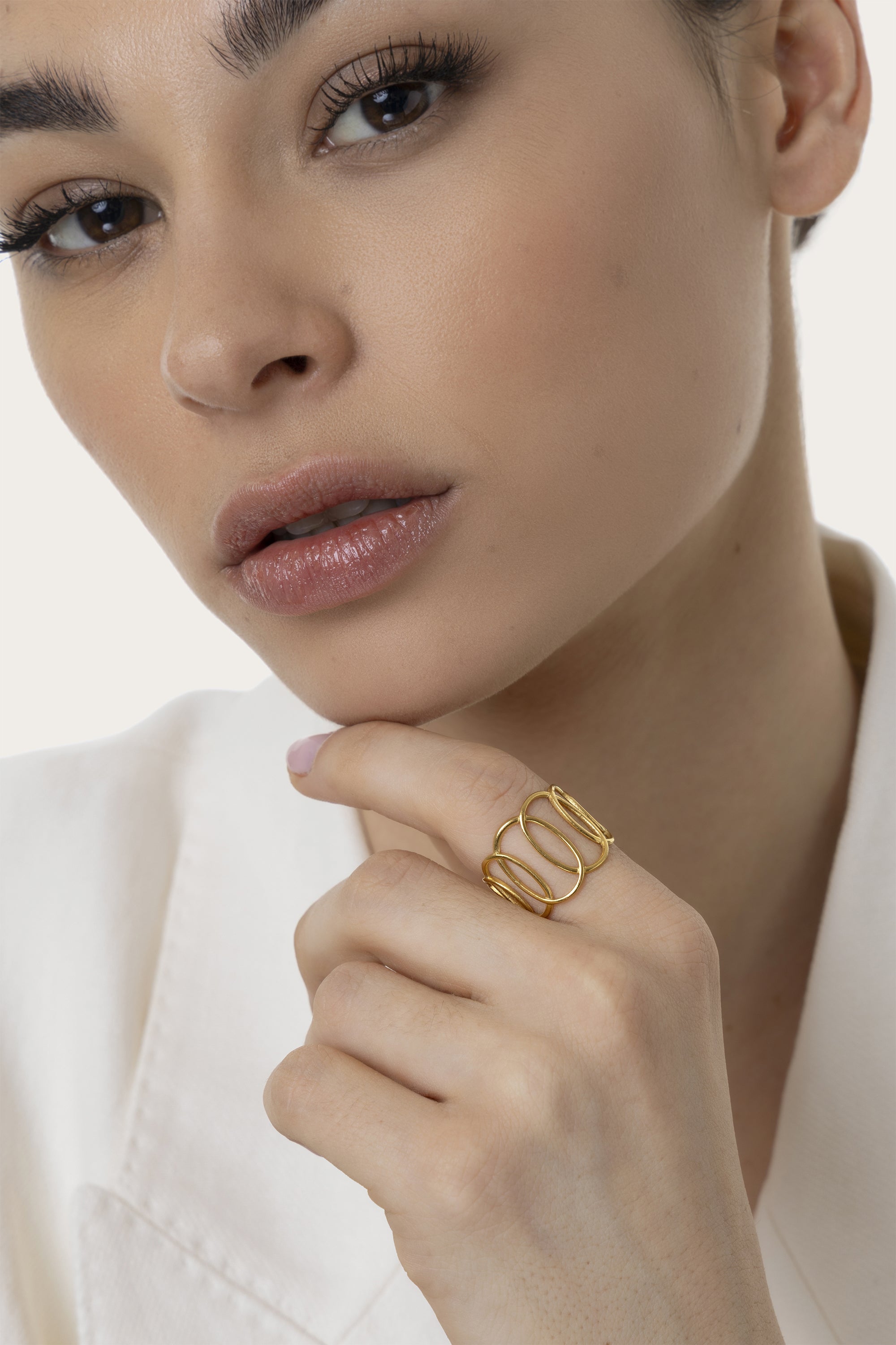 Anello in acciaio gold plated. Questo gioiello è caratterizzato da un design essenziale e scultoreo per aggiungere un tocco artistico ai tuoi look. La texture a ovali dona luce e movimento. Il modello regolabile lo rende facile da portare ogni giorno, anche in stacking con altri anelli a fascia. Nickel tested.