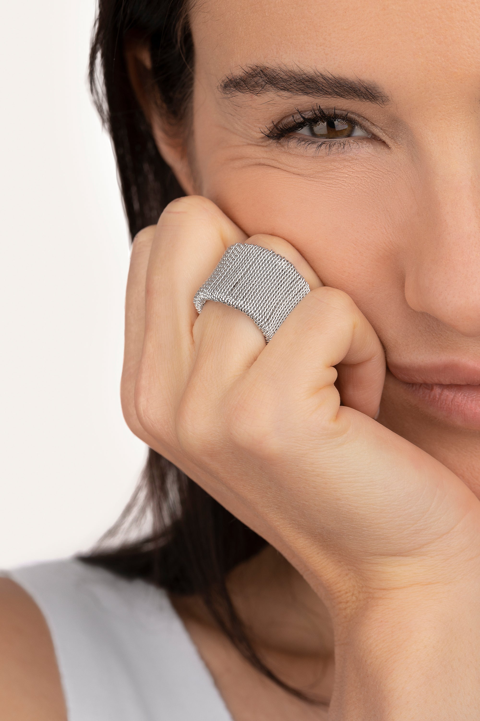 Design avvolgente e stile unico. Anello fascia in maglia chain compatta e flessibile che veste come un nastro luminoso. Bellissimo solo, super cool accanto a fedine sottili. Modello regolabile. Placcatura argento 100% artigianale. Nickel tested. Lavorazione artigianale. Gioielli fatti a mano, unici e artigianali, perfetti per tutti i tuoi look o come idea regalo.