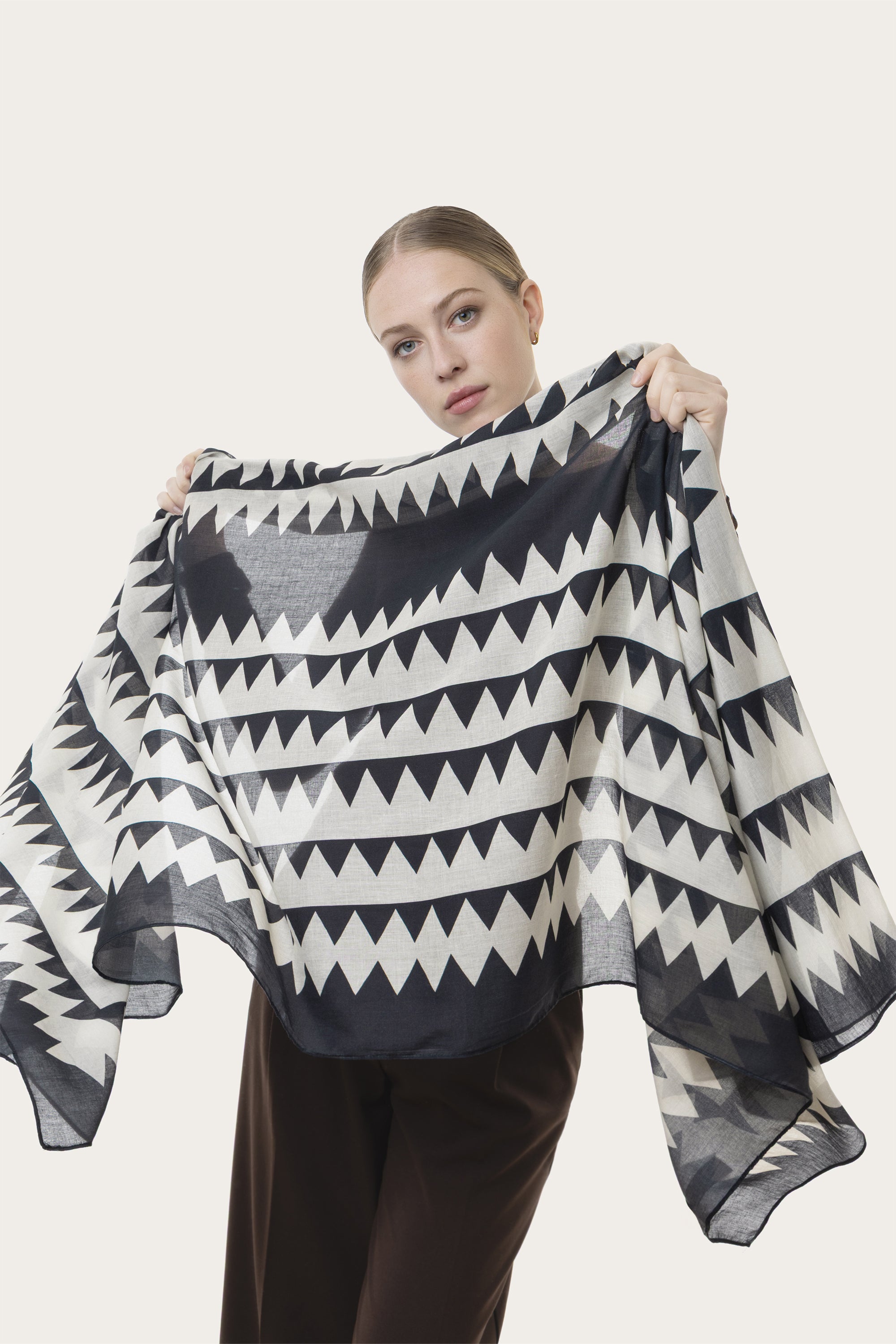 La sciarpa Freccia è realizzata in 100% cotone. Leggera, morbida e avvolgente, questa sciarpa è caratterizzata da una fantasia geometrica minimal ed elegante. Abbinala ai tuoi gioielli e borse preferite per completare il tuo look. Misura: 100x180cm. Lavorazione artigianale.
