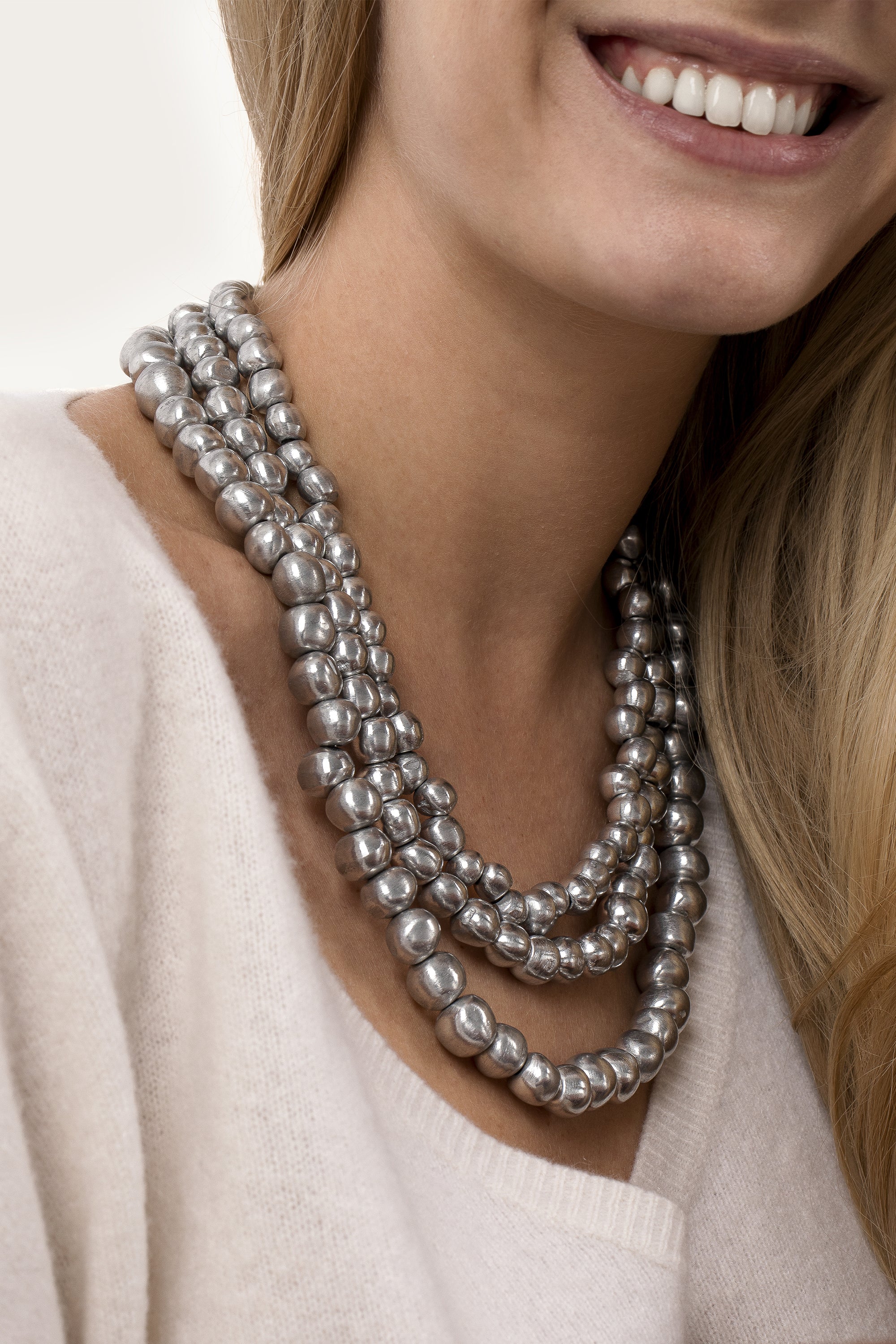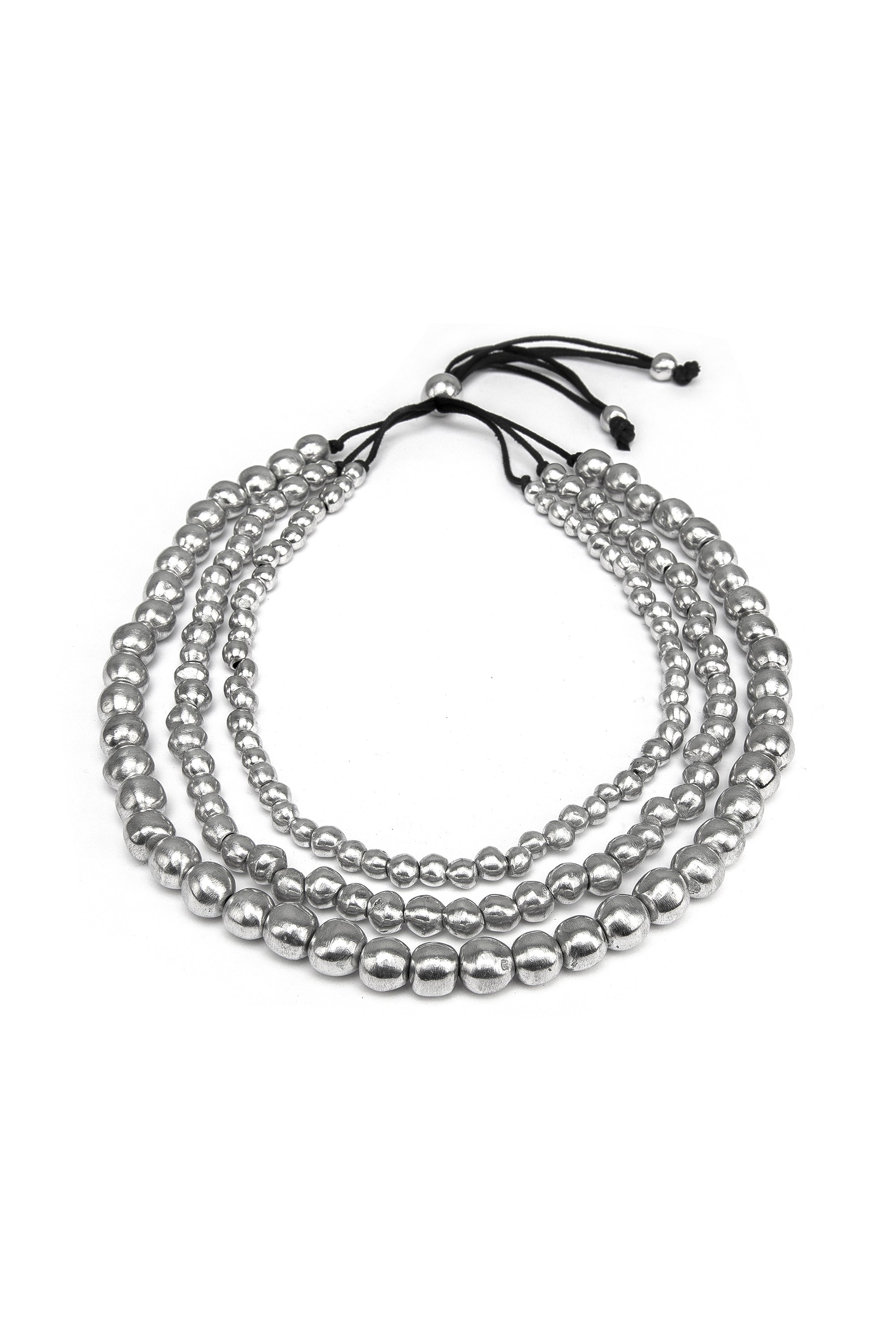 Collana in alluminio 100% riciclato composta da quattro fili su cordoncino nero con sfere graduate lucide. Chiusura scorrevole a coulisse per regolazione della lunghezza. Ultraleggera e confortevole sulla pelle. Perfetta come pezzo statement o abbinata ad altre collane. Nickel tested. Lavorazione artigianale. Gioielli fatti a mano, unici e artigianali, perfetti per tutti i tuoi look o come idea regalo.