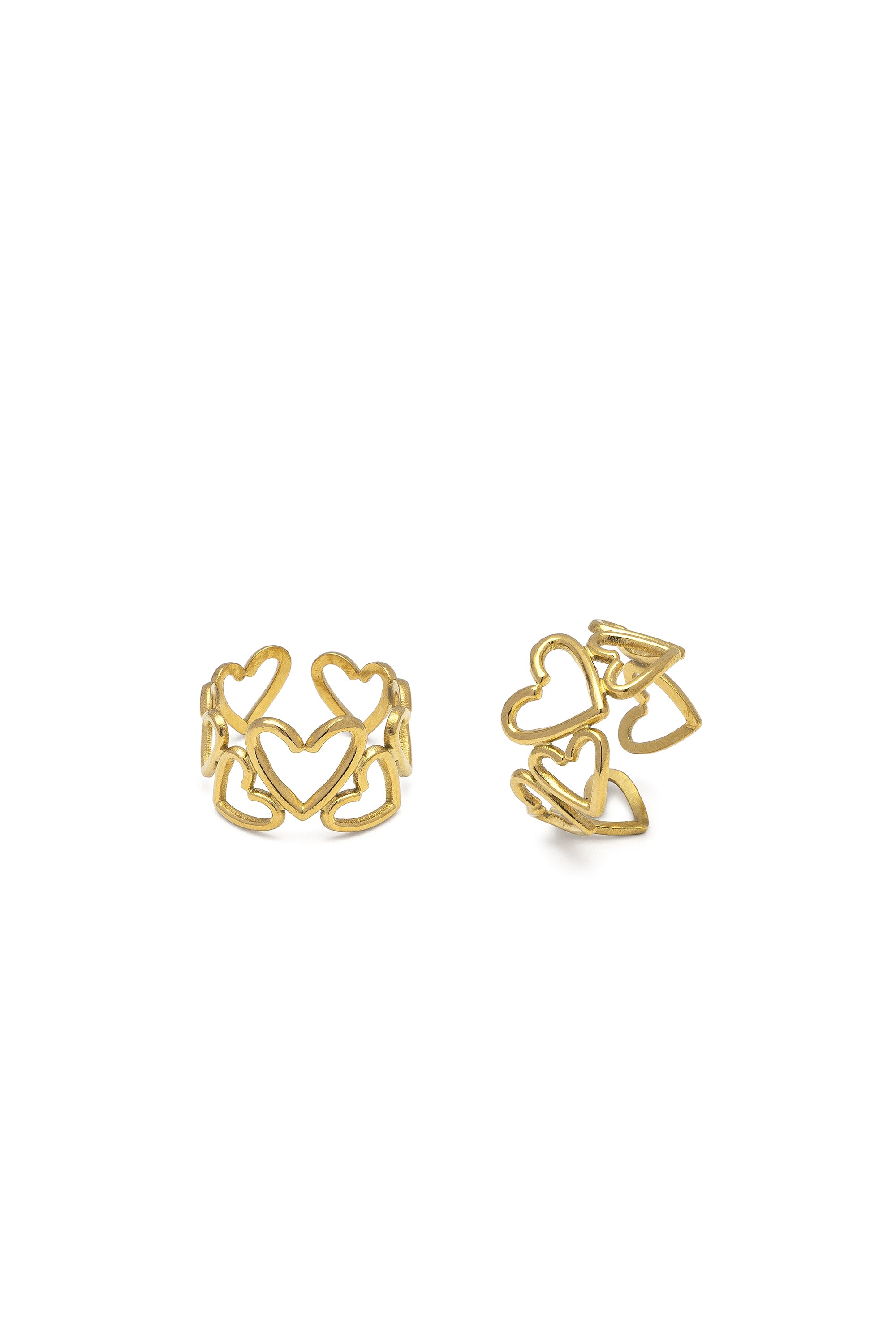 Anello in acciaio gold plated. Questo gioiello gioca con un disegno traforato di cuori battenti in un motivo dallo stile funny ma elegante. Regolabile e luminoso, è perfetto da indossare ogni giorno, da solo o in combinazione con altri anelli a fascia. Nickel tested.