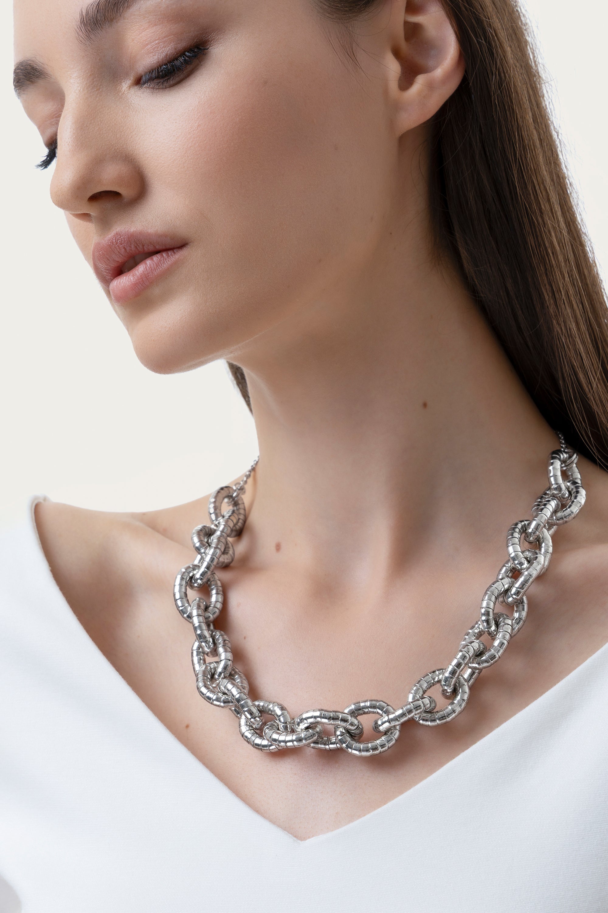 La struttura maxi chain di quessta collana è resa unica dalla texture snake di tendenza. Adatta a uno stile glam o fashion-forward, questo pezzo aggiunge un tocco audace e sofisticato a qualsiasi look. Perfetta da abbinare ad altre collane più minimal o bold per creare layering personalizzati. Chiusura regolabile con moschettone. Lunghezza collana 52 cm. Lunghezza extra chain 6,5 cm. Materiale: placcatura argento 100% artigianale. Nickel tested. Lavorazione artigianale. Gioielli fatti a mano, unici e artigianali, perfetti per tutti i tuoi look o come idea regalo.