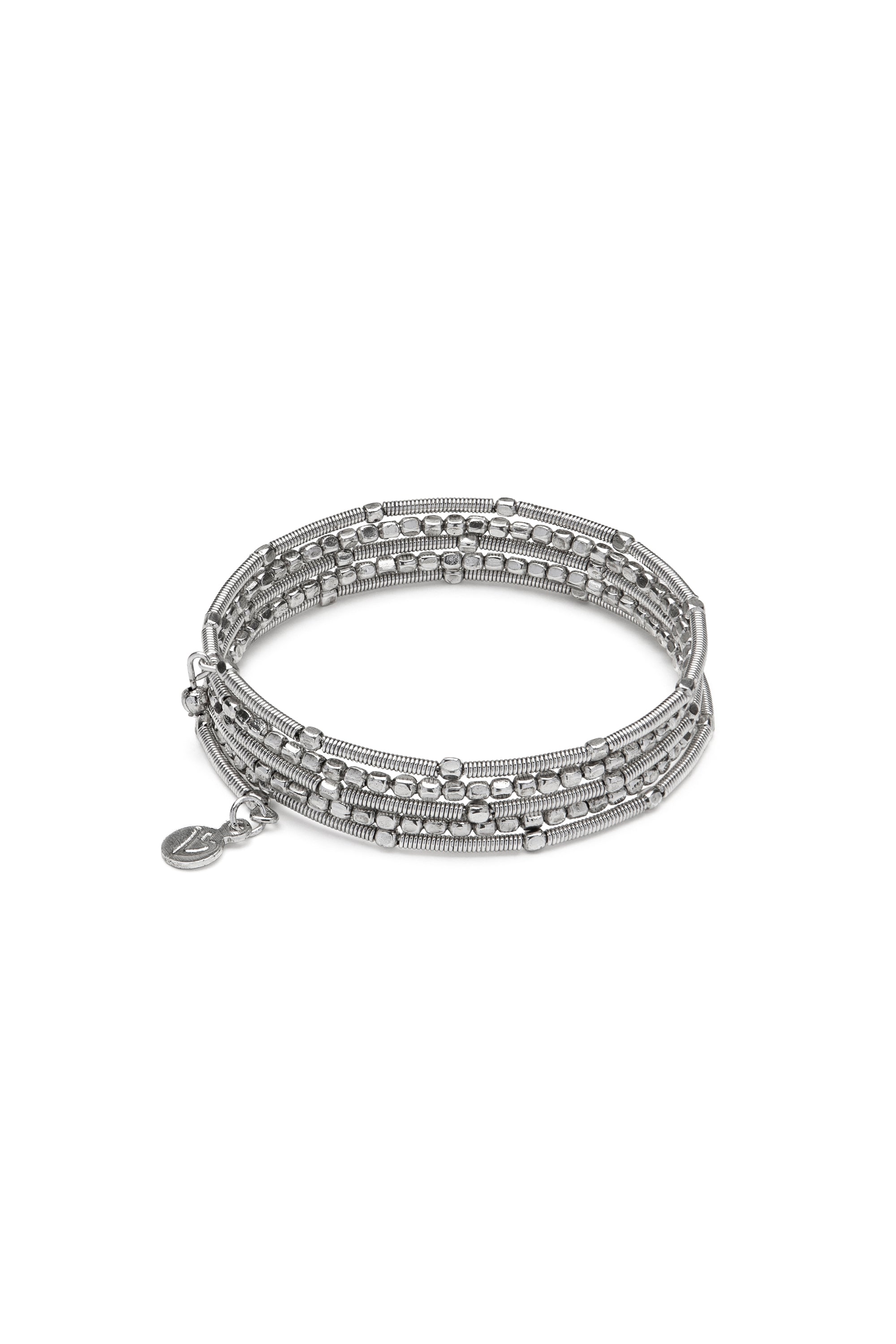Bracciale aperto molla composto da 5 linee. La texture è composta da un mix di elementi lineari e sferici. Modello regolabile. Crea il tuo mix di bracciali elastici abbinando modelli diversi, leggeri e comodi da indossare. Placcato in argento. Nickel tested. Gioielli fatti a mano, unici e artigianali, perfetti per tutti i tuoi look o come idea regalo.