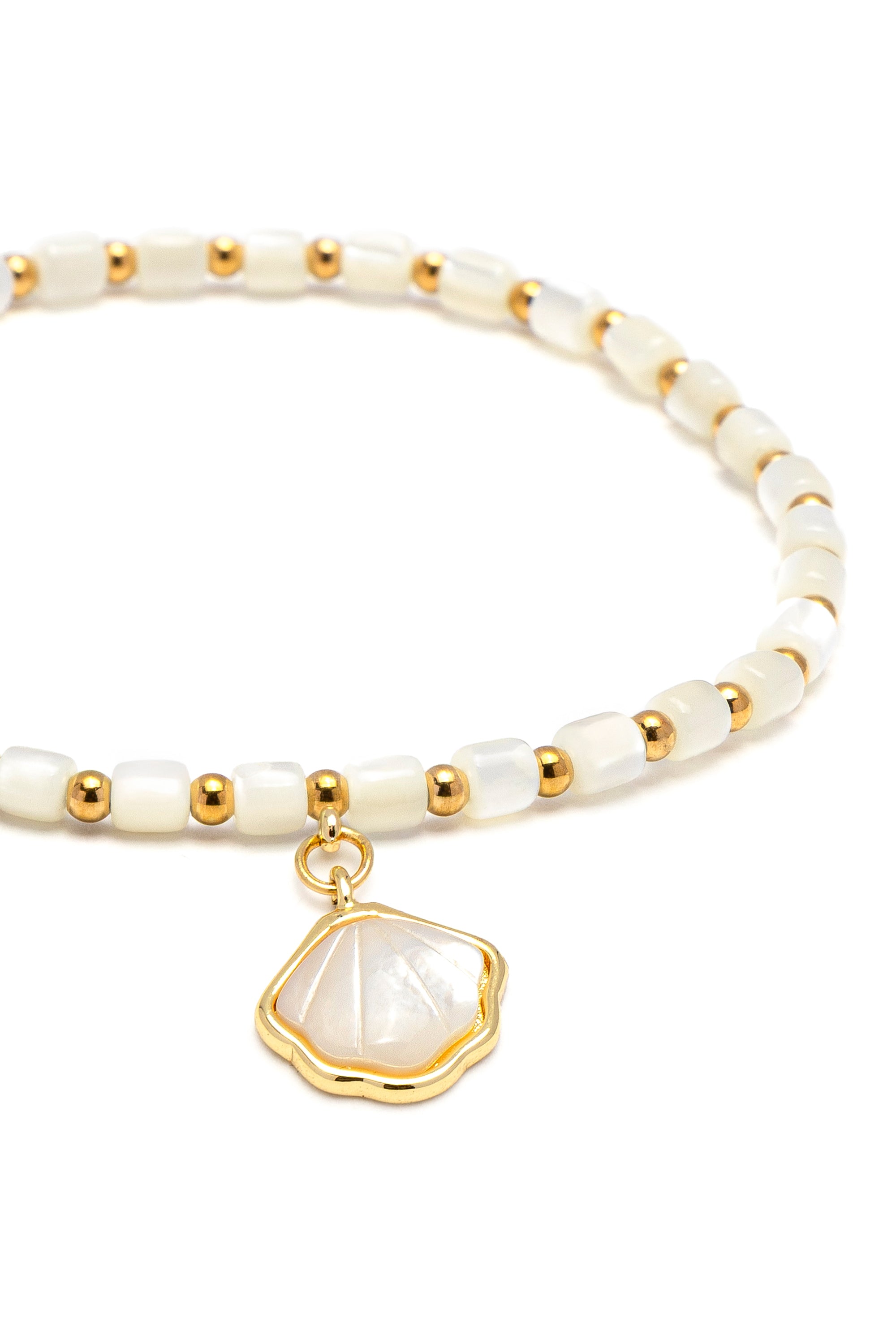 Bracciale elastico composto da piccoli cilindri in madreperla, intervallati da micro sfere dorate e impreziosito da un charm a forma di conchiglia in madreperla. Un modello fresco e versatile. Materiali: madreperla e elementi in acciaio placcato oro. Nickel tested.