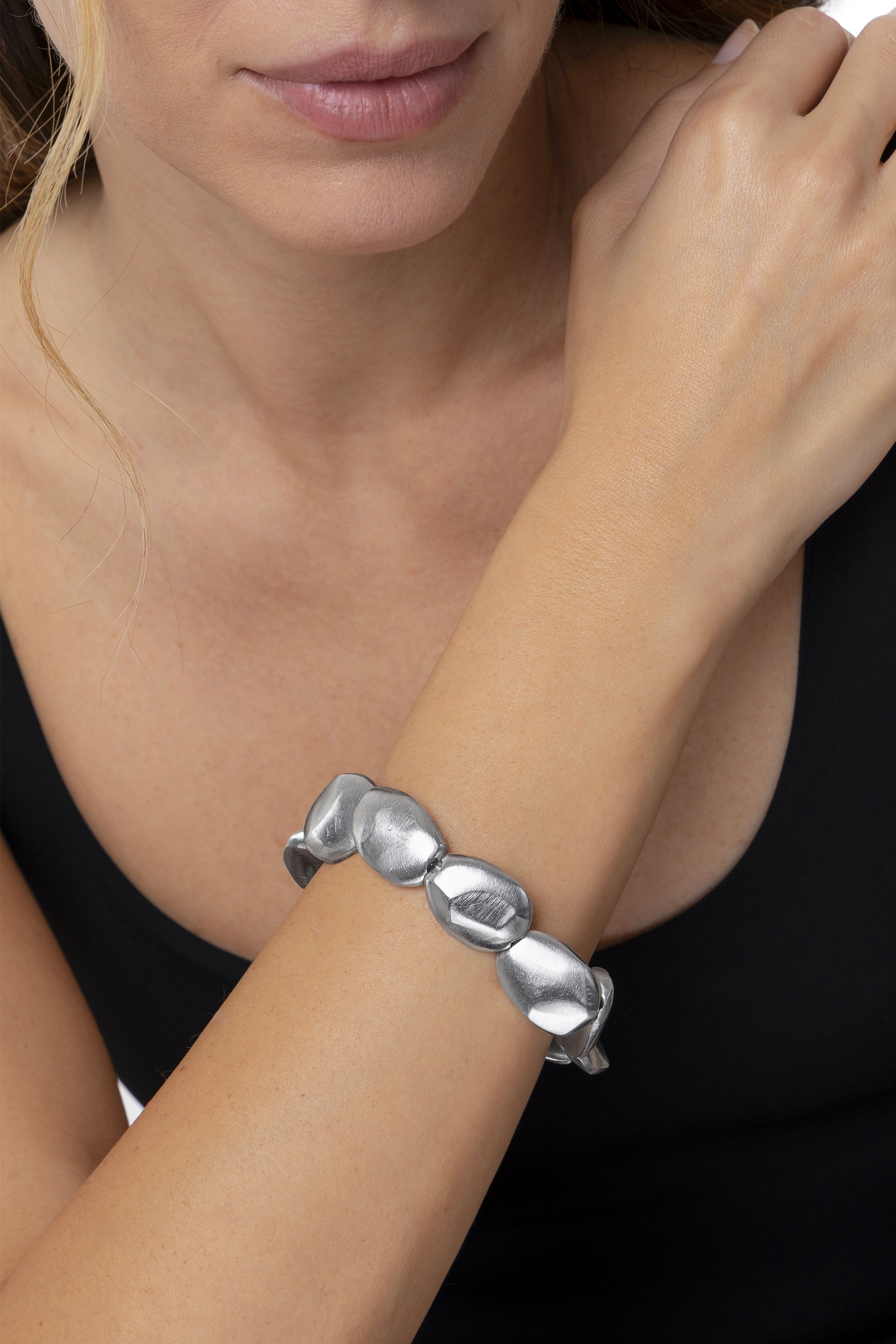Bracciale elastico composto da 10 elementi "stone shape" in alluminio 100% riciclato. Ogni elemento, unico nella sua irregolarit?, crea un effetto organico e materico, perfetto per un look casual chic quotidiano o come idea regalo. Handmade. Nickel tested.