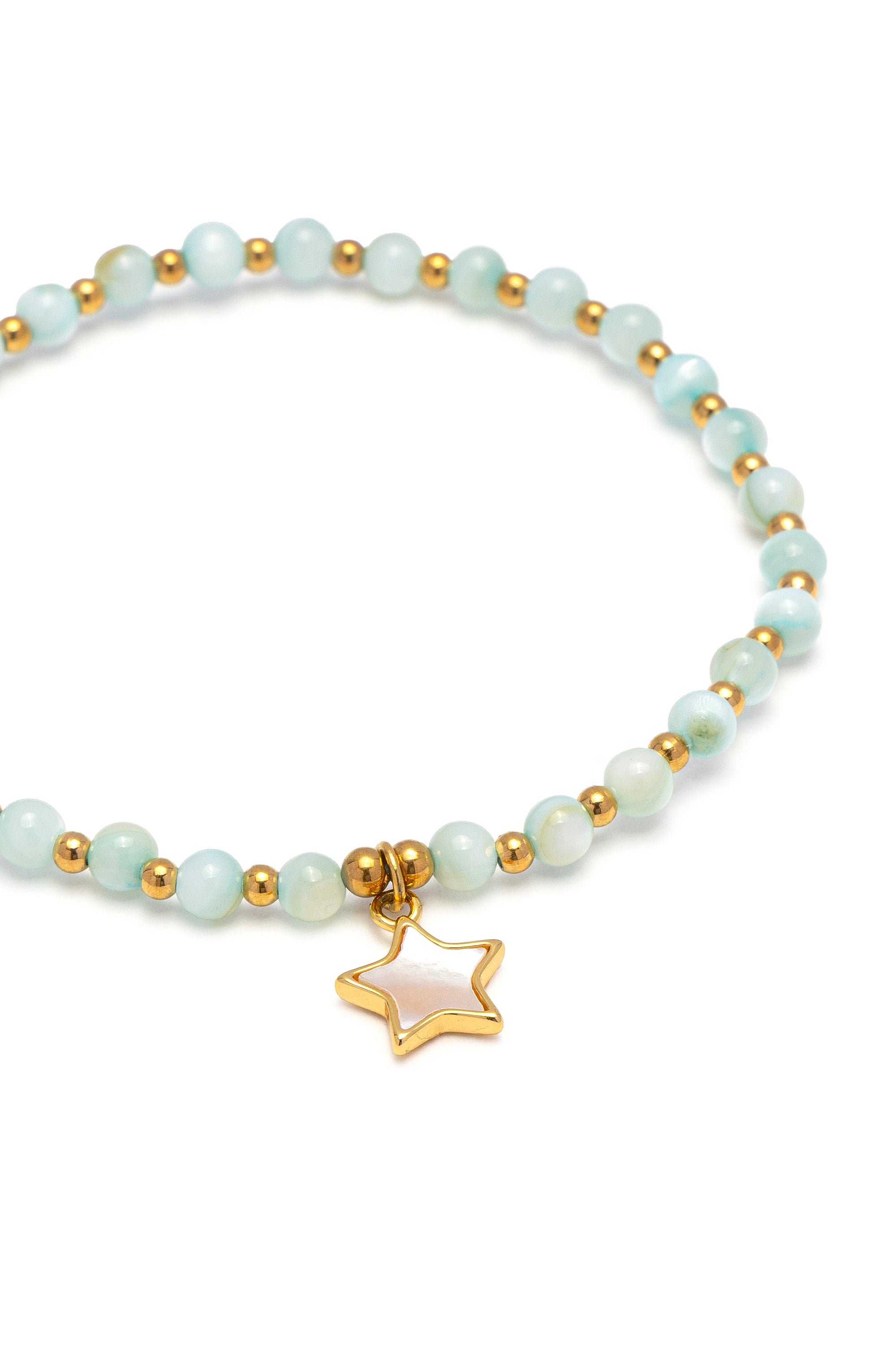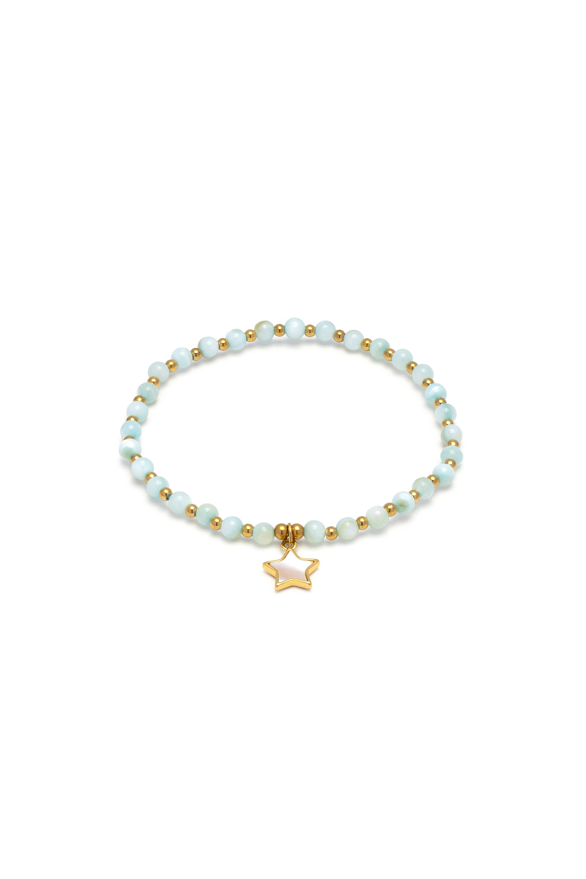 Bracciale elastico composto da sfere in madreperla azzurra e un charm a forma di stella. Un gioiello timeless dallo stile chic contemporaneo, perfetto come idea regalo. Materiali: madreperla e elementi in acciaio placcato oro. Nickel tested.