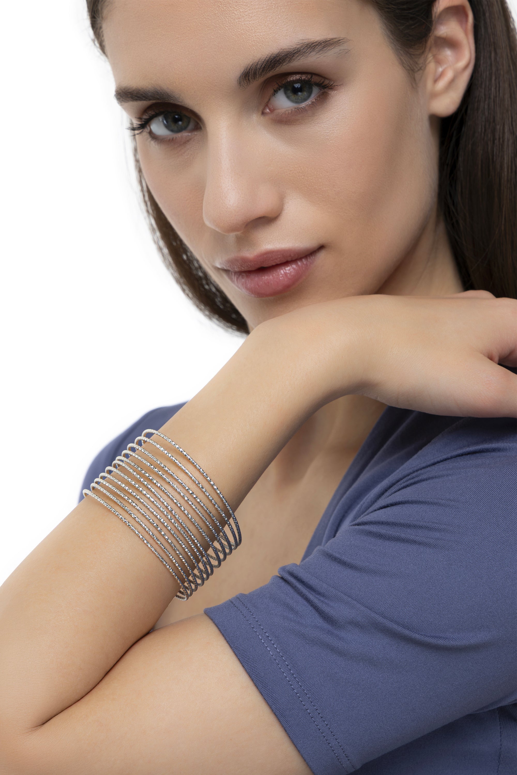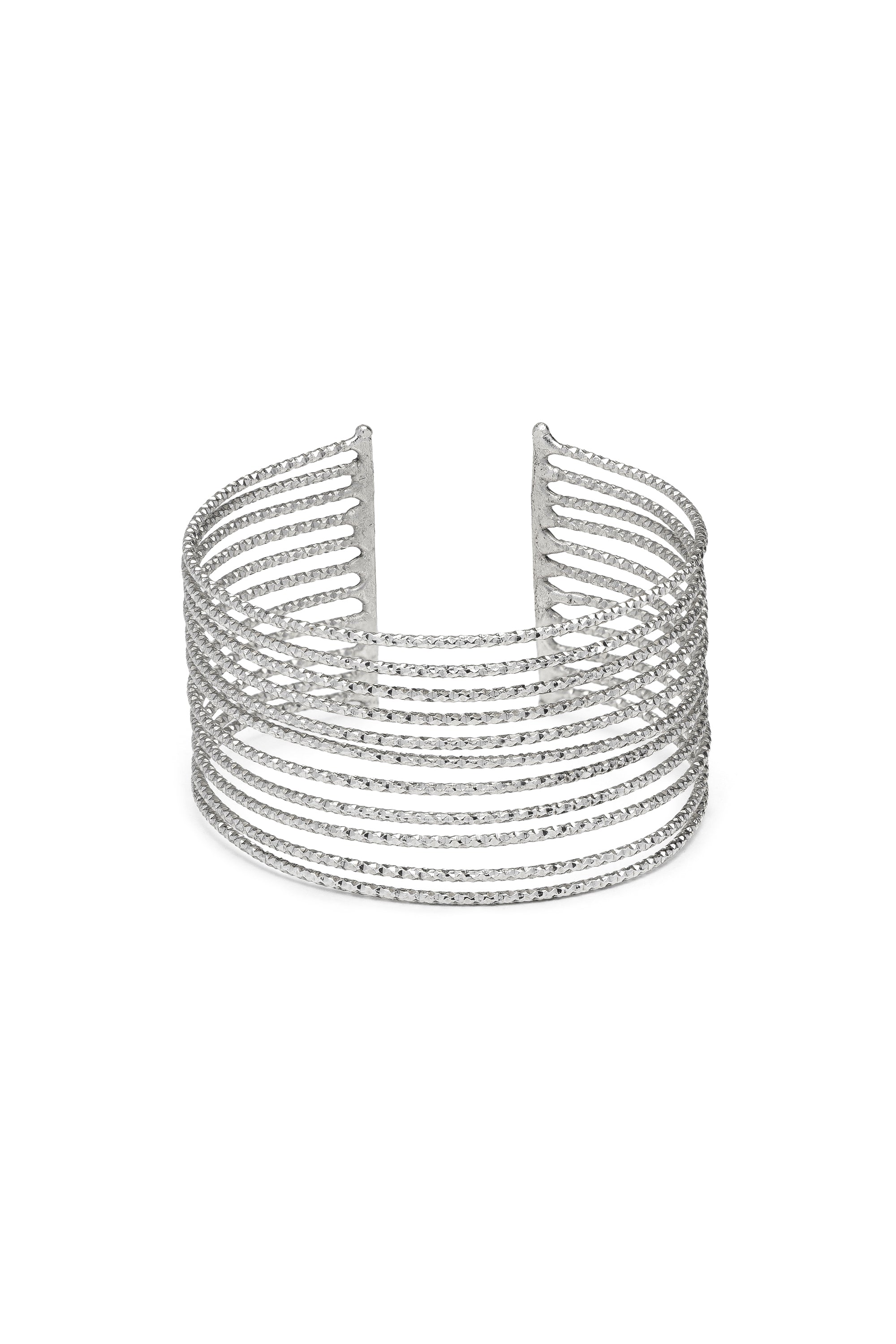 Bracciale a fascia semi rigida che si distingue per le undici linee rigide dalla finitura finemente lavorata che crea un effetto di luce continuo. La struttura aperta e avvolgente dona un tocco di eleganza, rendendolo l'accessorio perfetto per valorizzare i tuoi look serali. Un gioiello dal forte impatto visivo, ideale da indossare come pezzo statement. Placcatura argento. Nickel tested.