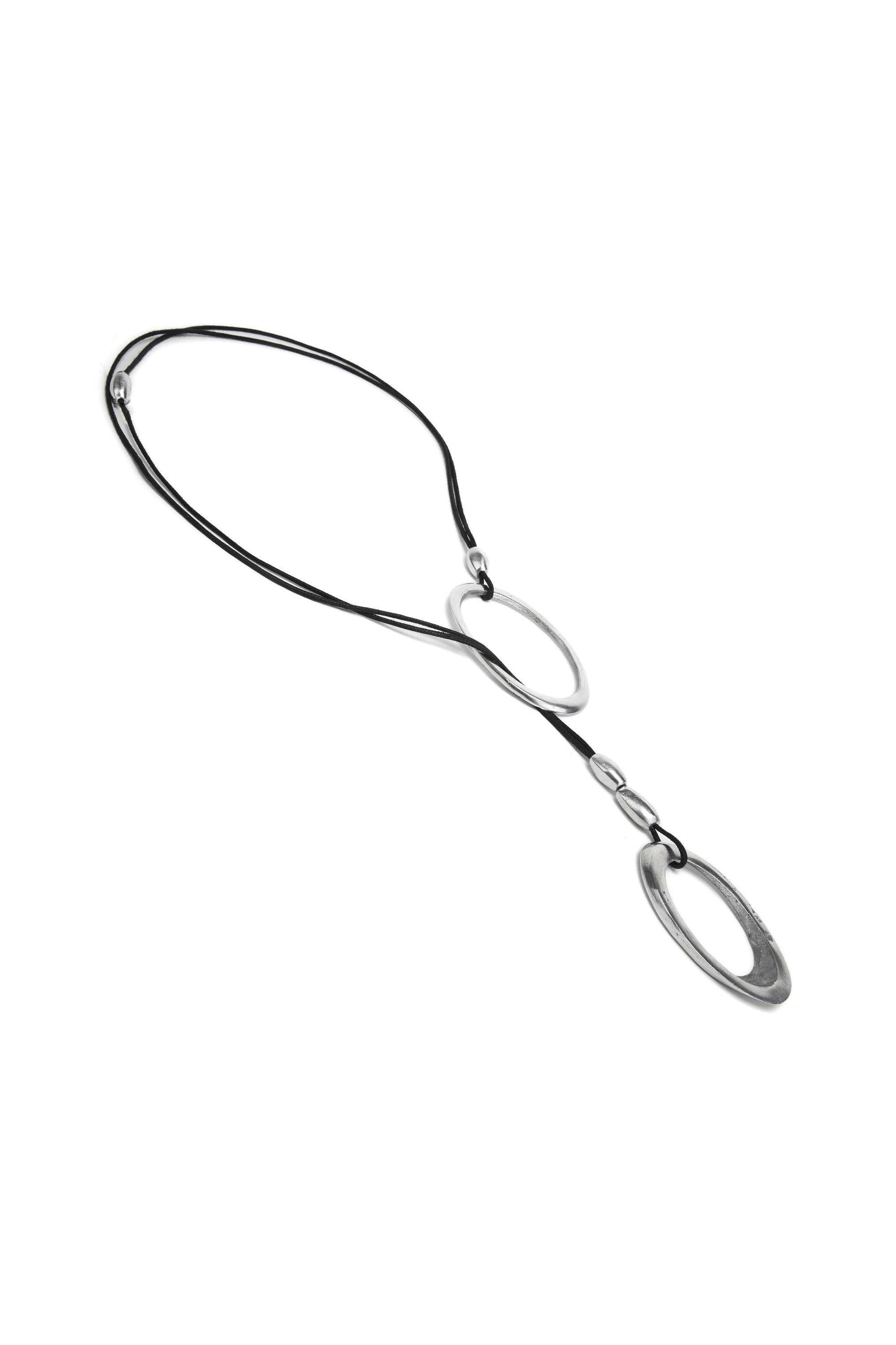 Collana in alluminio 100% riciclato composta da cordoncino nero con due ovali traforati in successione e piccoli elementi a oliva. Design a lariat asimmetrico. Ultraleggera e confortevole sulla pelle. Nickel tested. Lavorazione artigianale. Gioielli fatti a mano, unici e artigianali, perfetti per tutti i tuoi look o come idea regalo.