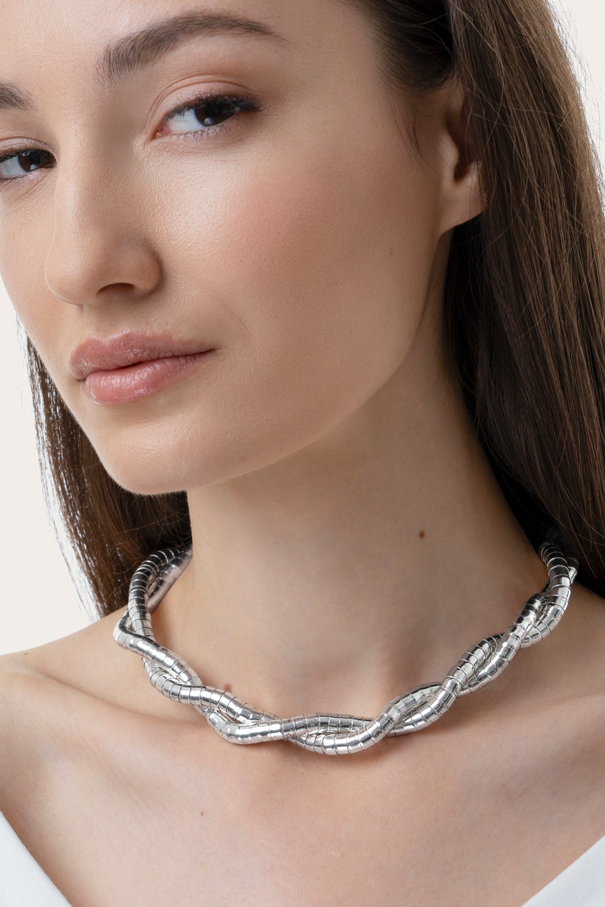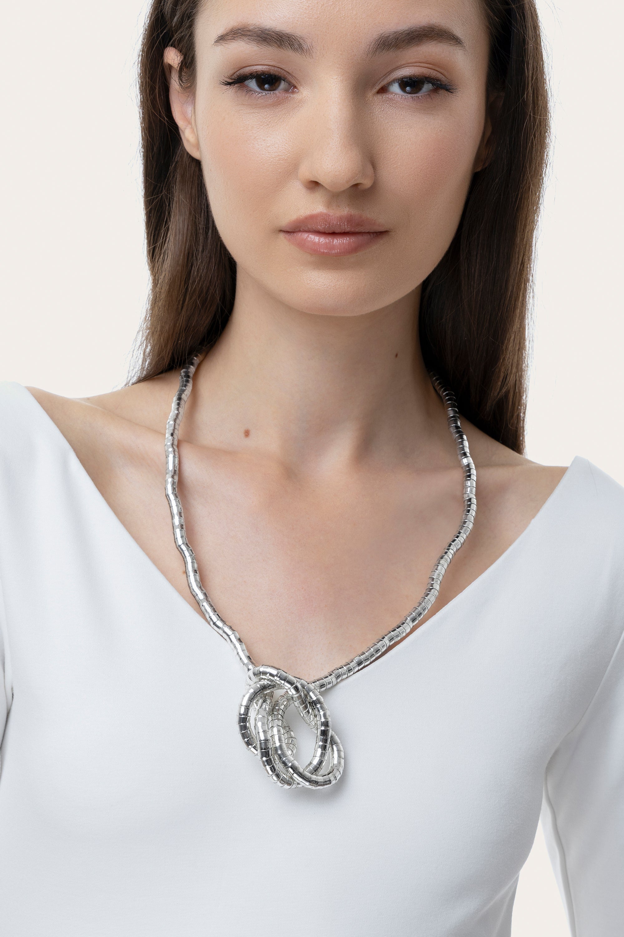 Bracciale o collana? Scegli tu come modellare questo gioiello di tendenza. La struttura sinuosa richiama la forma del serpente, valorizzata dalla texture brillante snake skin. Un accessorio immancabile nel tuo portagioie per occasioni speciali. Materiale: placcatura argento 100% artigianale. Nickel tested. Lavorazione artigianale. Gioielli fatti a mano, unici e artigianali, perfetti per tutti i tuoi look o come idea regalo.