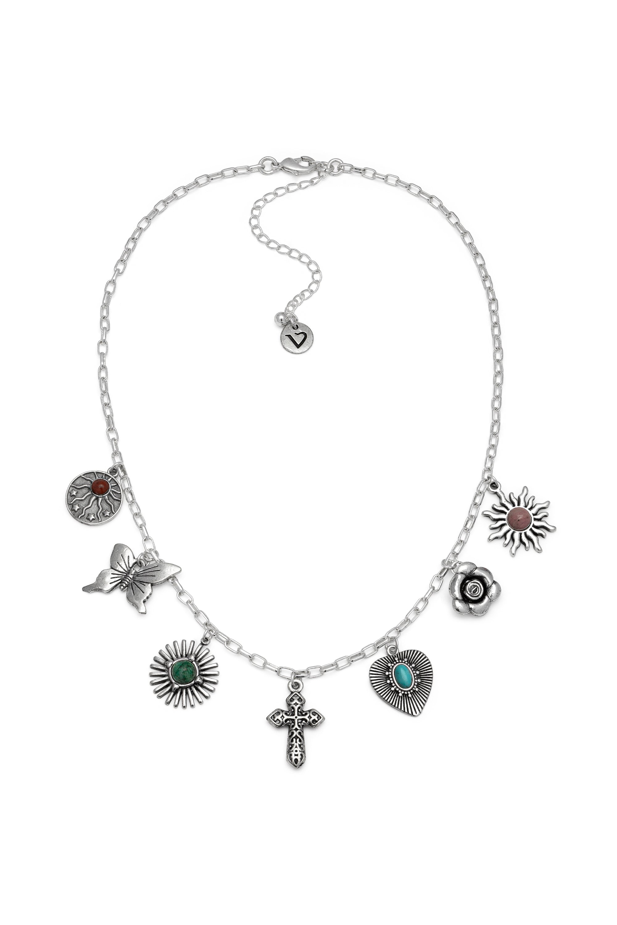 Collana placcata in argento mix charms natura. Chiusura regolabile con moschettone. Lunghezza collana 38 cm. Extra chain 8 cm. Placcatura 100% artigianale. Nickel tested. Lavorazione artigianale. Gioielli fatti a mano, unici e artigianali, perfetti per tutti i tuoi look o come idea regalo.