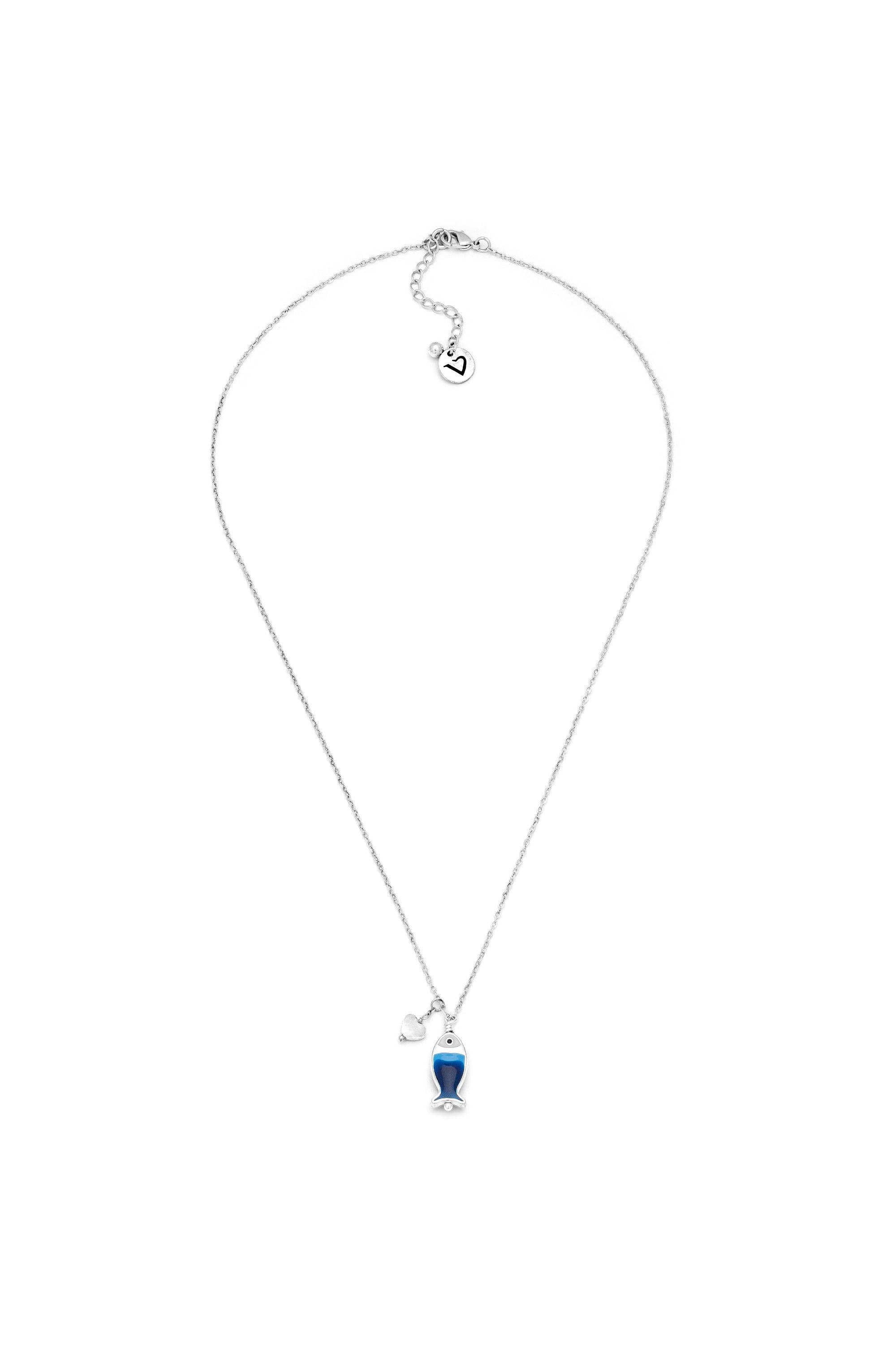 Collana con piccolo pendente a forma di pesce smaltato in blu, azzurro e bianco e un mini cuore argento. Uno stile perfetto per chi cerca un simbolo di libert? e per chi ama giocare con i volumi tramite l'arte del layering. Abbinala al "Bracciale Elastico Pendenti Pesci Blu". Lunghezza regolabile. Placcatura argento. Nickel tested.