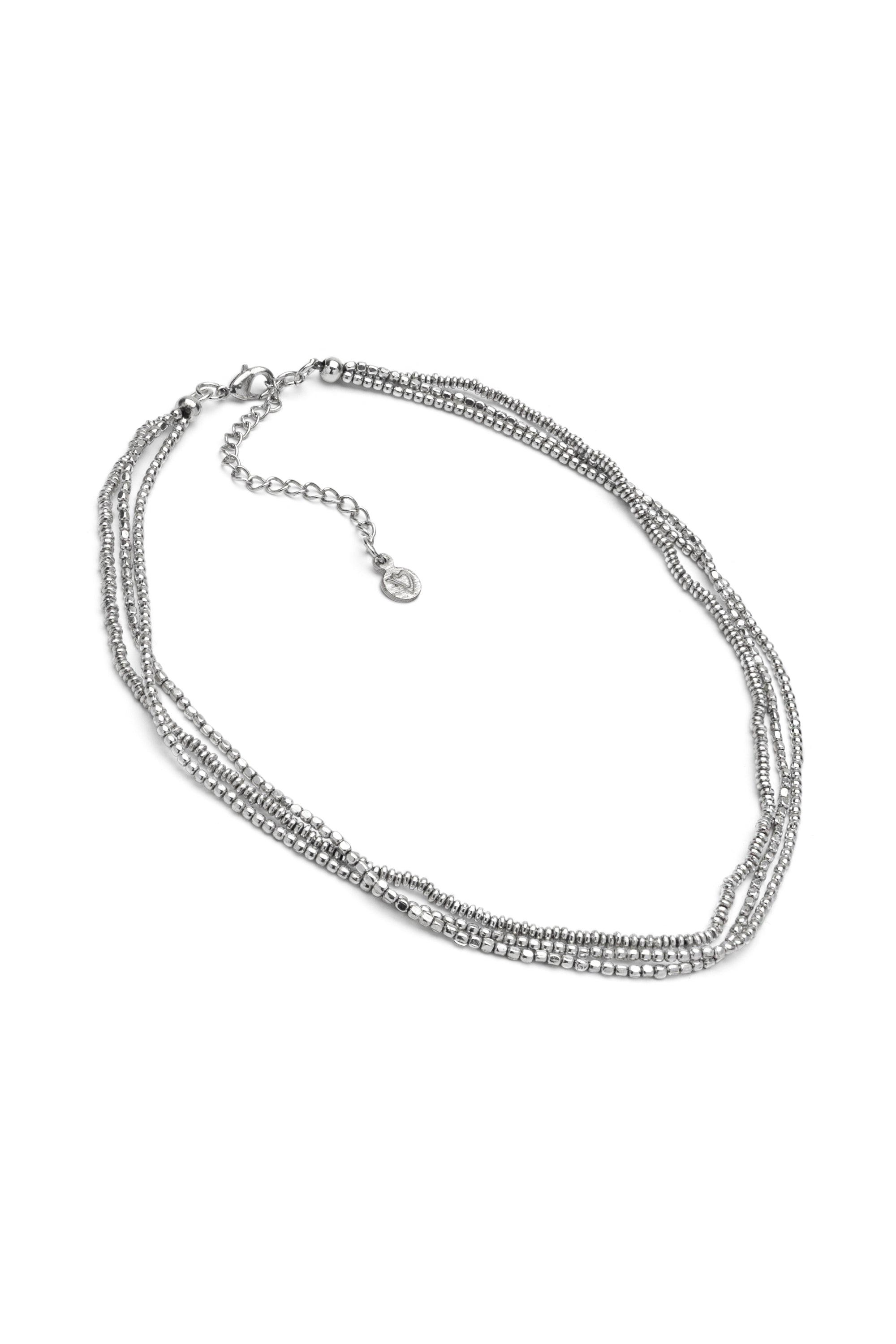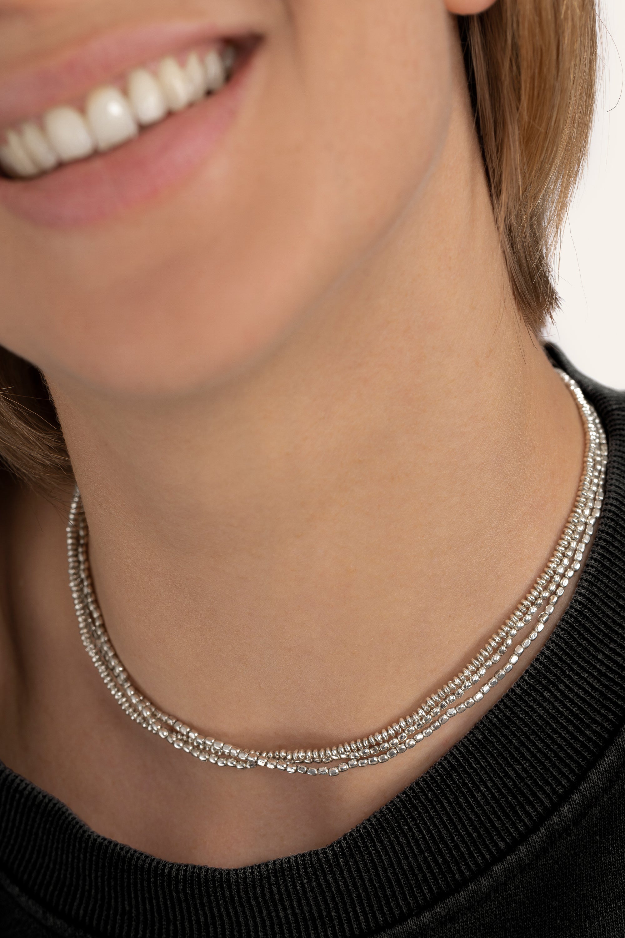 Bagliori a tre fili. Girocollo composto da tre catene sottili impreziosite da mini pepite irregolari e luminose che catturano la luce a ogni movimento. Un design leggero e versatile: indossalo da solo per un tocco brillante quotidiano o in layering con altre catene per un look più deciso. Chiusura regolabile con moschettone. Placcatura argento 100% artigianale. Nickel tested. Lavorazione artigianale. Gioielli fatti a mano, unici e artigianali, perfetti per tutti i tuoi look o come idea regalo.