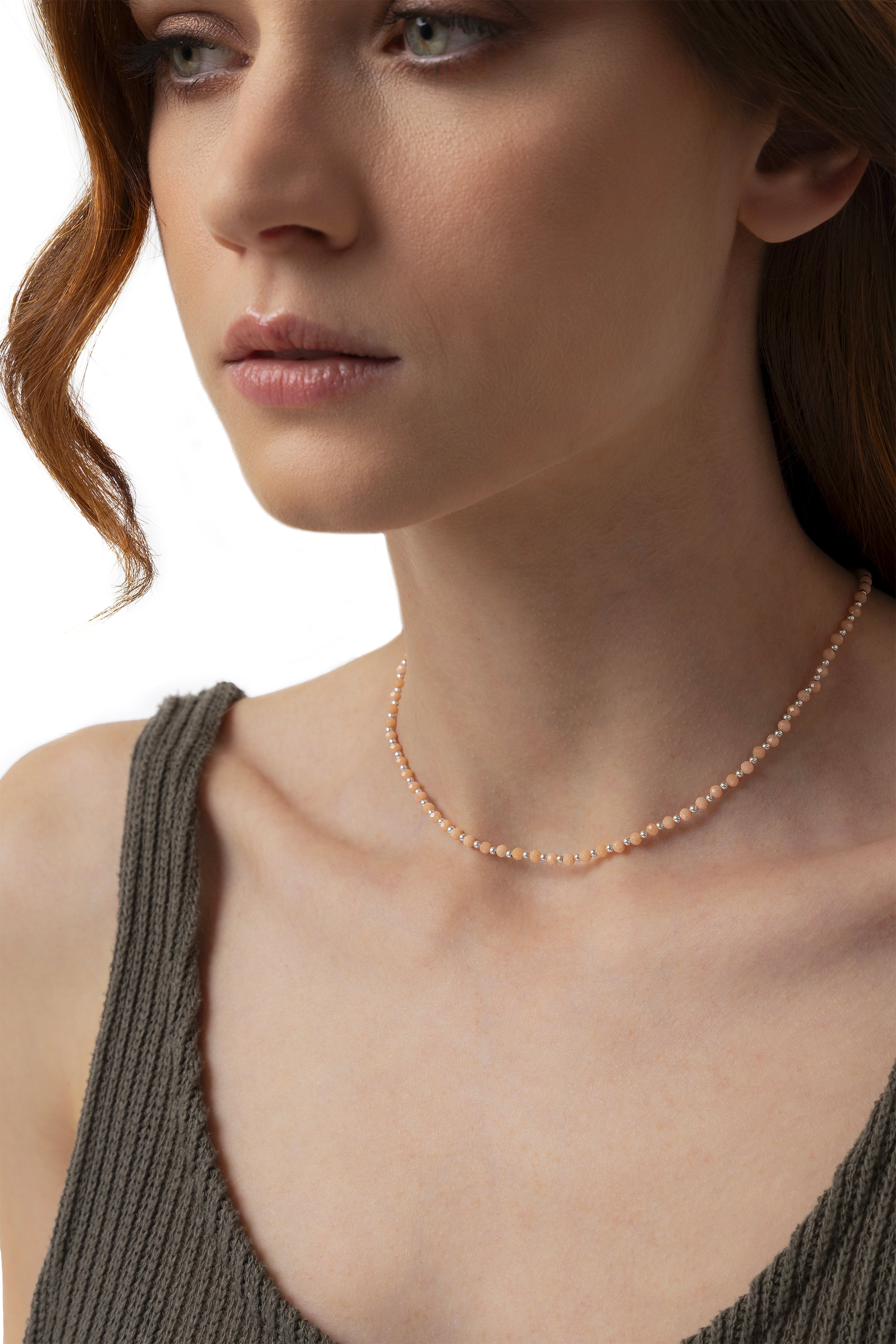 Girocollo composto da una sequenza di piccole pietre Cat Eye color rosa tenue. Un design pulito e fresco, perfetto per chi cerca un gioiello versatile e raffinato. Crea un look elegante abbinandolo al set "Bracciali Elastici Pietre Rosa". Lunghezza regolabile. Pietre vere e placcatura argento. Nickel tested.