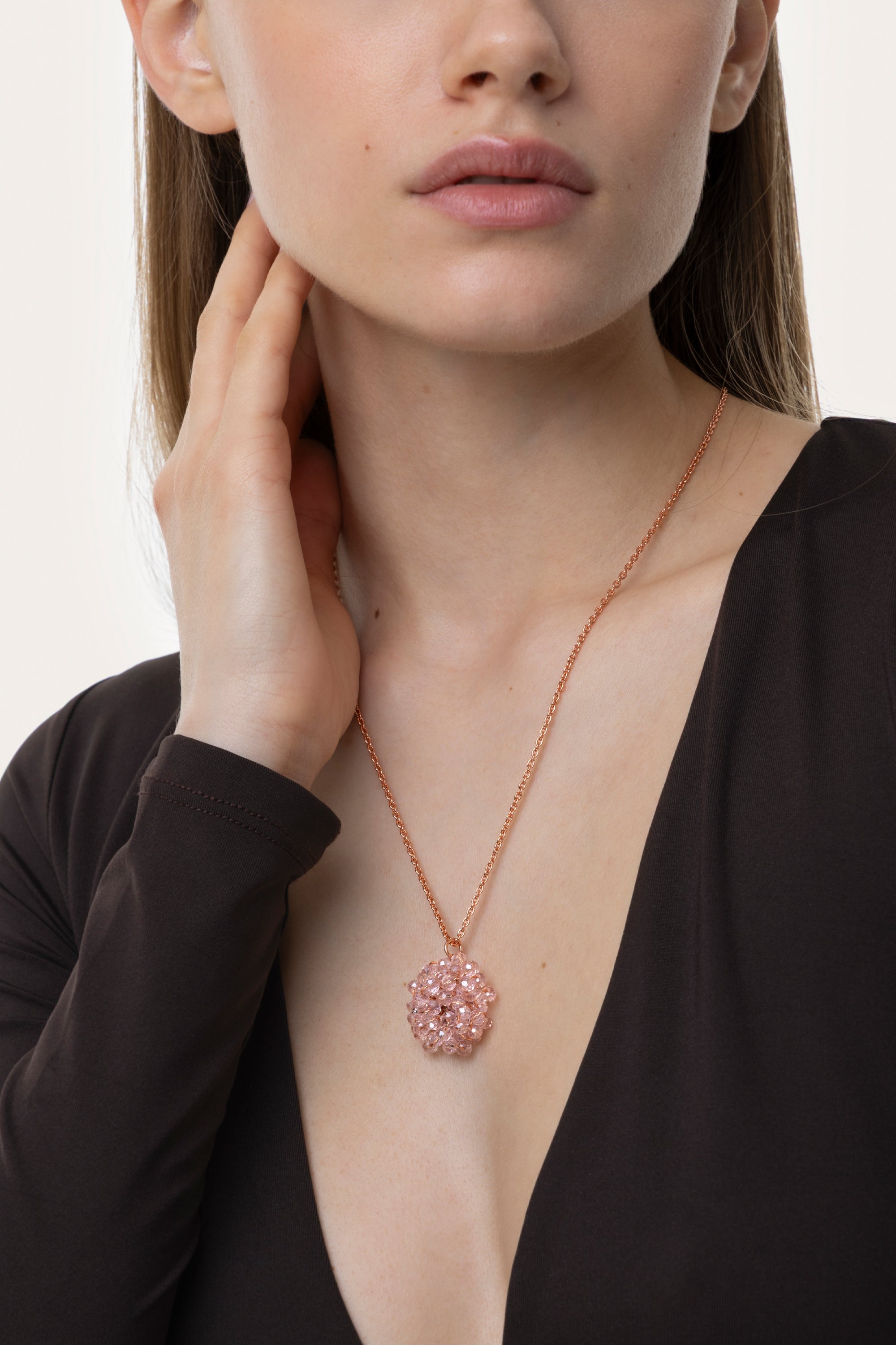 Questo pendente copper plated si distingue per la lavorazione diamond cut wire che rende il cristallo rosa tridimensionale e iconico. Un gioiello da indossare come pezzo unico sul tuo outfit preferito, casual o elegante. Lunghezza collana 50 cm. Extra chain: 6,5 cm. Gioielli fatti a mano, unici e artigianali, perfetti per tutti i tuoi look o come idea regalo. Nickel tested.