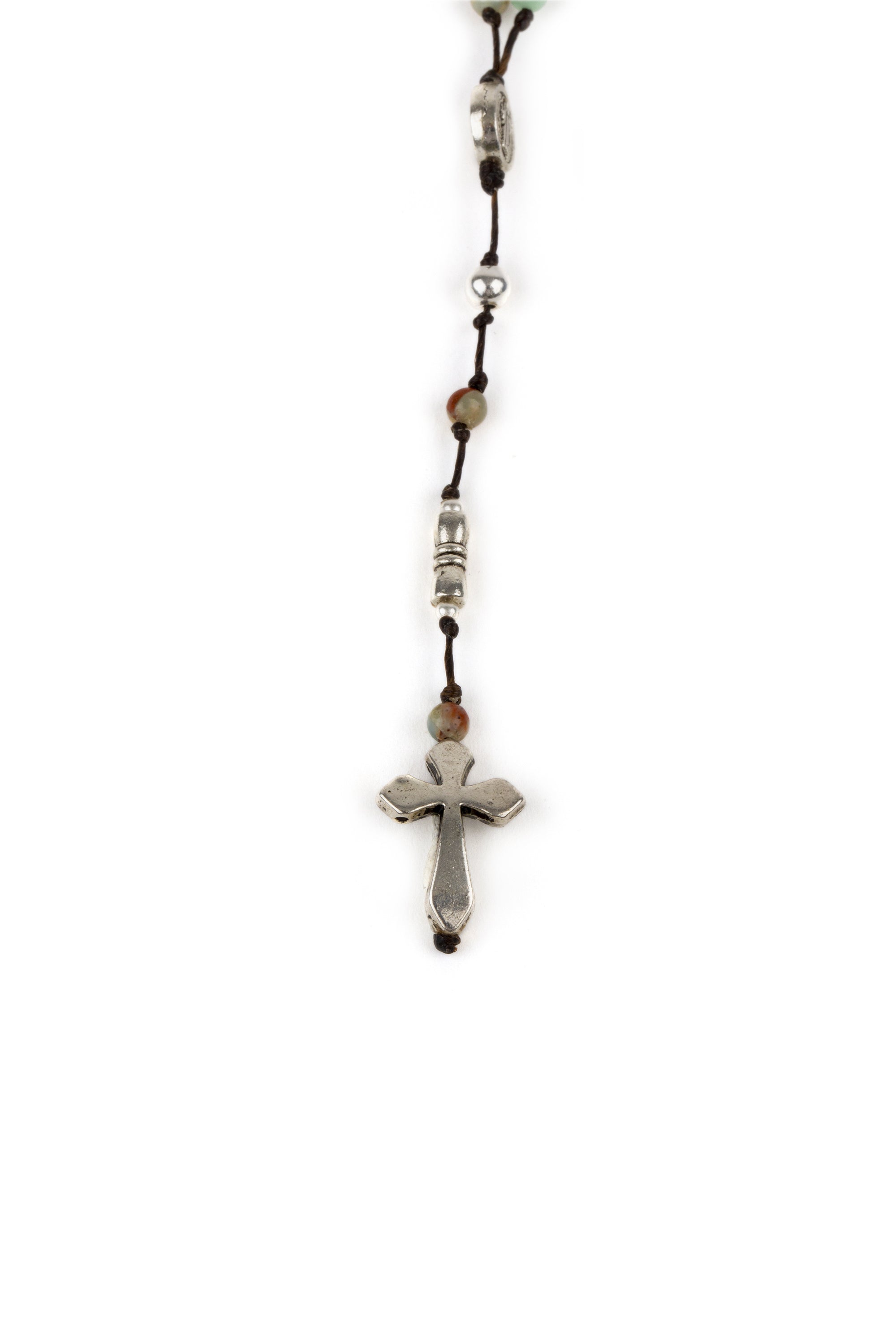 Rosario corda con inserti agalmatolite, elementi placcati in argento. Lavorazione artigianale. Nickel tested.
