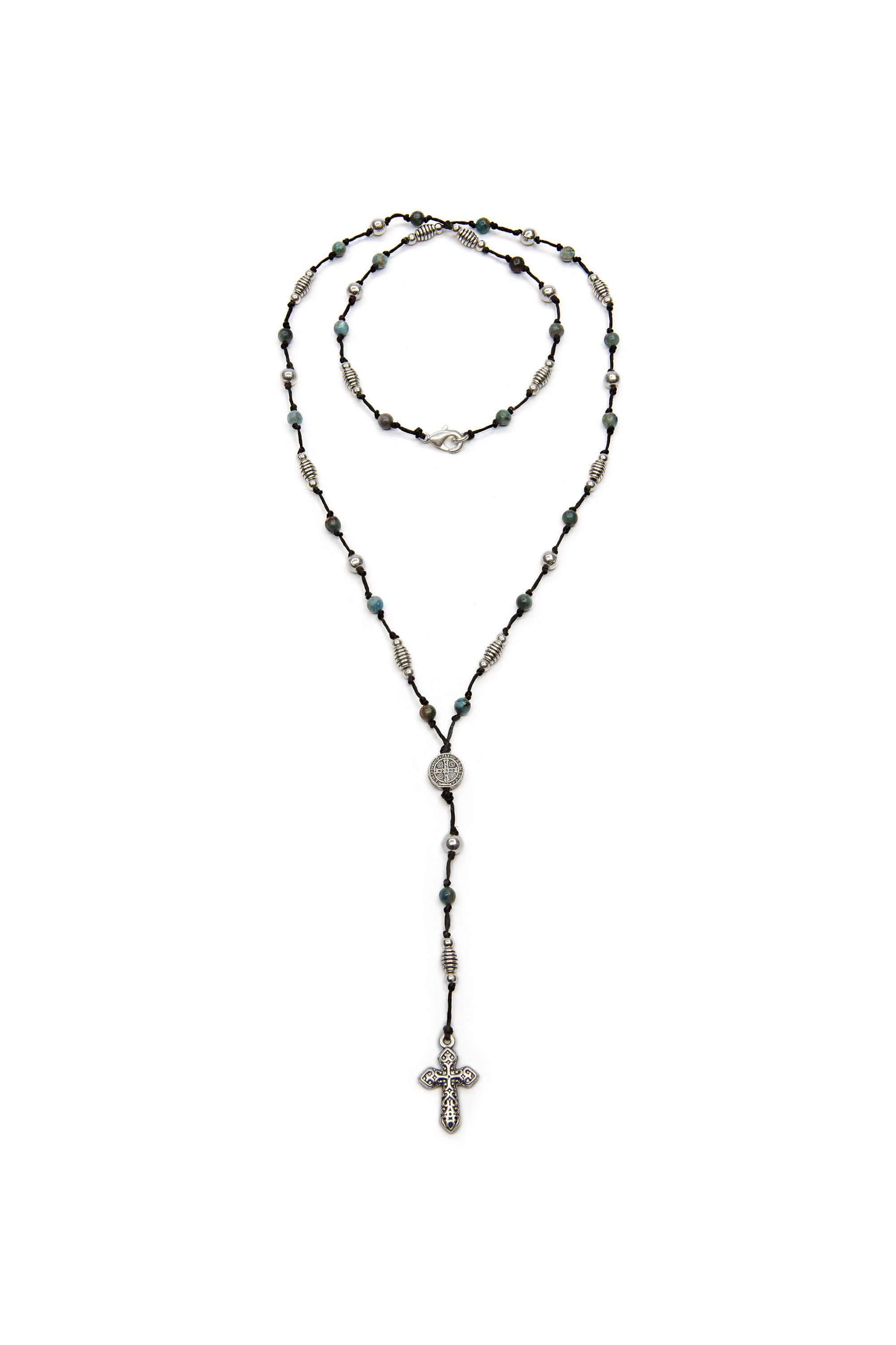 Collana rosario con sfere in pietra di apatite blu, elementi placcati in argento e pendente croce. Chiusura moschettone. Nickel tested. Lavorazione artigianale. Gioielli fatti a mano, unici e artigianali, perfetti per tutti i tuoi look o come idea regalo.