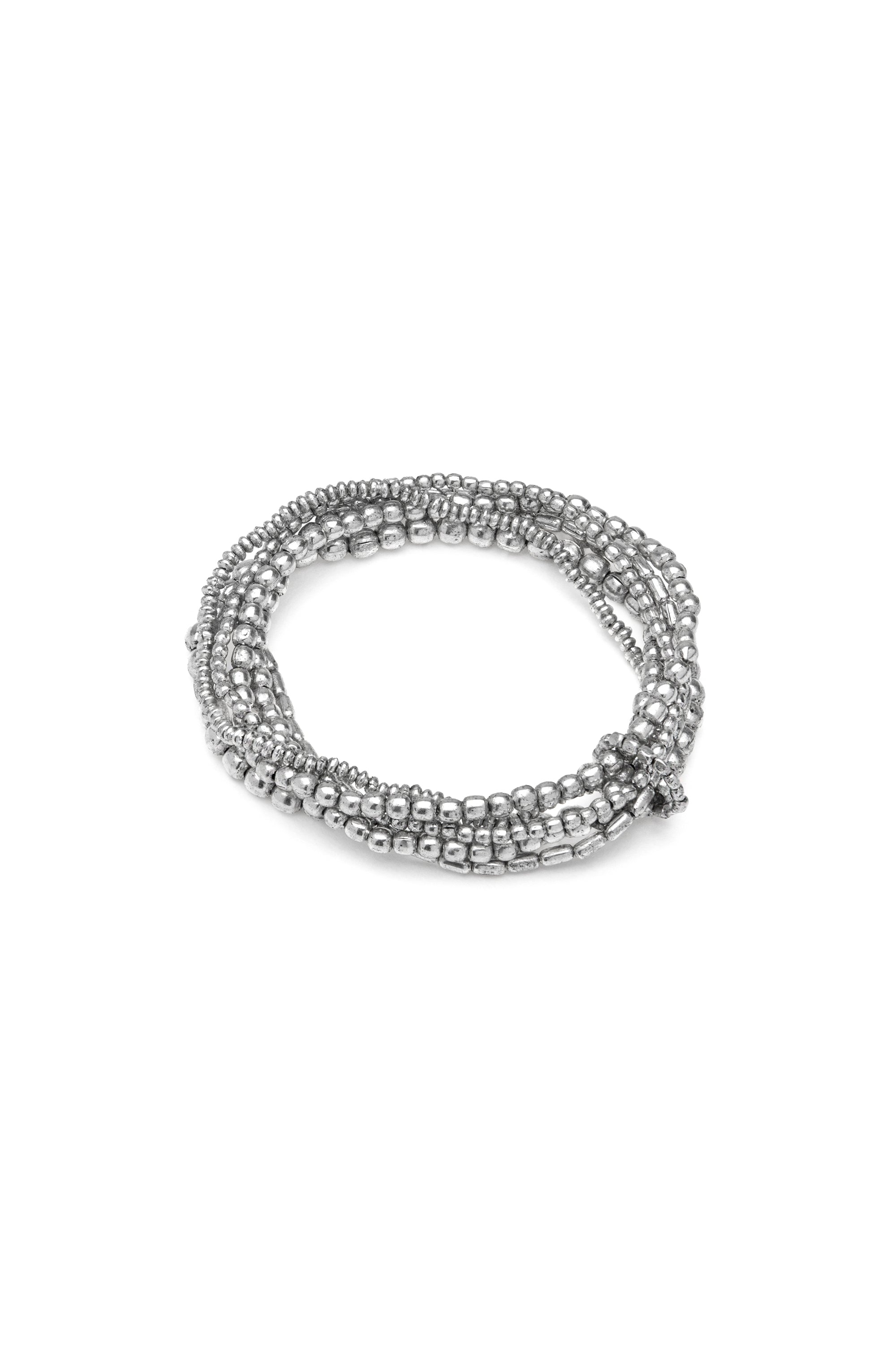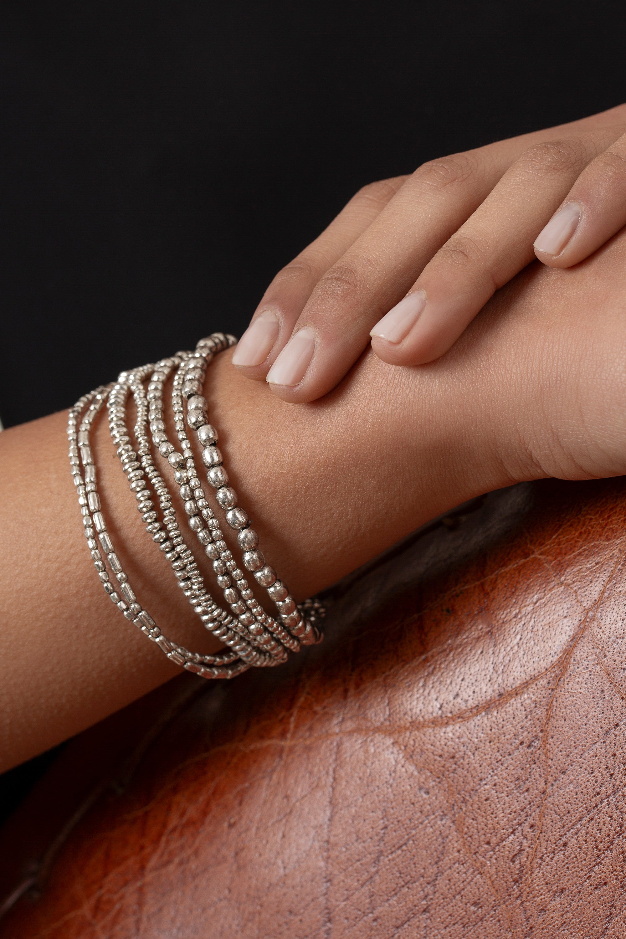 Effetto stack immediato. Avvolgente a 6 giri con mix di boule piccole e medie dal finish lucido e irregolare: crea volume in un gesto e illumina subito il polso. Da solo è protagonista, con altri bracciali diventa super cool. Modello elastico. Placcatura argento 100% artigianale. Nickel tested. Lavorazione artigianale. Gioielli fatti a mano, unici e artigianali, perfetti per tutti i tuoi look o come idea regalo.