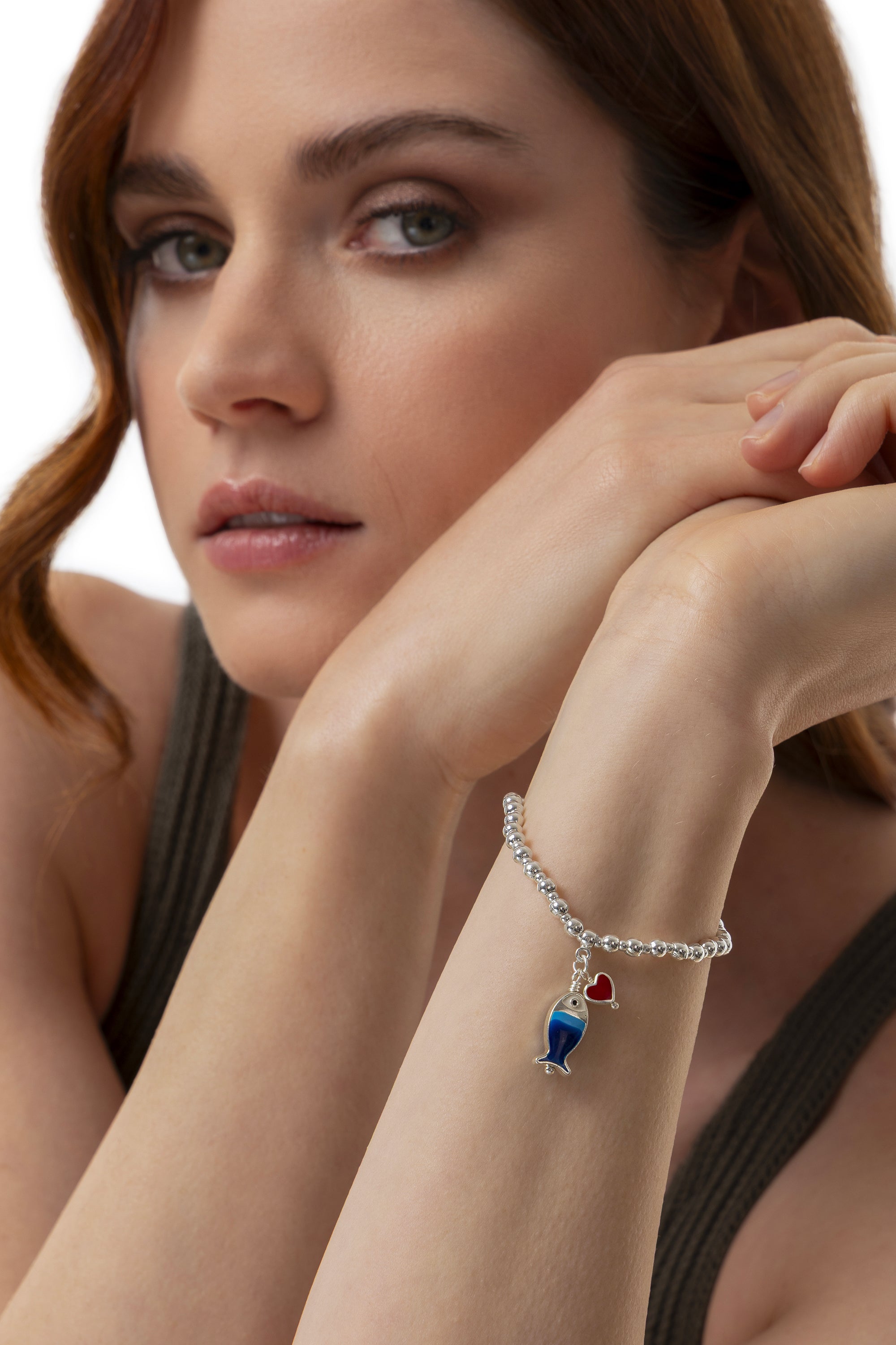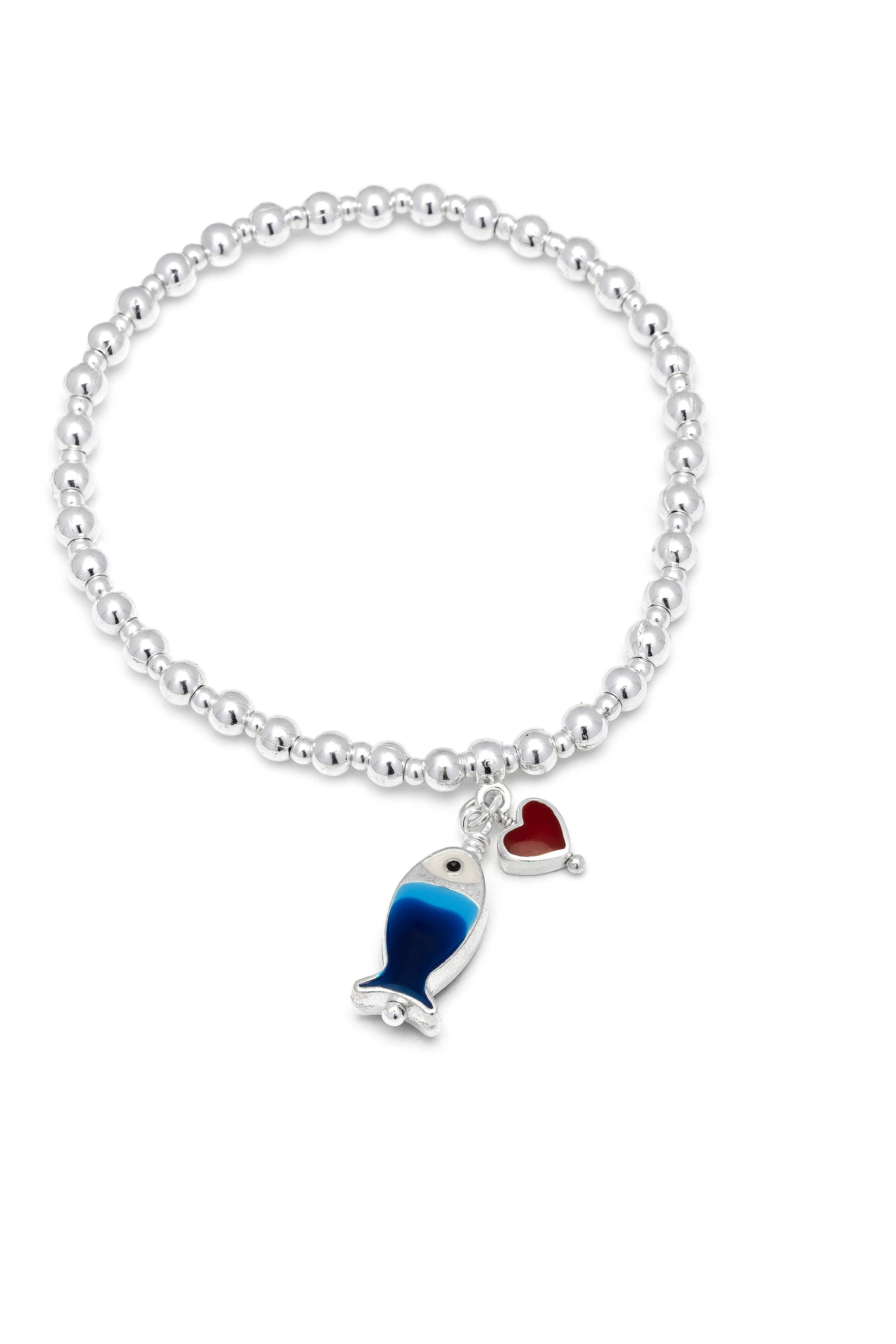 Il classico bracciale a sfere si rinnova con un tocco di colore: un pendente a forma di pesciolino smaltato blu accompagnato da un piccolo cuore rosso. Un accessorio giovane e fresco, perfetto per personalizzare il proprio stile con un simbolo di libert?. Placcatura argento. Nickel tested.