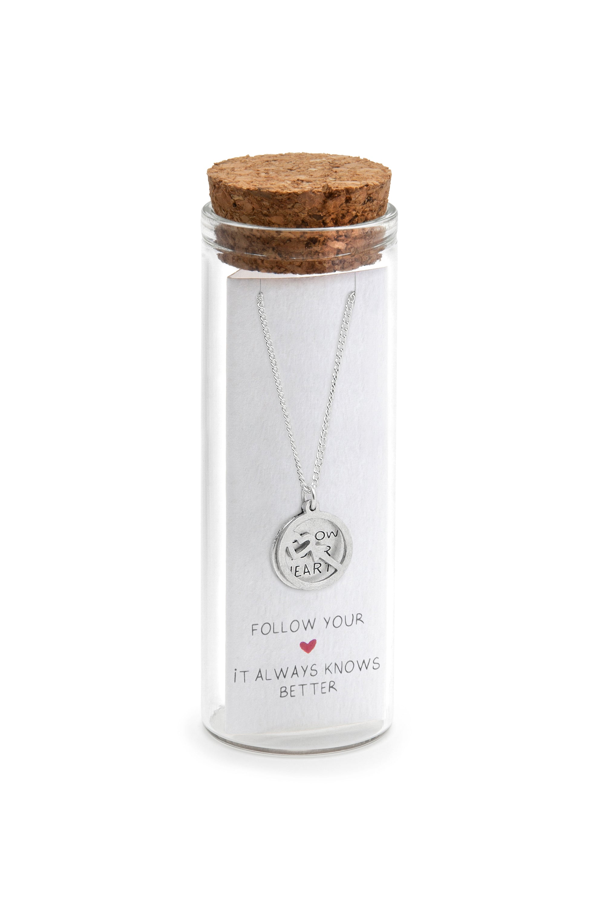 Un gioiello fatto a mano da regalare e regalarsi. Collana placcata in argento forma Follow Your Heart. Ogni bijoux è inserito in una iconica glass bottle e caratterizzato da una dedica divertente e piena d'affetto. Nickel tested. Lavorazione artigianale.