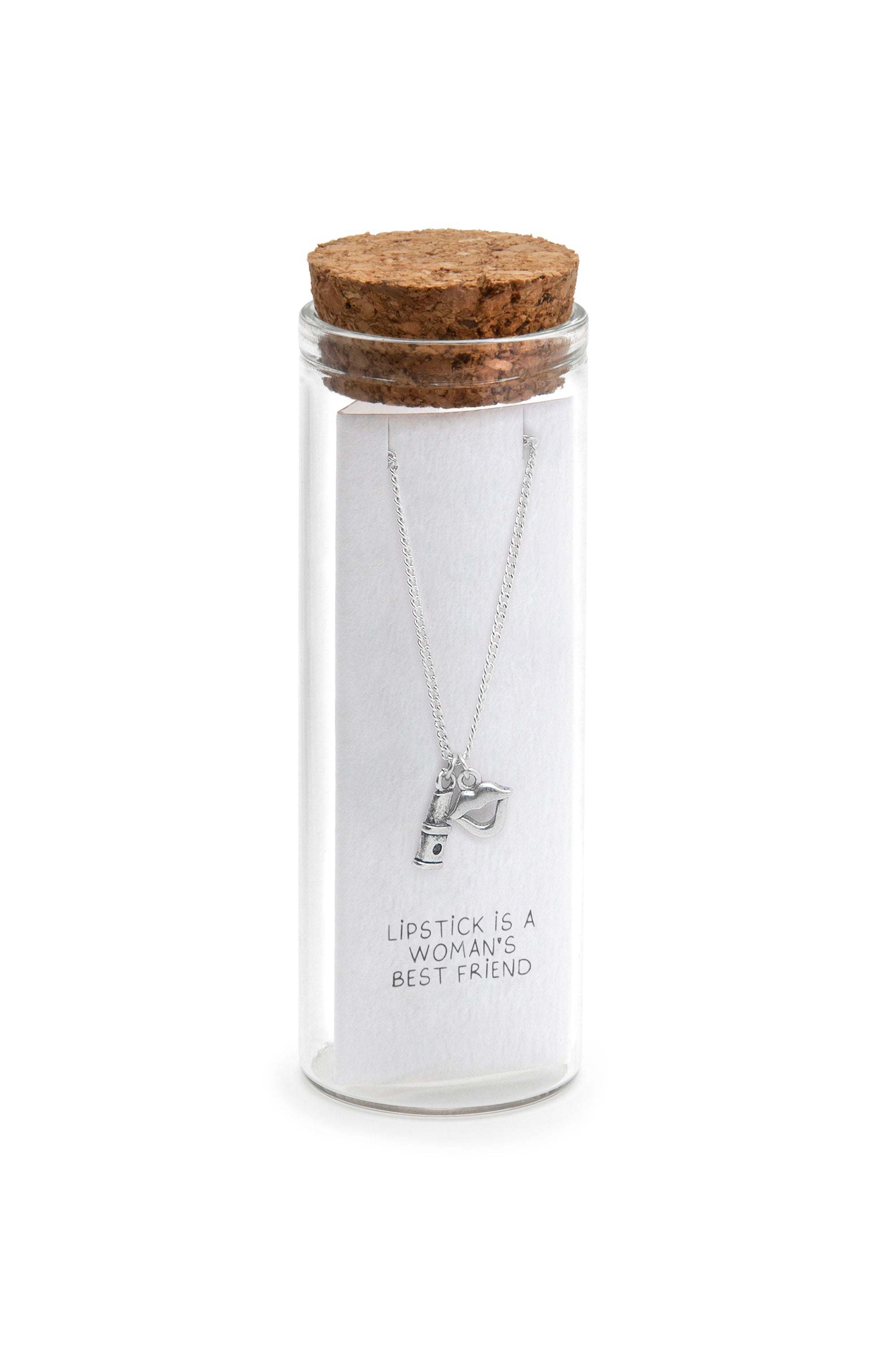 Un gioiello da regalare e regalarsi. Collana placcata in argento forma make up. Ogni bijoux è inserito in una iconica glass bottle e caratterizzato da una dedica divertente e piena d'affetto. Nickel tested. Lavorazione artigianale.