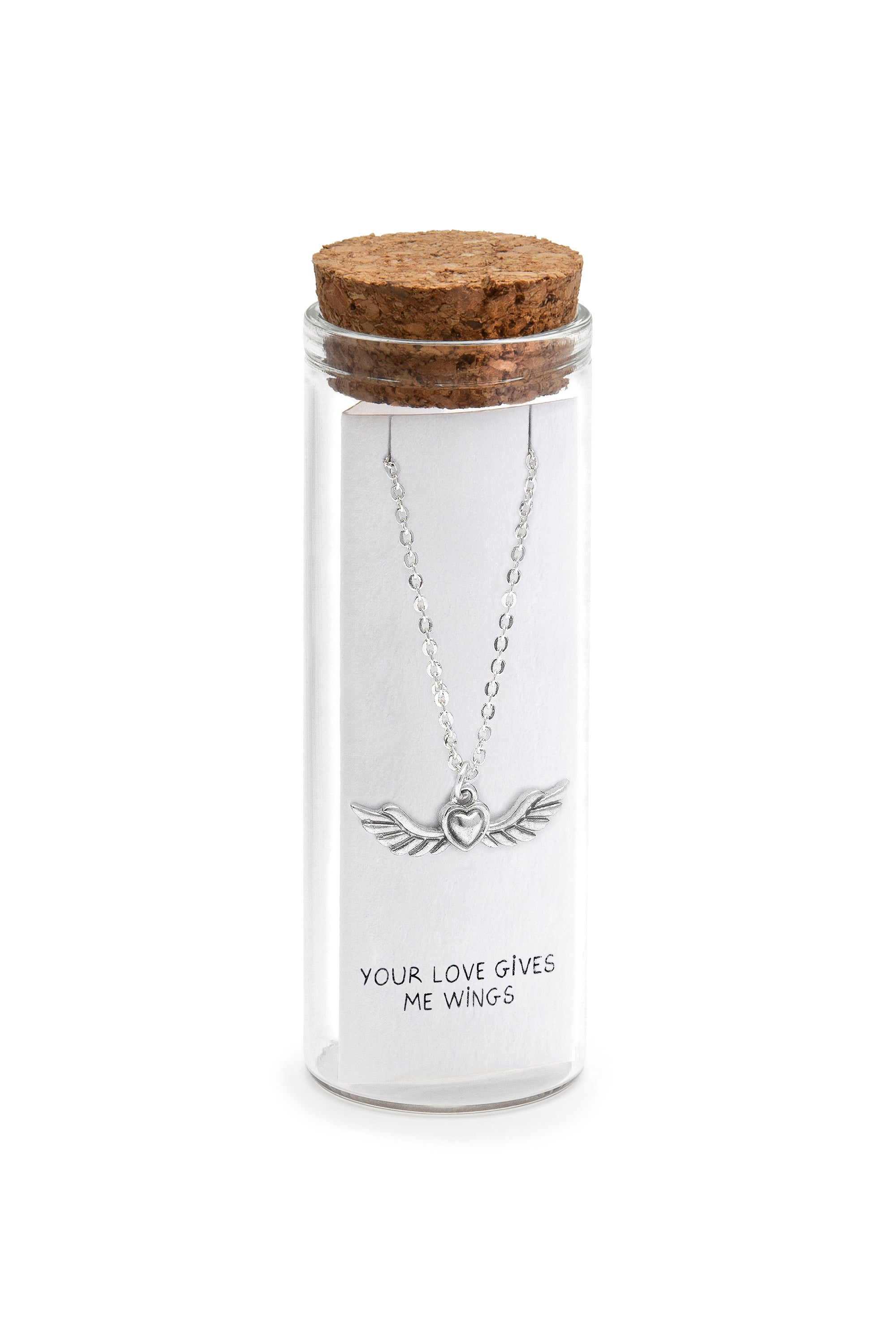 Il gioiello perfetto da regalare e regalarsi. Collana placcata in argento in argento a forma di ali con dedica Your Love Gives Me Wings. Le collane sono inserite in una iconica glass bottle e caratterizzati da una dedica funny vibes e piena d'affetto: un'idea Gift-Ready facile e originale. Chiusura a moschettone. Nickel tested. Lavorazione artigianale.