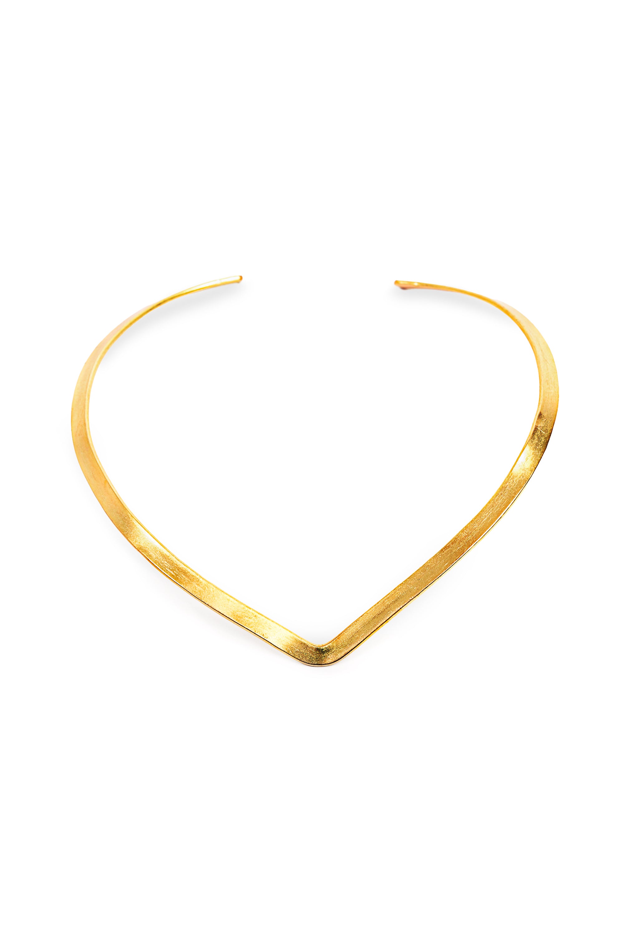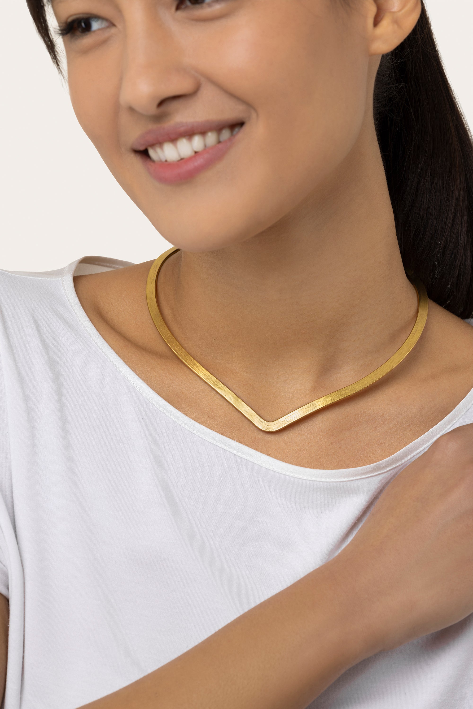 Girocollo essenziale e grafico, realizzato a mano in ottone riciclato. La banda leggermente affusolata disegna una V morbida che slancia il décolleté e illumina il viso con riflessi pieni. Leggero e versatile, accompagna i look day-to-night: perfetto su camicie, scolli a V e abiti semplici per un tocco deciso ma raffinato. Nickel tested. Lavorazione artigianale. Gioielli fatti a mano, unici e artigianali, perfetti per tutti i tuoi look o come idea regalo.