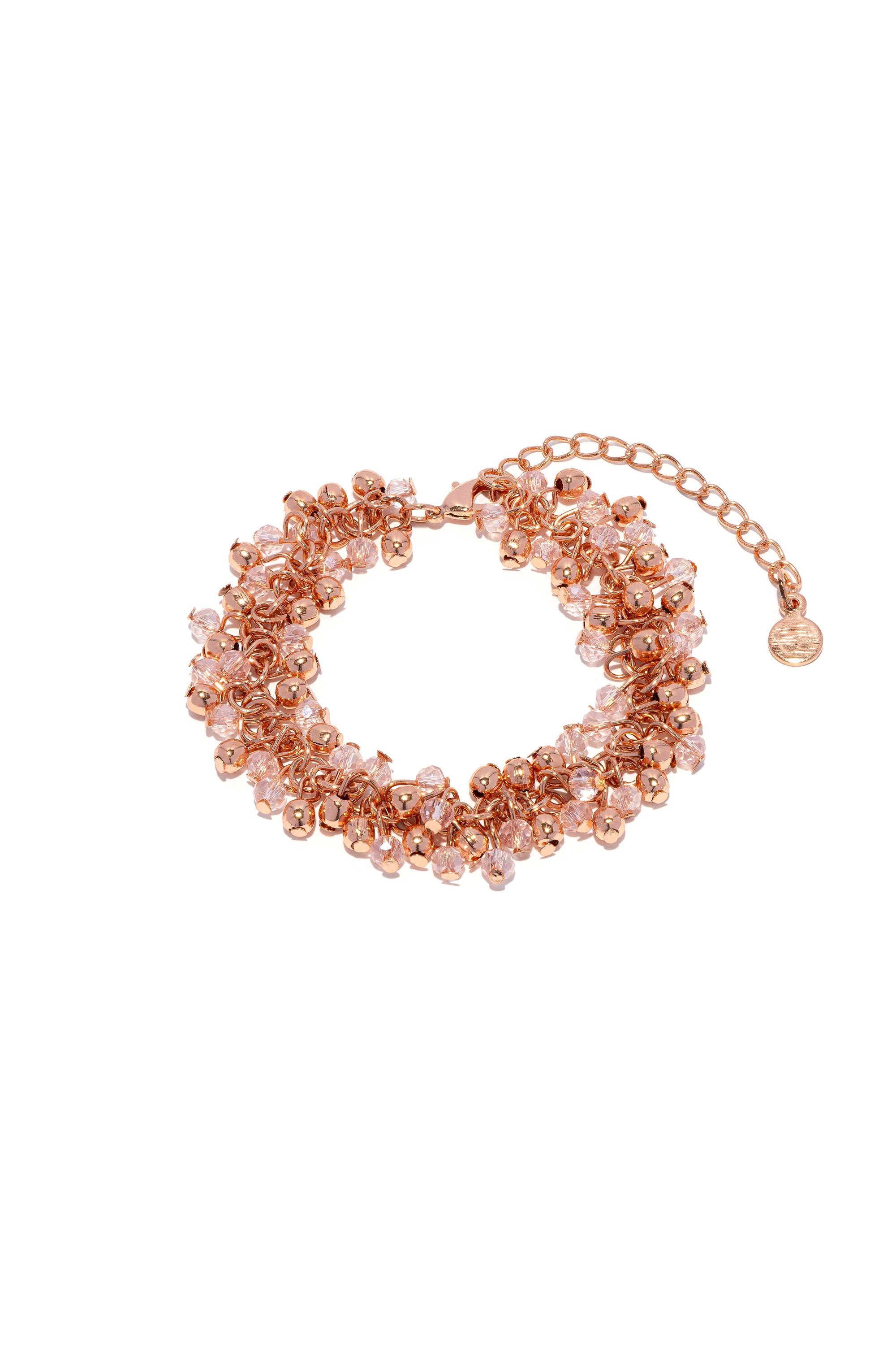 Bracciale regolabile copper plated con intrecci di cristalli rosa in vetro applicati utilizzando la lavorazione mogra. I grappoli di cristalli formano un pattern denso e brillante capace di illuminare tutti i tuoi look. Gioielli fatti a mano, unici e artigianali, perfetti per tutti i tuoi look o come idea regalo. Nickel tested.