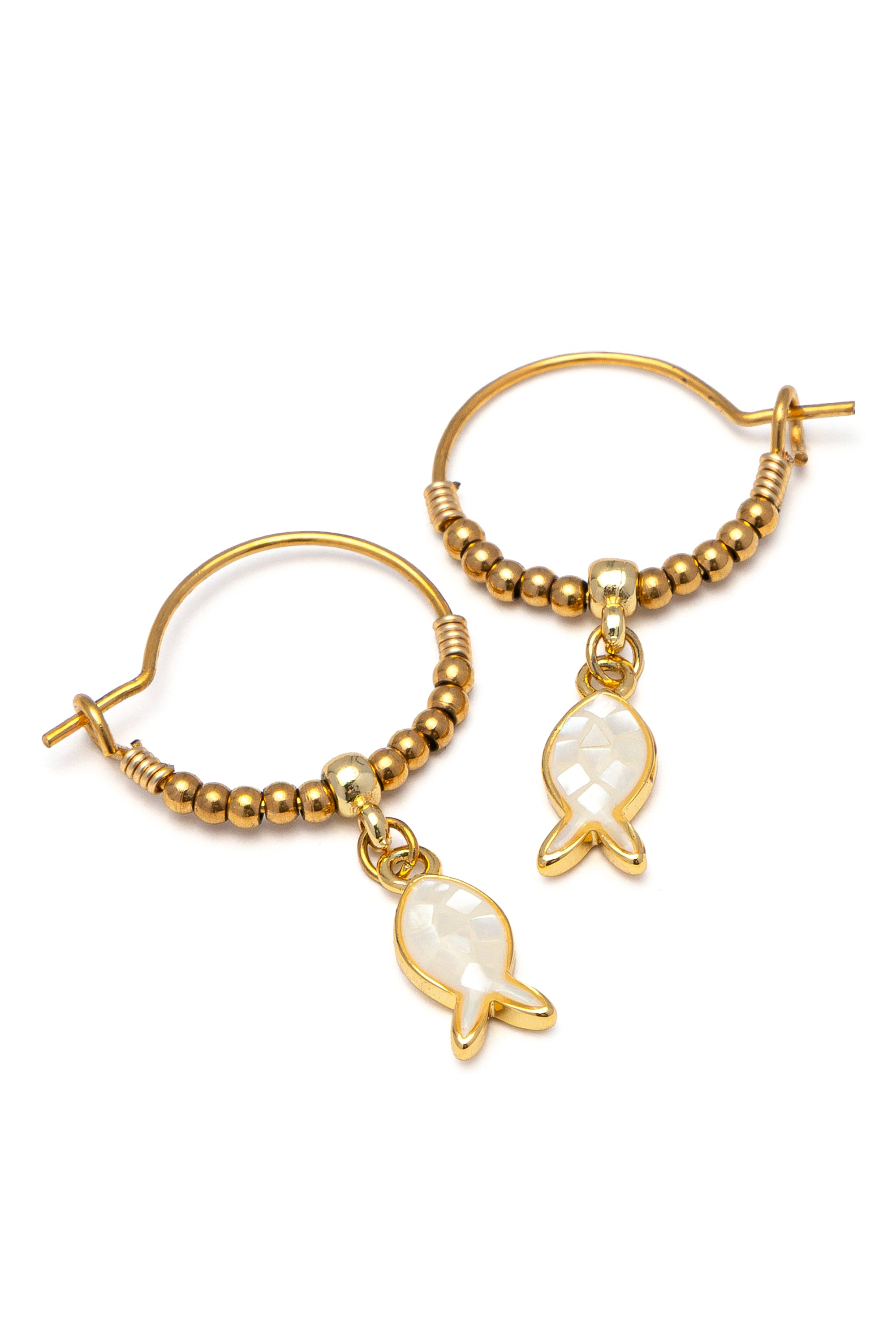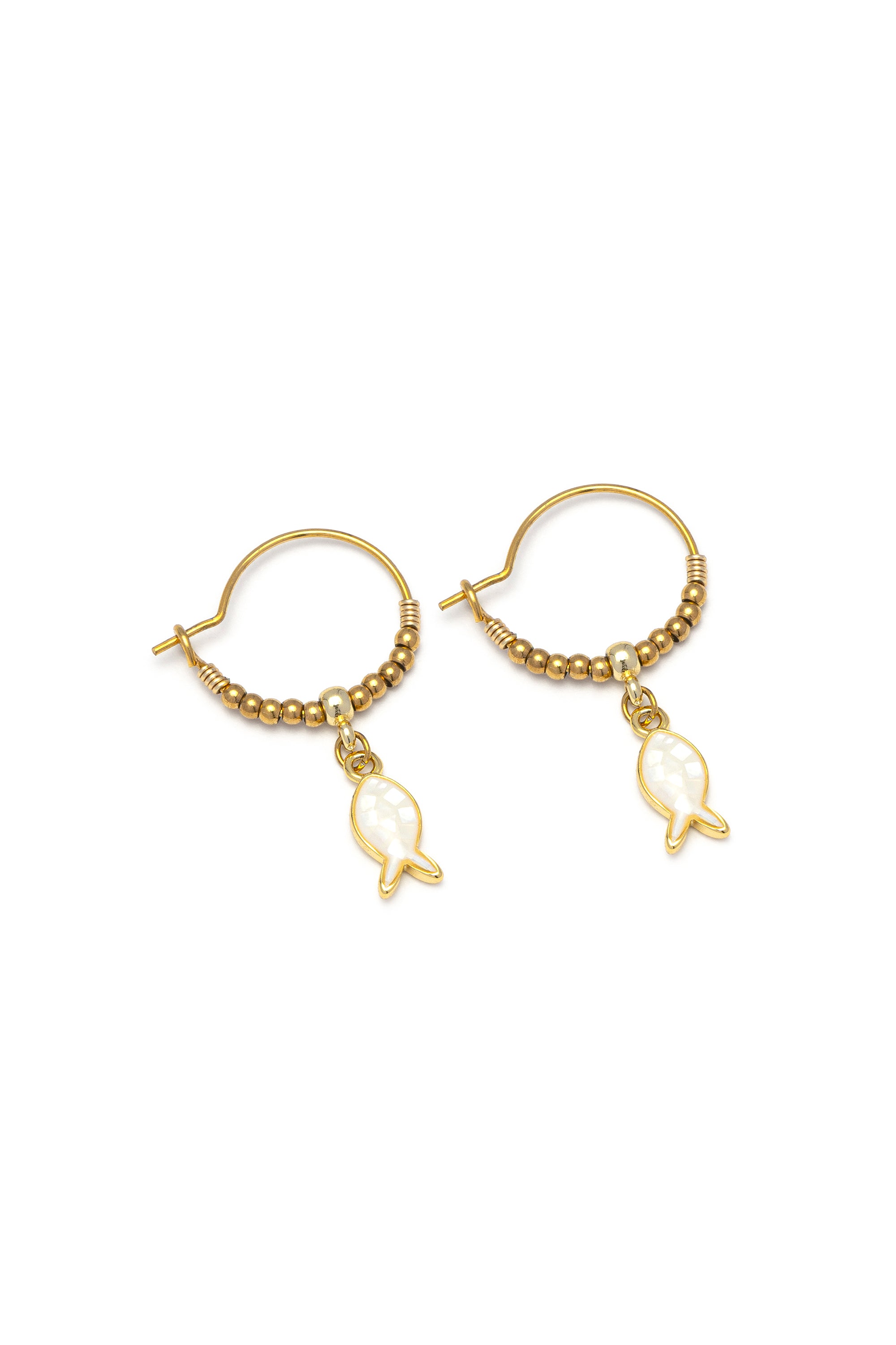 Orecchini a cerchio piccolo caratterizzati da una fila di micro sfere dorate e un charm pendente a forma di pesciolino in madreperla con lavorazione a mosaico. Si abbina al "Bracciale Elastico 2 Pesci" per un total look dalle vibes acquatiche. Chiusura ad incastro. Diametro cerchio: 1,5 cm. Materiali: acciaio placcato oro e elementi in madreperla. Nickel tested.
