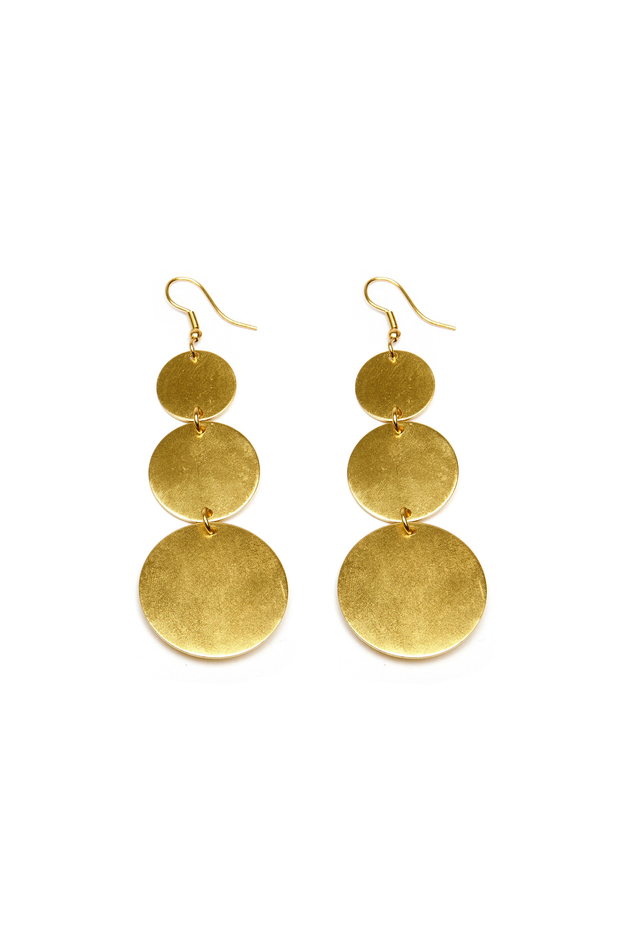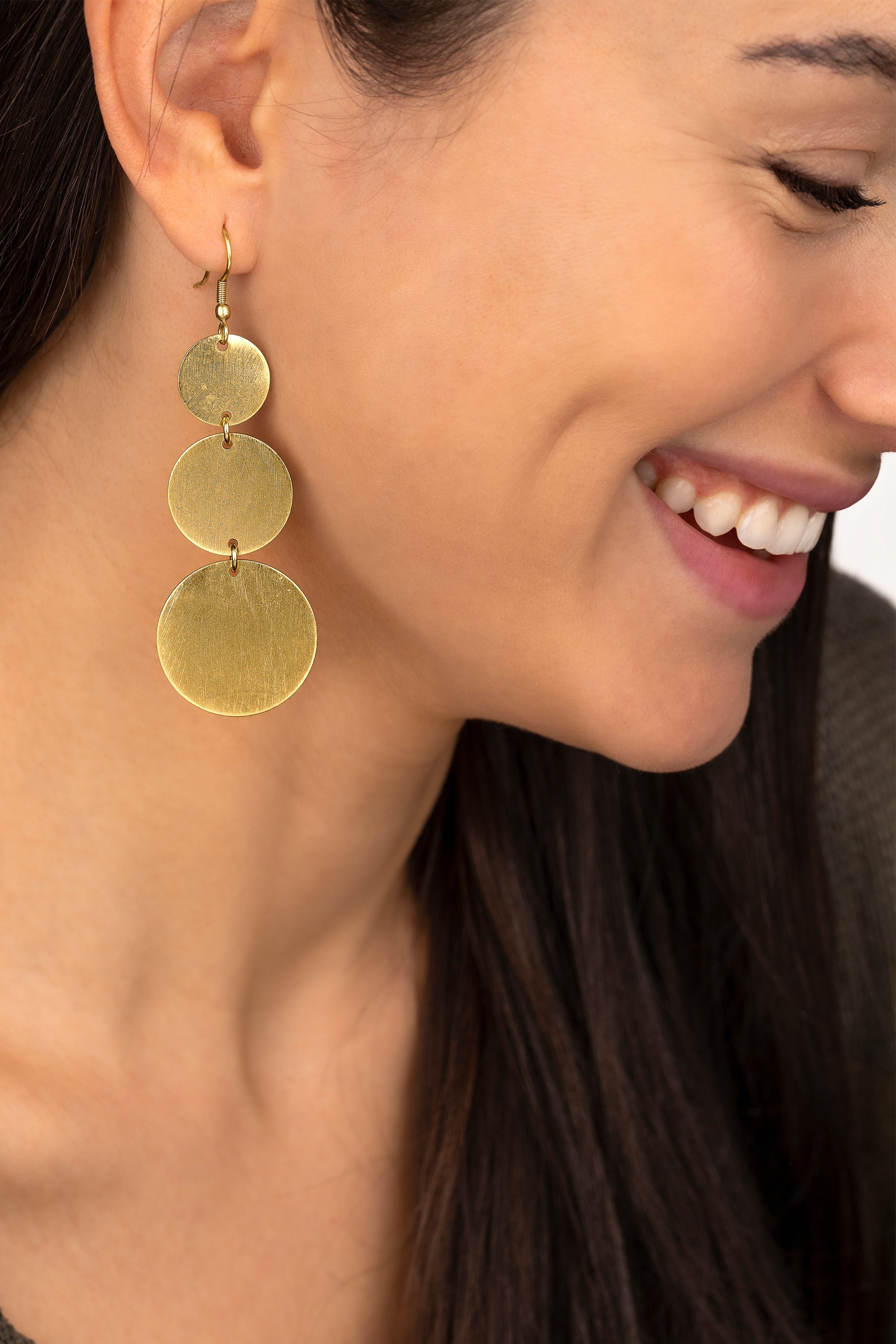 Orecchini pendenti a tre dischi degradé. La silhouette grafica e satinata riflette una luce delicata. Il modello pendente e la forma sinuosa valorizzano ogni tipo di viso. Chiusura ad amo. Realizzati a mano in ottone riciclato. Nickel tested. Lavorazione artigianale. Gioielli fatti a mano, unici e artigianali, perfetti per tutti i tuoi look o come idea regalo.