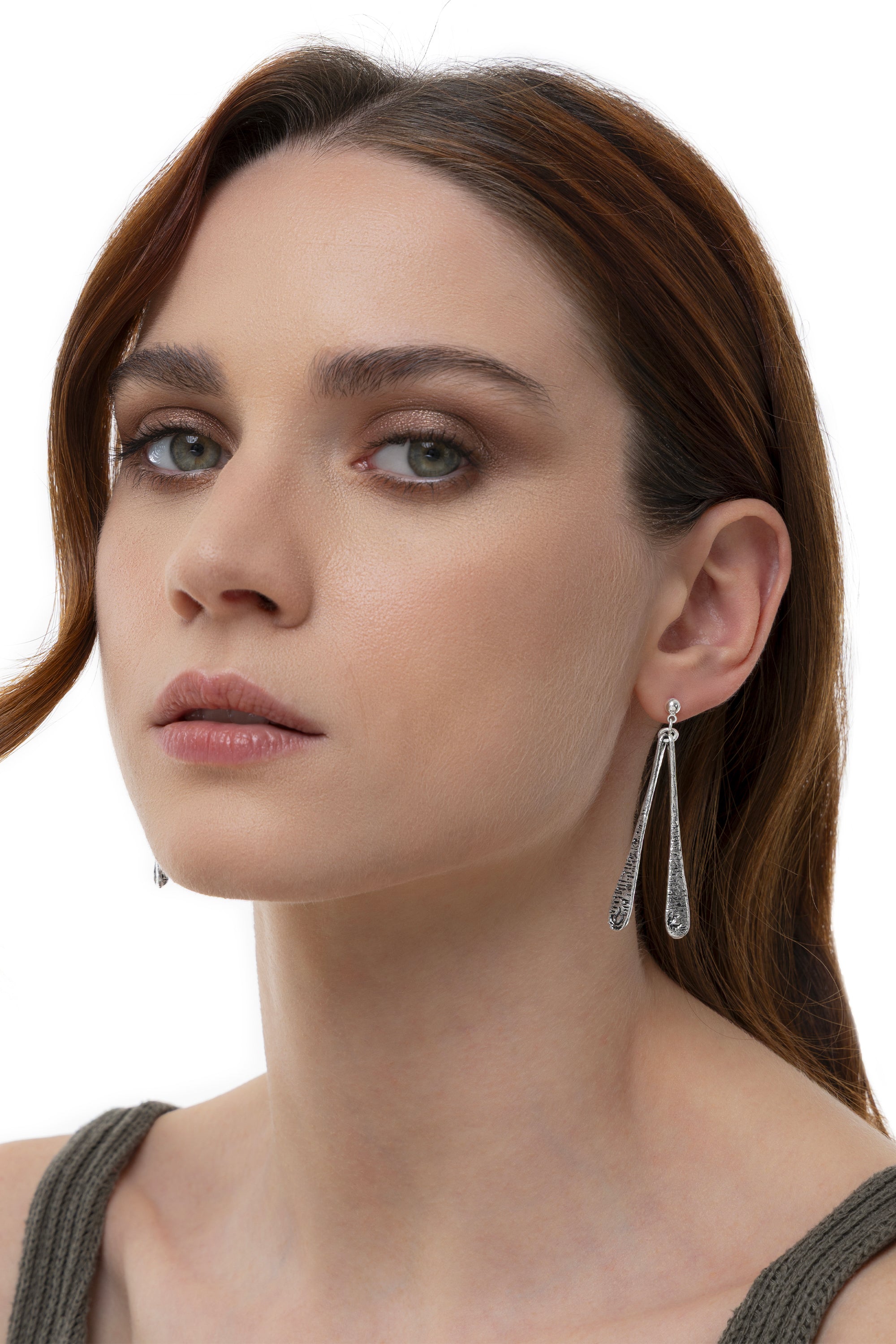 Due barrette sottili scendono dal lobo creando un movimento elegante e dinamico. Questi orecchini pendenti sono pensati per chi ama le linee semplici ma d'impatto grazie alla lavorazione martellata. Lunghezza 4,7 cm. Chiusura a perno con farfallina. Placcatura argento. Nickel tested.