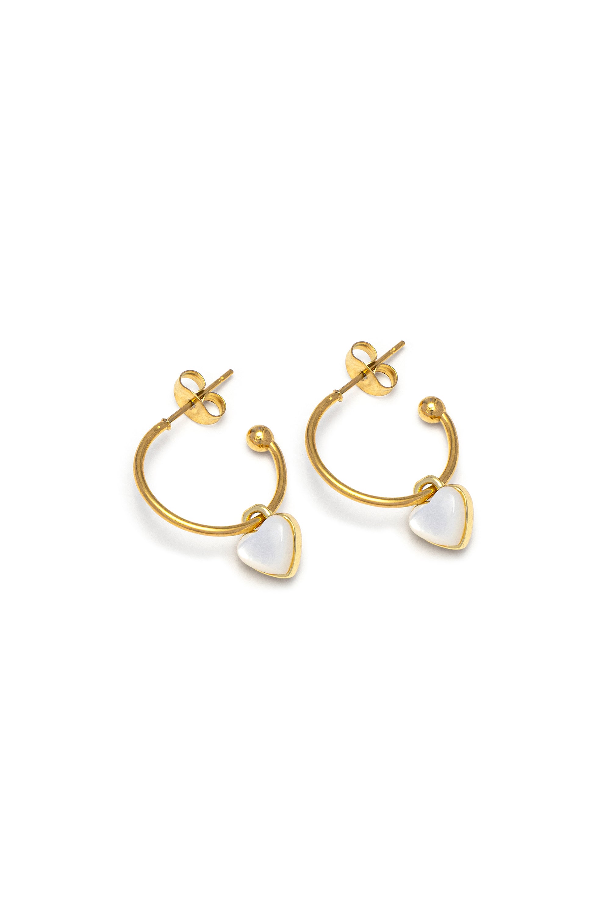 Orecchini a cerchio piccolo con ciondolo a cuore in madreperla. La linea essenziale li rende perfetti per essere indossati ogni giorno, in abbinamento al "Bracciale Elastico Micro Cuore" o al "Girocollo Sfere Cuore". Chiusura a perno con farfallina. Diametro cerchio: 1,5 cm. Materiale: acciaio placcato oro e elementi in madreperla. Nickel tested.