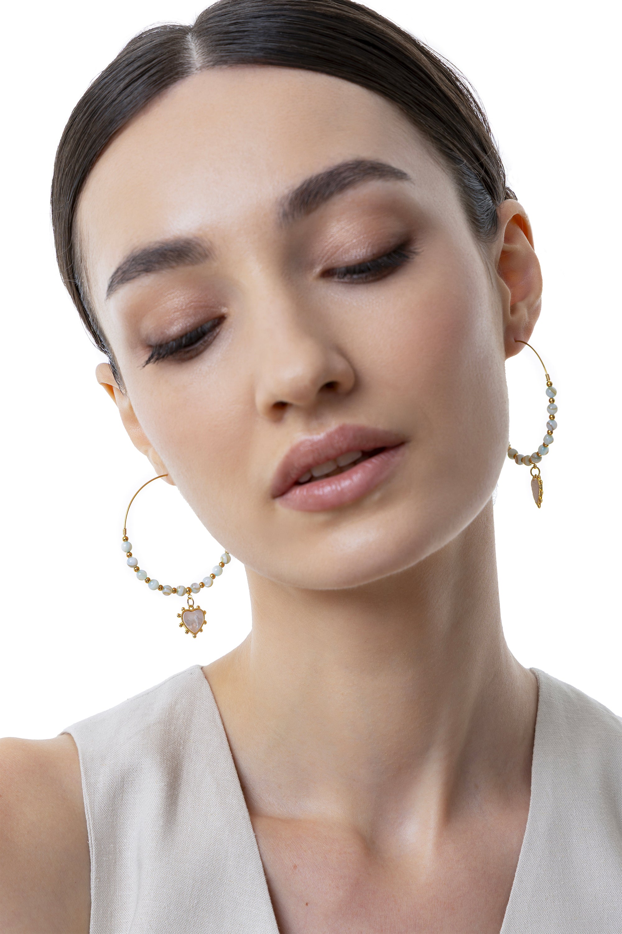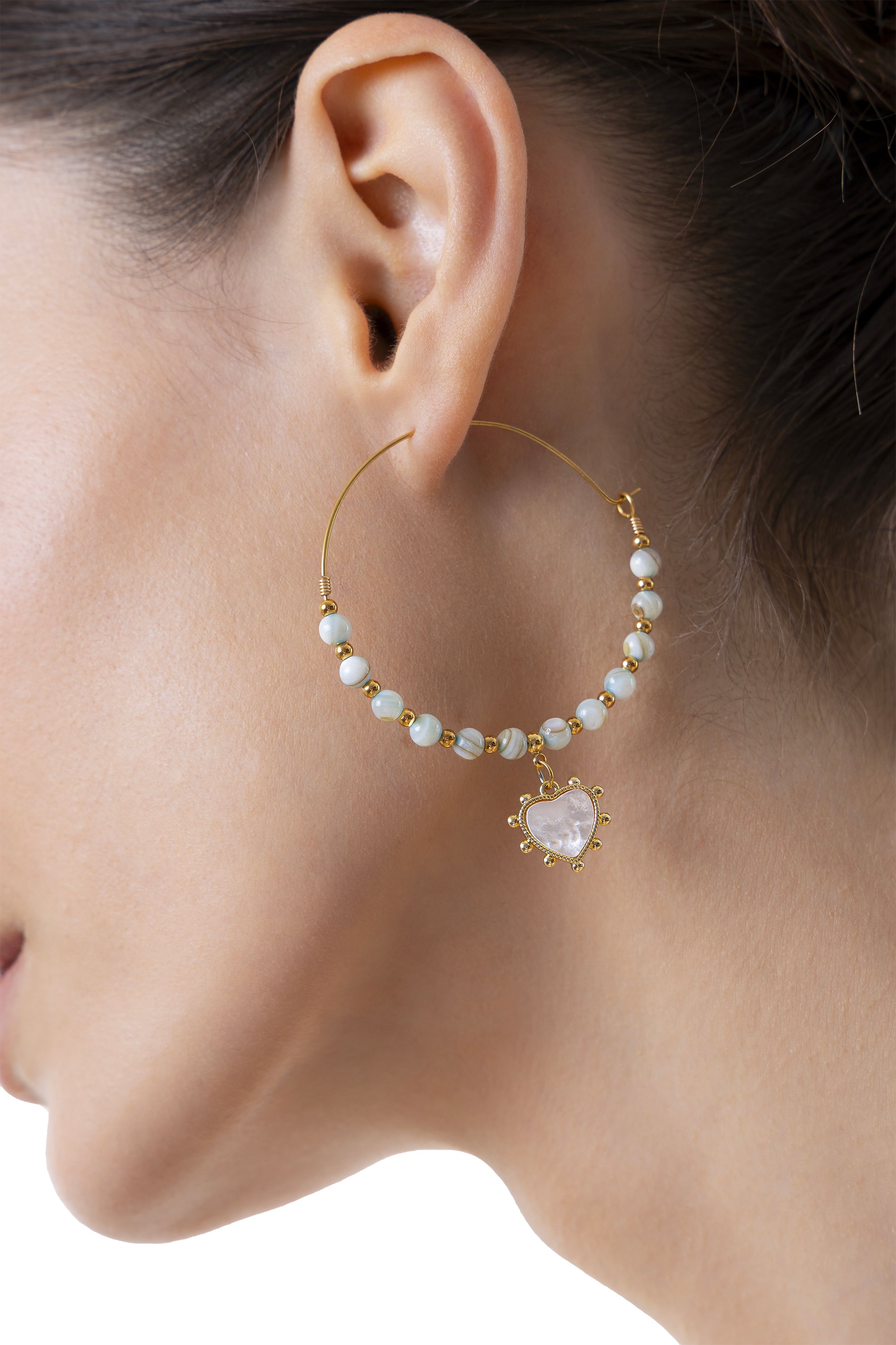 Orecchini a cerchio grandi, impreziositi da sfere in madreperla nelle sfumature dell'acquamarina e da un ciondolo a cuore centrale. Il cuore in madreperla è racchiuso da una cornice di micro sfere dorate che ne esalta la luminosità. Un modello perfetto da abbinare alla collana coordinata. Chiusura ad incastro. Diametro cerchio: 4,5 cm. Materiali: acciaio placcato oro e elementi in madreperla. Nickel tested.