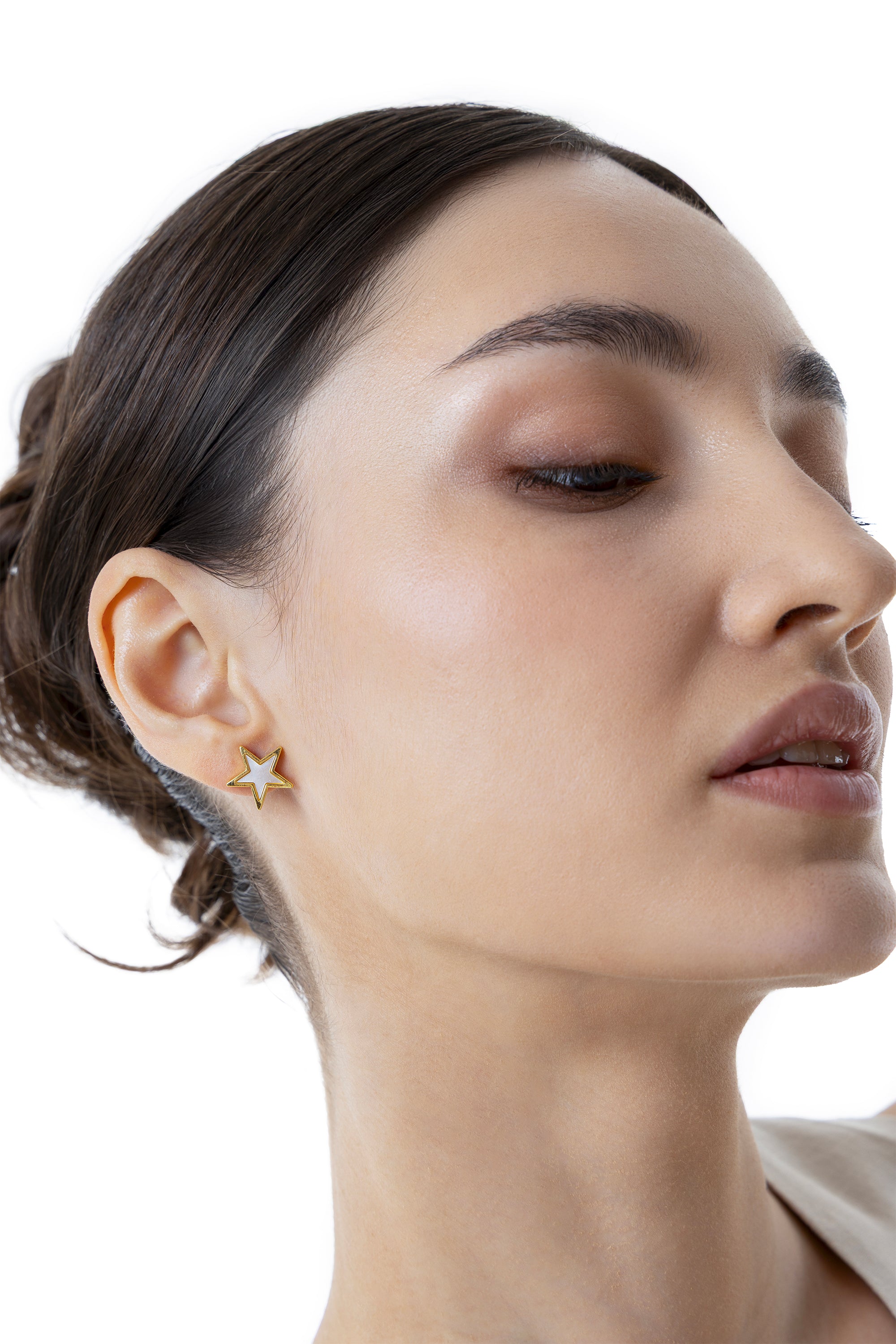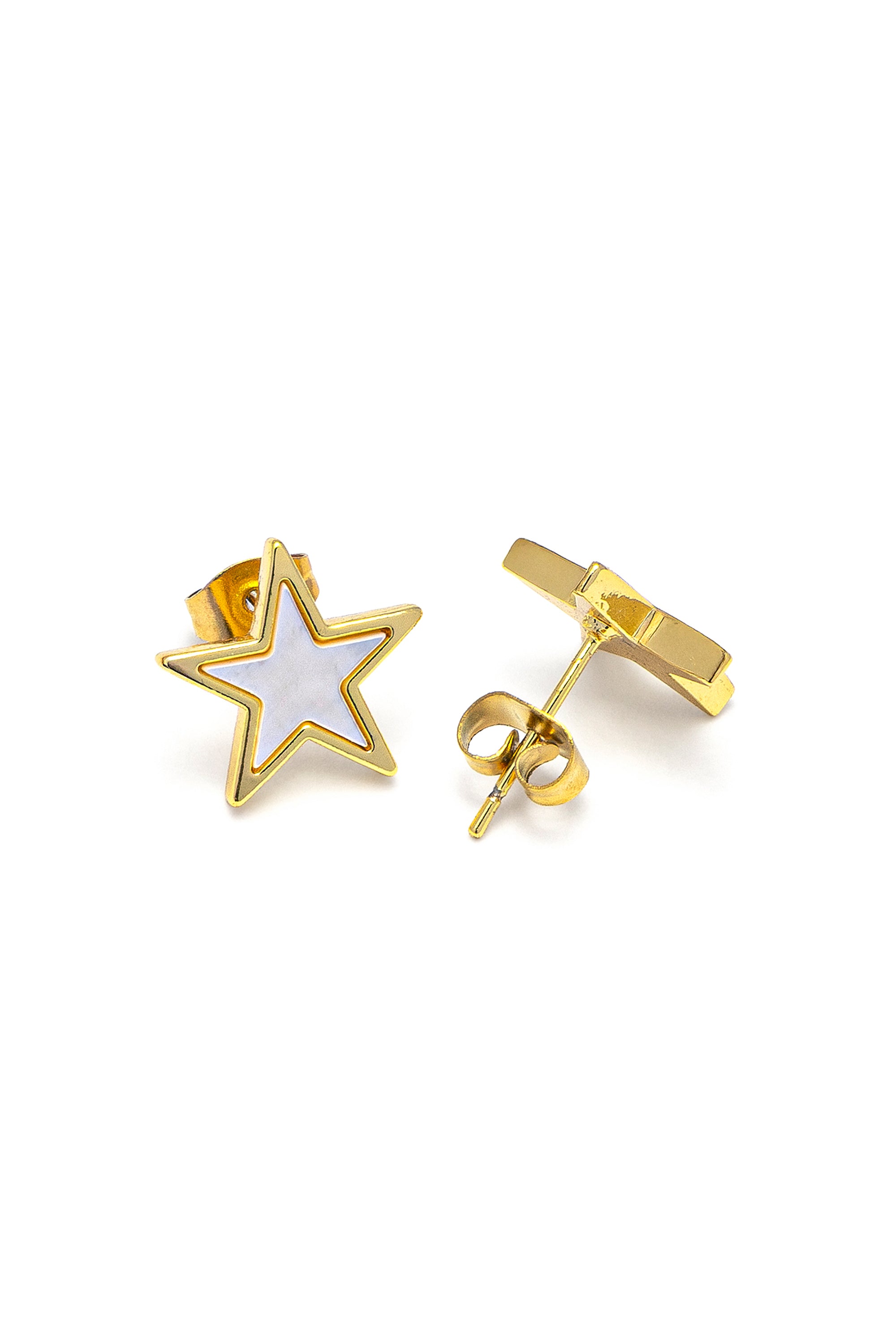 Orecchini a lobo a forma di stella con un inserto in madreperla su base in acciaio placcato oro. Un gioiello timeless dallo stile chic contemporaneo, perfetto come idea regalo per chi desidera portare sempre con sé un tocco di luce. Ideali in abbinamento con la "Collana Stella" o con il "Bracciale Elastico Stella". Chiusura a perno con farfallina. Materiali: acciaio placcato oro e elementi in madreperla. Nickel tested.