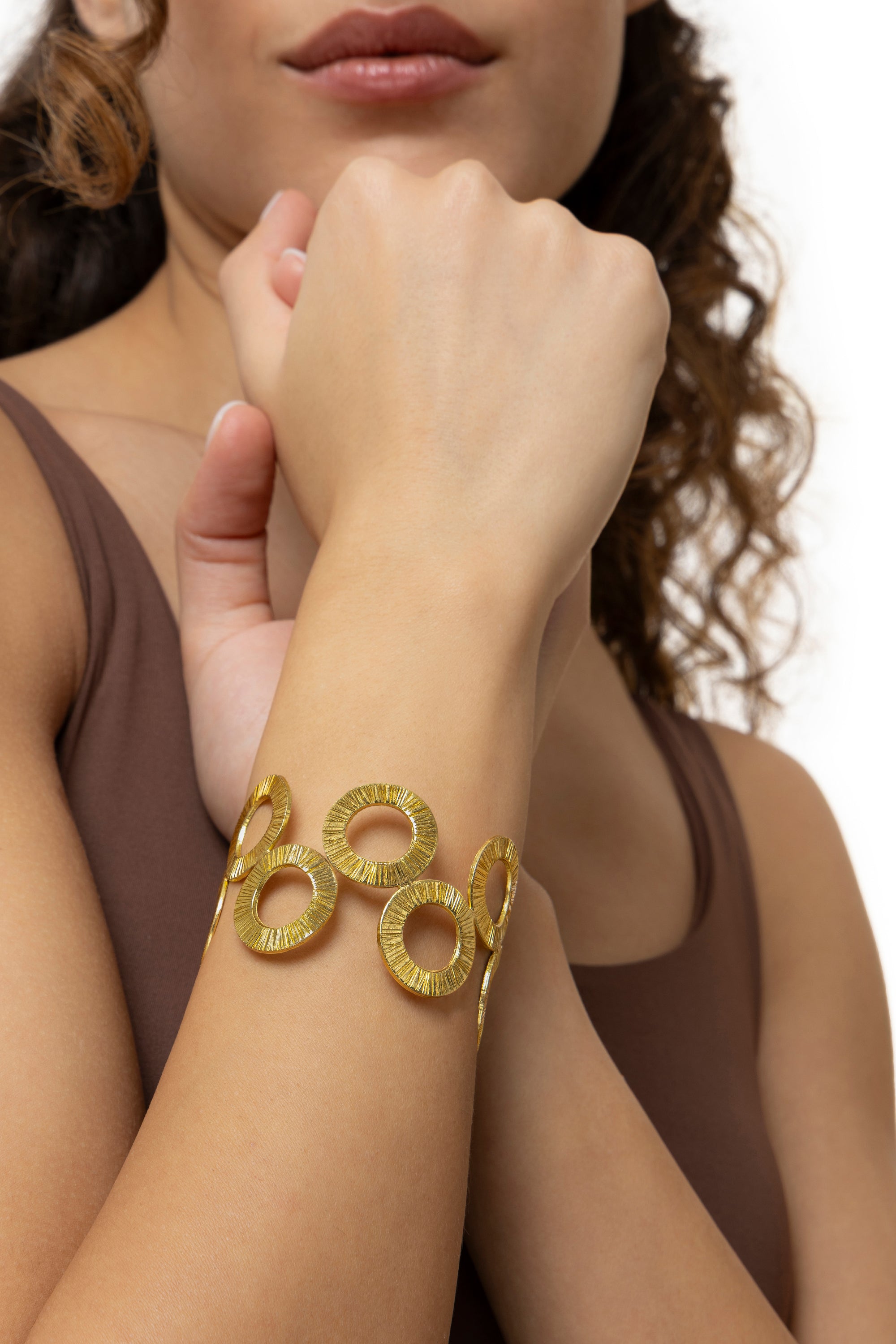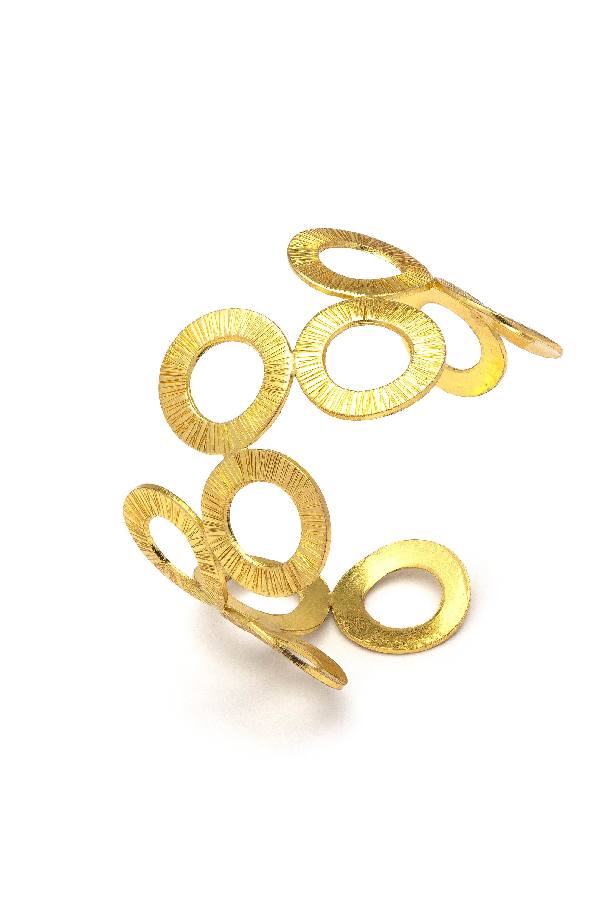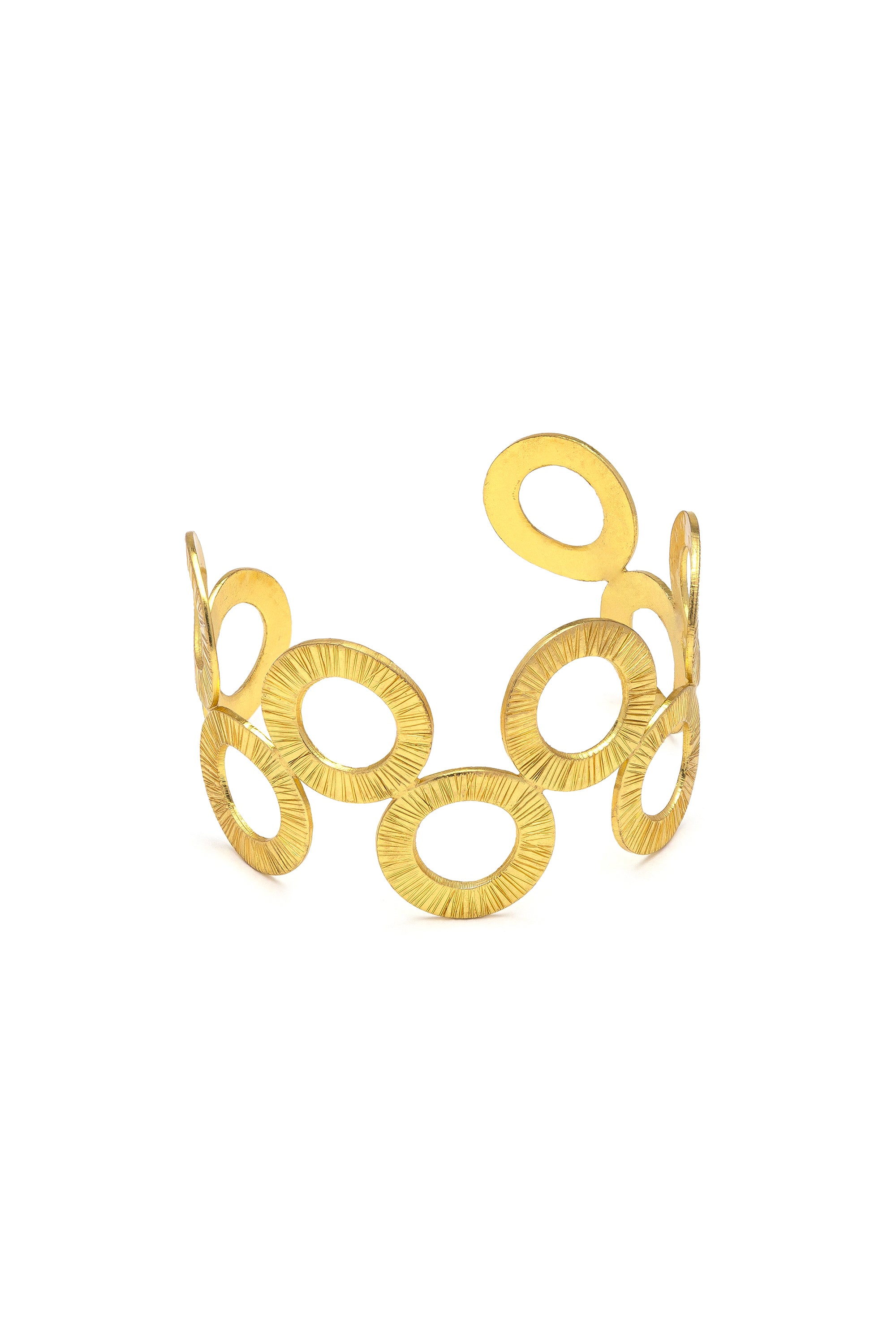 Una sequenza di cerchi si susseguono sulla montatura semi rigida di questo bracciale a fascia. Un gioco di geometrie artigianali e texture uniche che definisce il polso con eleganza e carattere. Ideale in abbinamento agli "Orecchini 2 Semicerchi". Modello regolabile. Ottone riciclato. Handmade. Nickel tested.