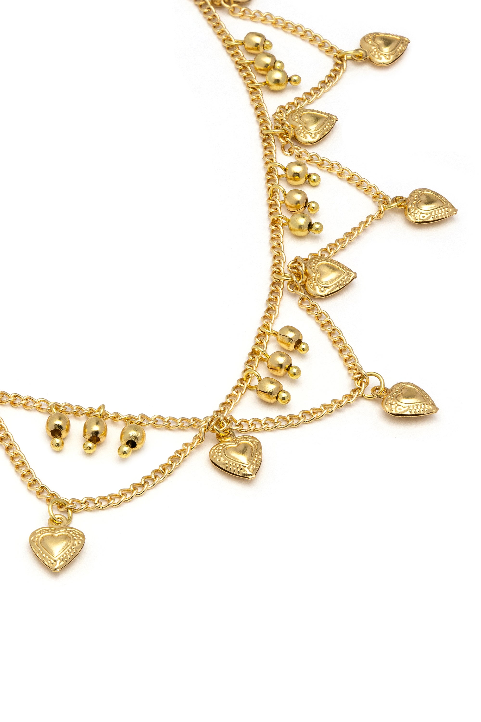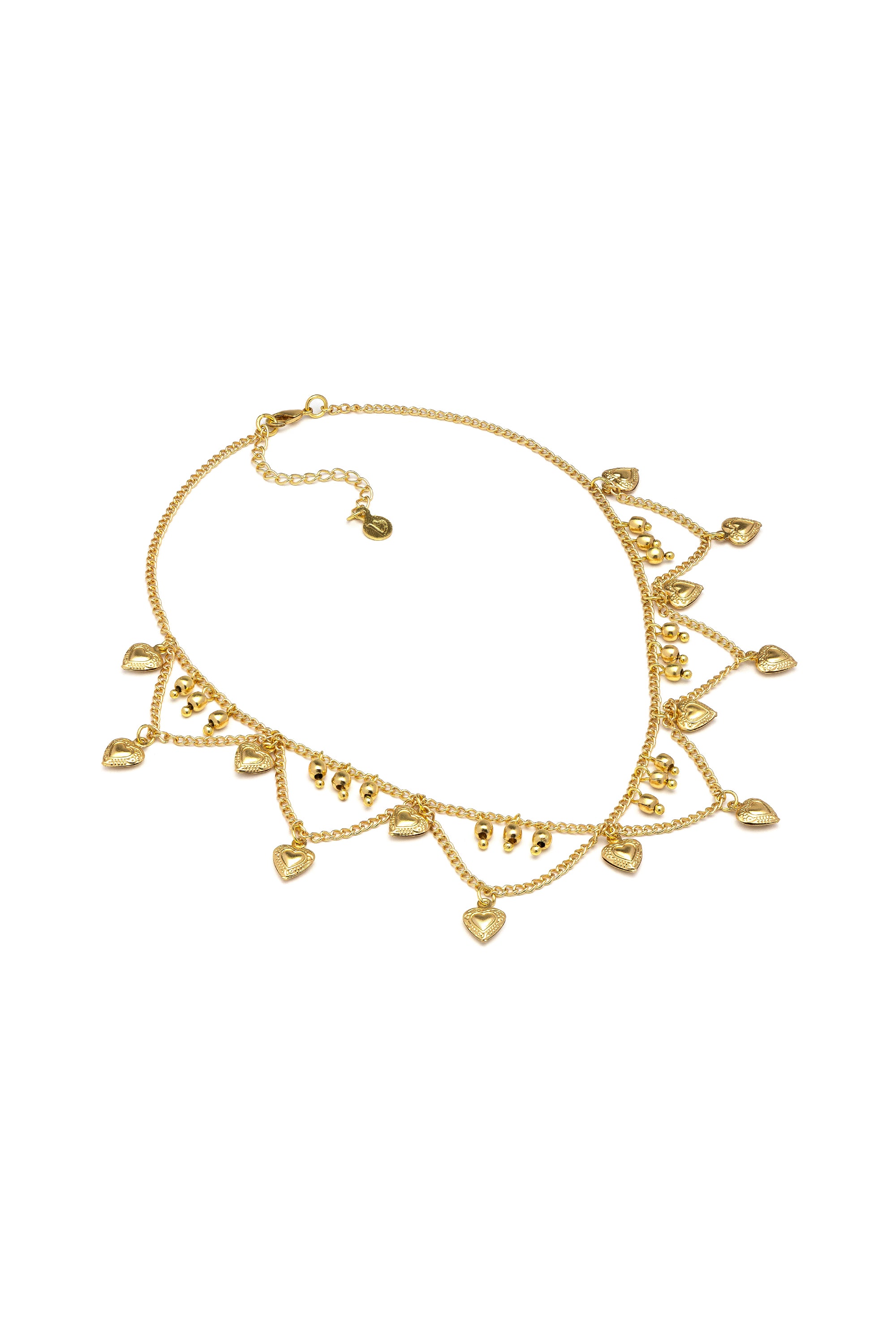 Due catene sottili si intrecciano culminando in piccoli cuori pendenti e sfere luminose in questa collana dalla shade dorata. La scelta ideale per chi desidera un accessorio romantico ma di forte personalit?. Perfetta da abbinare al "Bracciale Elastico Multifilo Cuore". Lunghezza regolabile. Ottone riciclato. Handmade. Nickel tested.