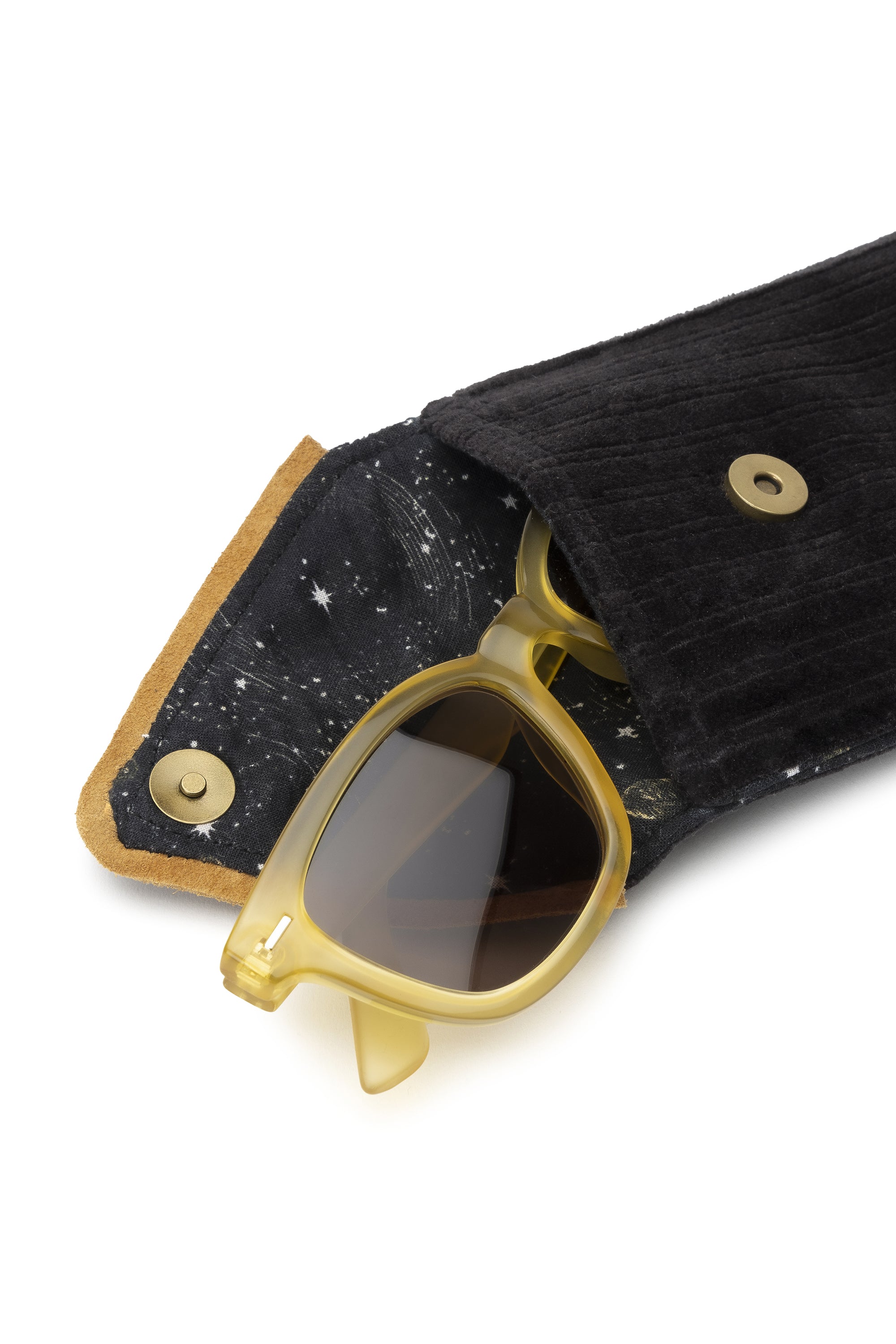 Pochette Glasses Case colore nero. Conserva i tuoi occhiali da sole o da lettura in questo morbido contenitore. Un tocco davvero “cool” perfetto da tenere in borsa. Disponibile anche in color ocra. Materiale corpo: 100% cotone. Fodera con pattern stellato: 100% cotone. Chiusura: bottone magnete. Misure: 10 (B) x 18 (A).