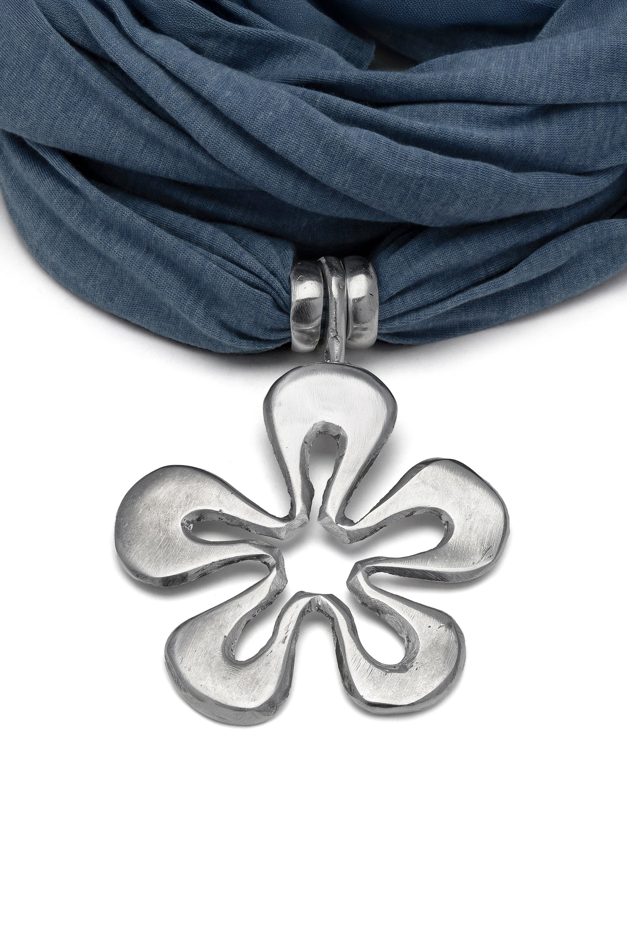 Un accessorio versatile che unisce la morbidezza del tessuto alla forza dell'alluminio. Il pendente a forma di fiore stilizzato, dal design audace e moderno, rende questa sciarpa gioiello l'ideale per chi cerca un accessorio di carattere in ogni outfit. Abbinala all'"Anello Fascia Martellata" per un look artigianale e ricercato. Materiali: alluminio, 52% cotone, 48% poliestere. Handmade. Nickel tested.
