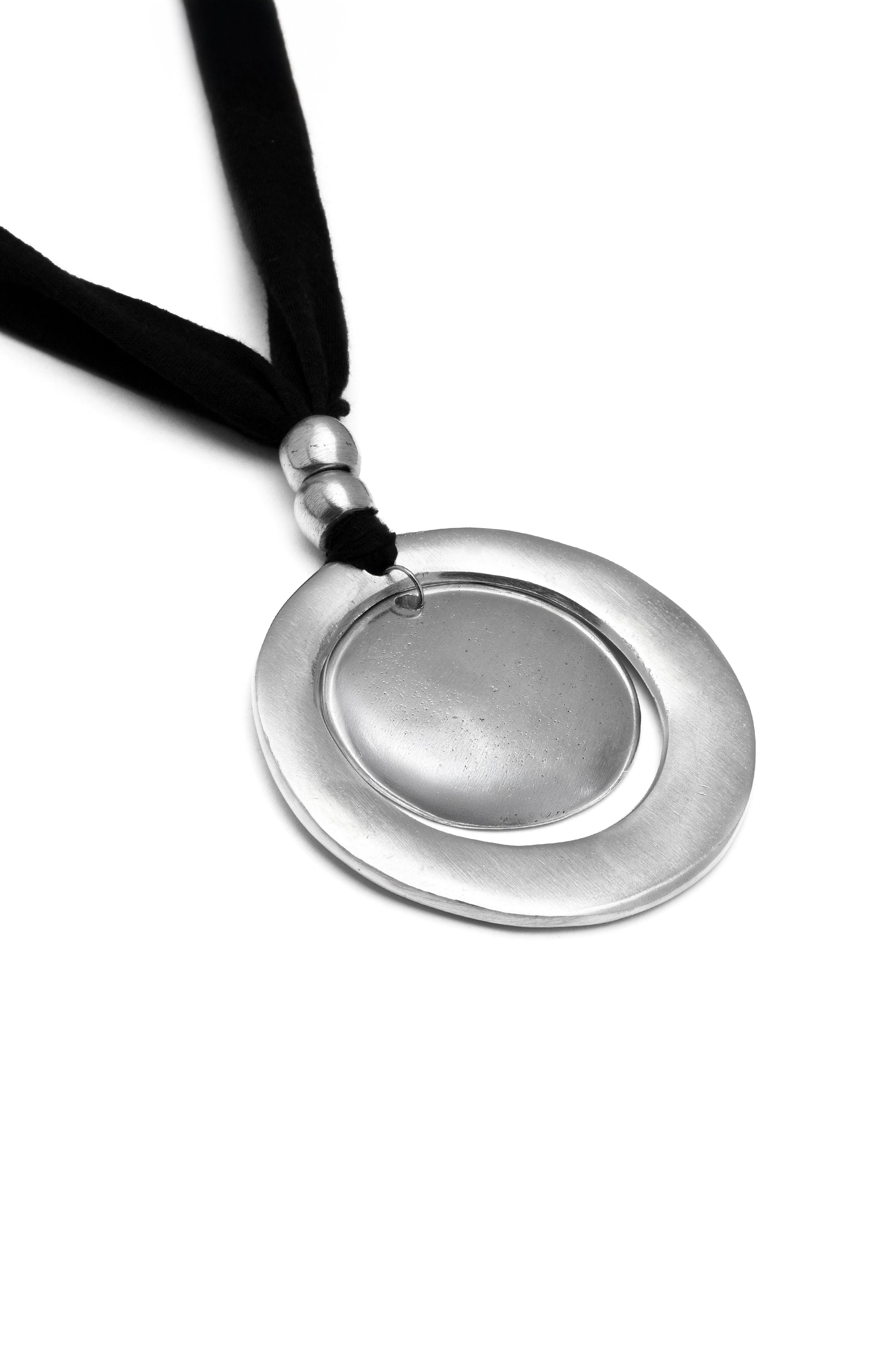 The perfect piece of jewellery for those looking for an accessory that stands out. The pendant, composed of two overlapping circular elements, falls softly on your outfit thanks to the jersey ribbon, which you can tie at the height you prefer. A minimalist and sustainable design to enhance any neckline. Materials: aluminium and viscose. Handmade. Nickel tested.