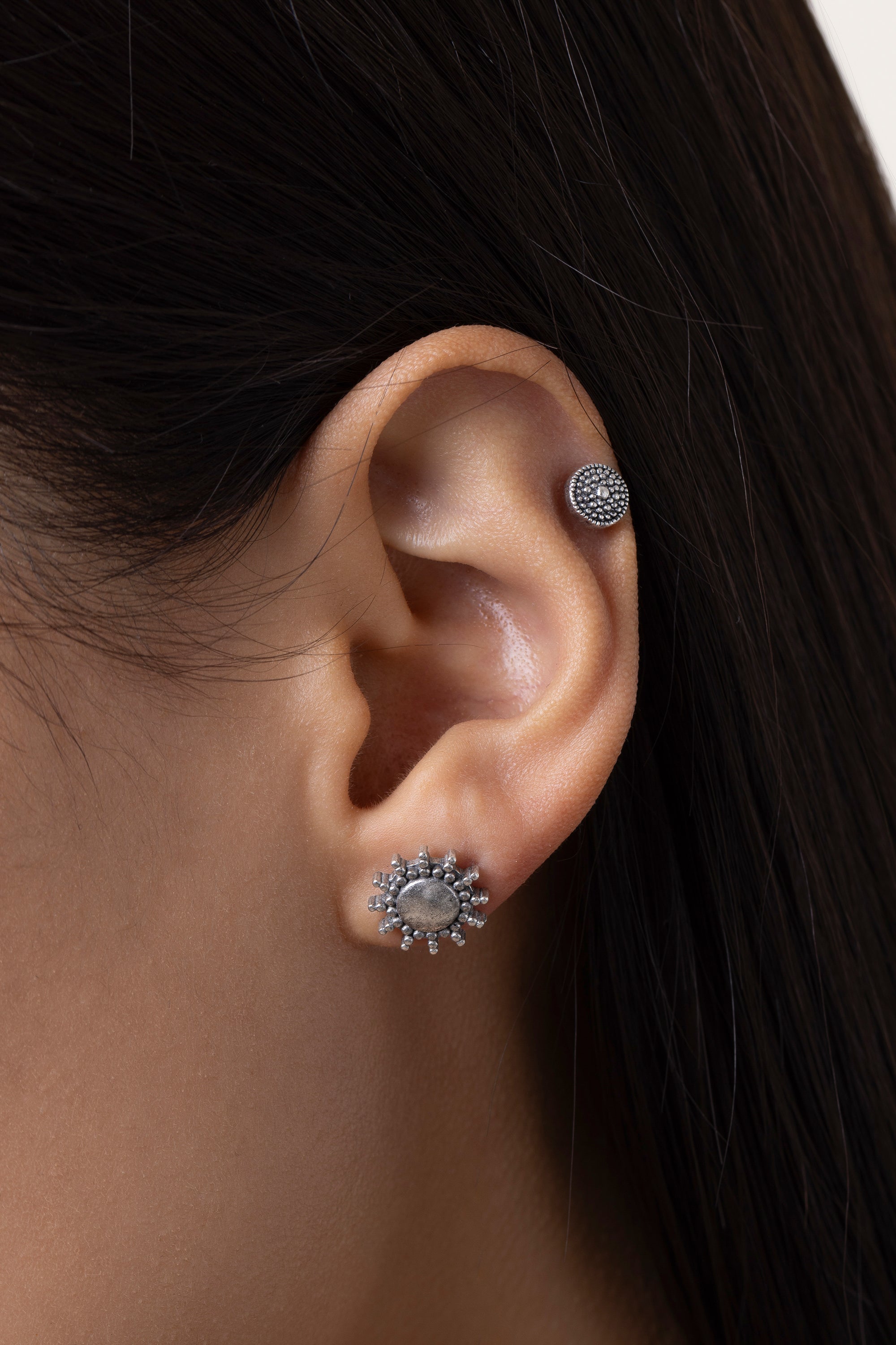 Set of 2 button earrings in the shape of the sun. Measurements: 1.2 cm and 0.5 cm. Butterfly closure. Silver-plated. Nickel tested. Handmade, unique, handcrafted jewelry perfect for all your looks or as a gift idea.