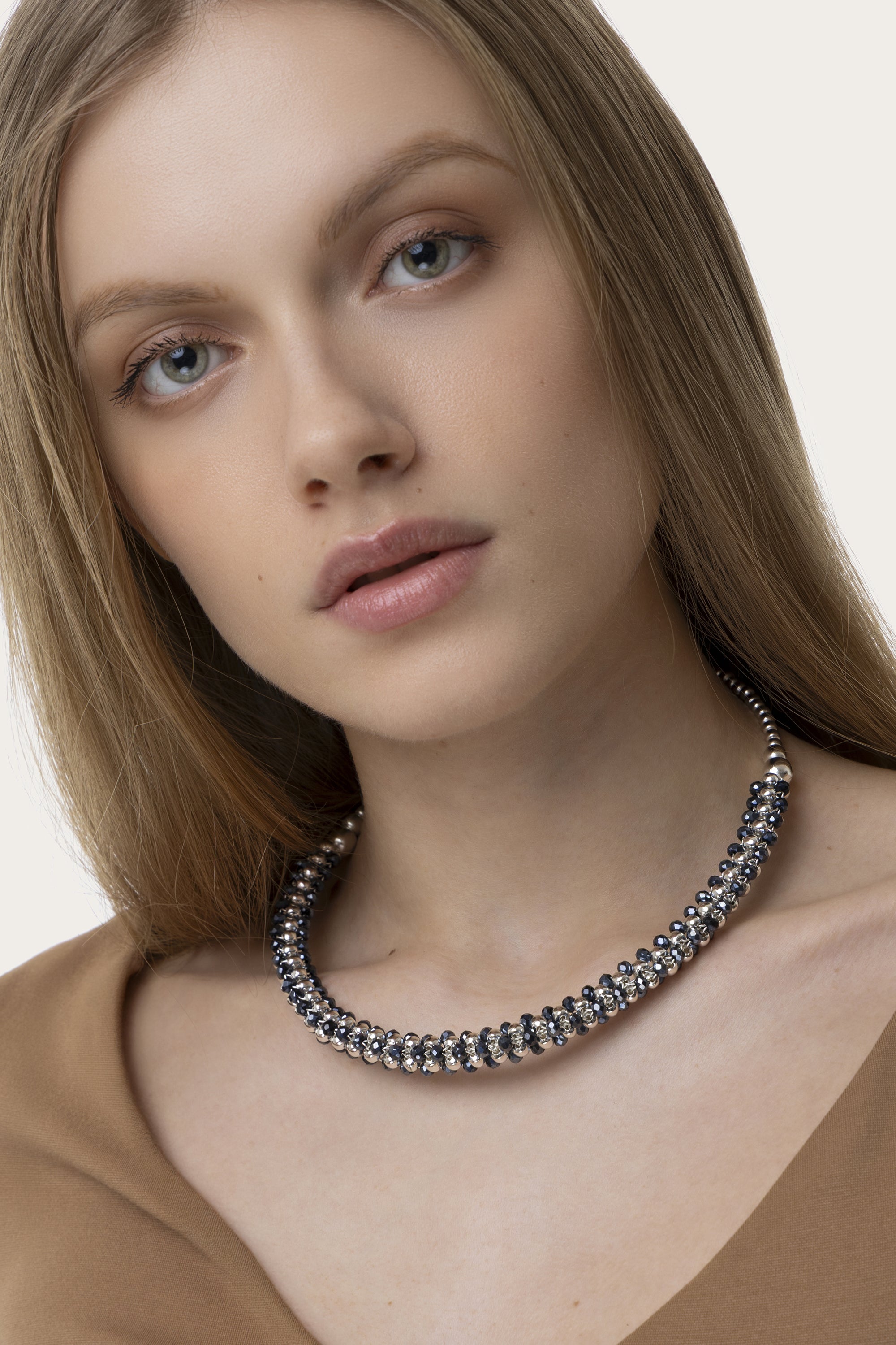 Shimmering and full of personality, the Crystal collection combines the sparkle of faceted glass crystals with a soft colour palette: ochre, rust, blue and dusty blue. It consists of two design lines: the first offers minimalist style chokers and bracelets with small, monochromatic or multicoloured crystals, ideal for a sophisticated touch to combine with winter clutches; the second includes a series of multi-strand necklaces ideal for more eccentric and refined looks.