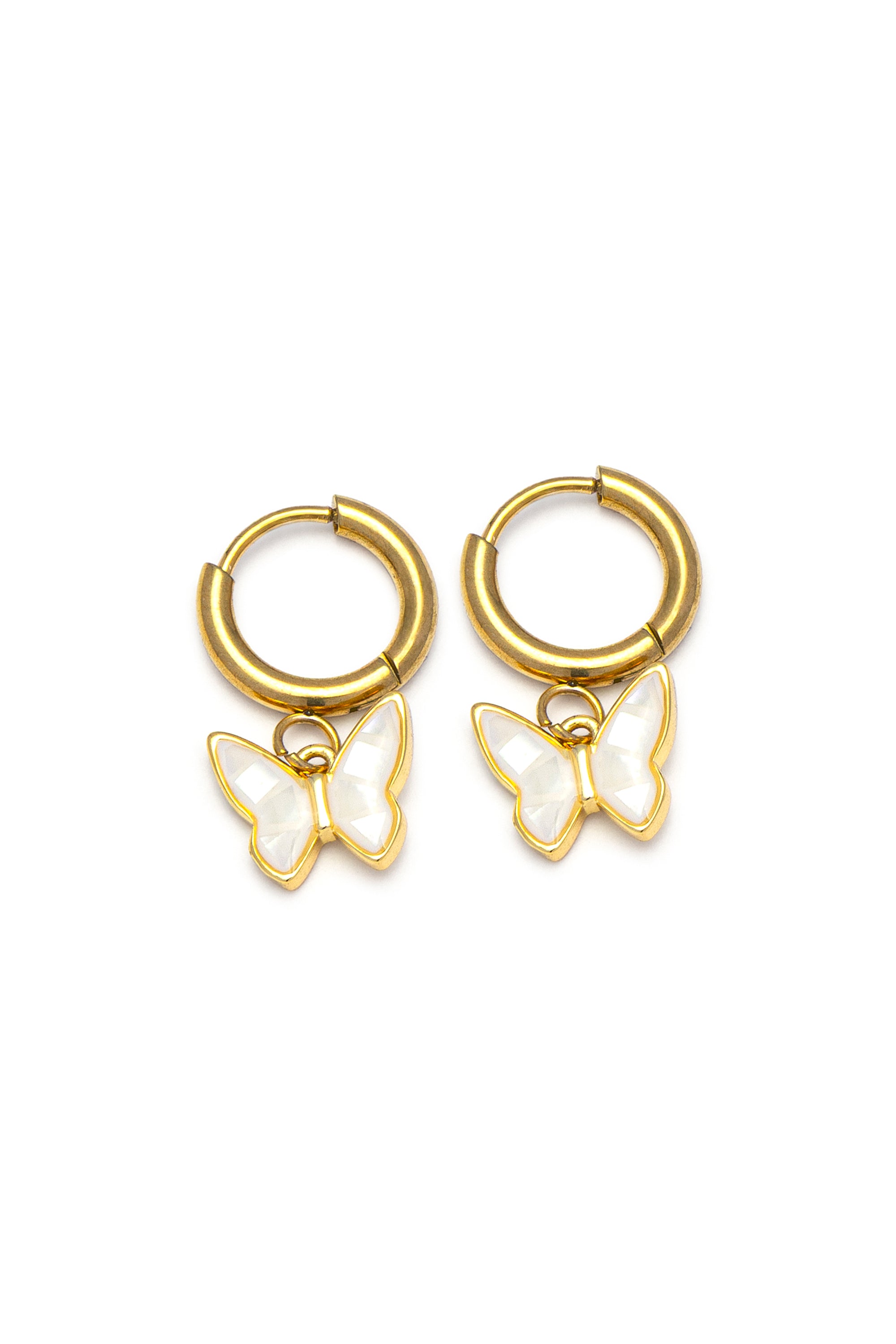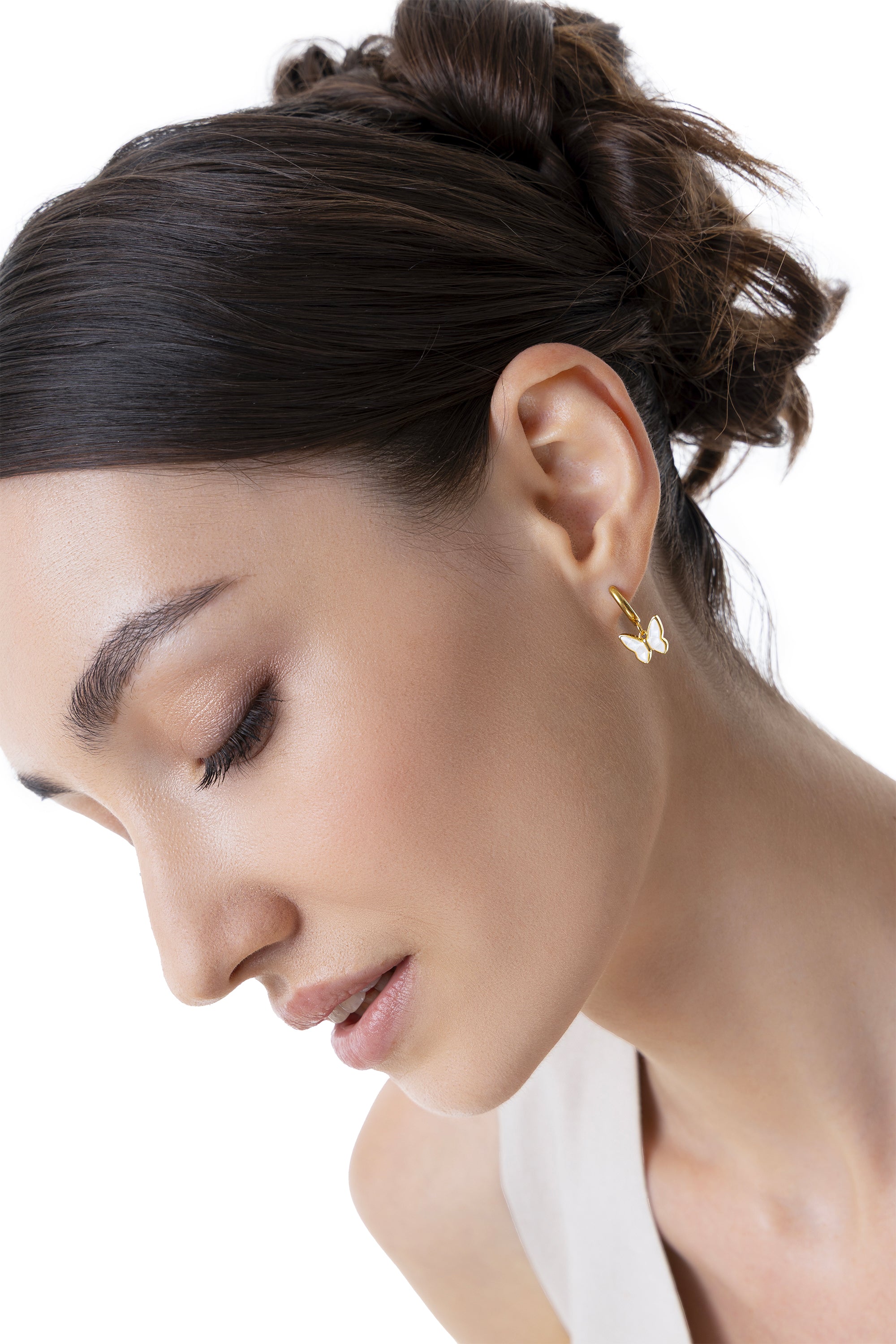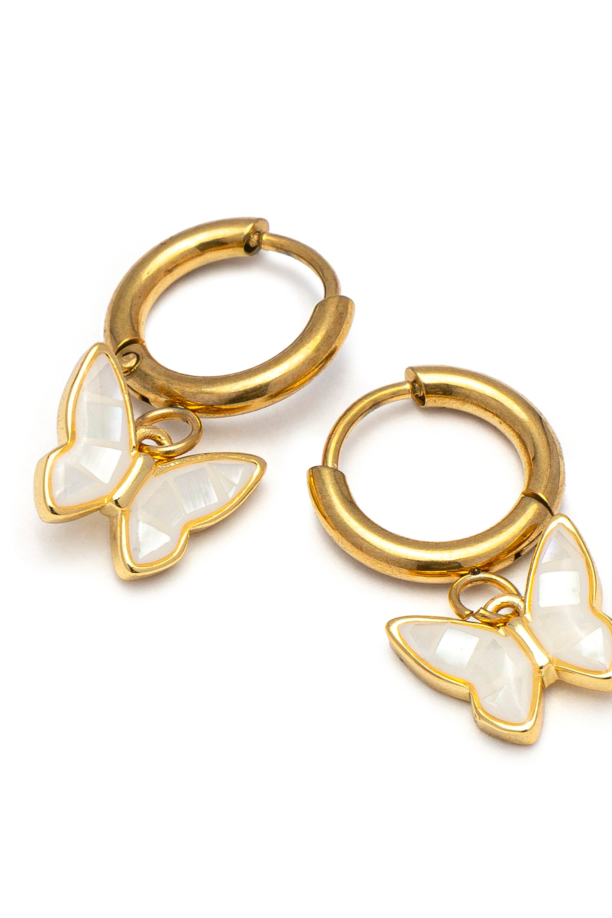 Small hoop earrings with mother-of-pearl butterfly charm. Designed to complete the set with the ?Elastic Butterfly Bracelet?. A feminine detail for your everyday look. Snap closure with pin. Hoop diameter: 0.8 cm. Materials: gold-plated steel and mother-of-pearl elements. Nickel tested.