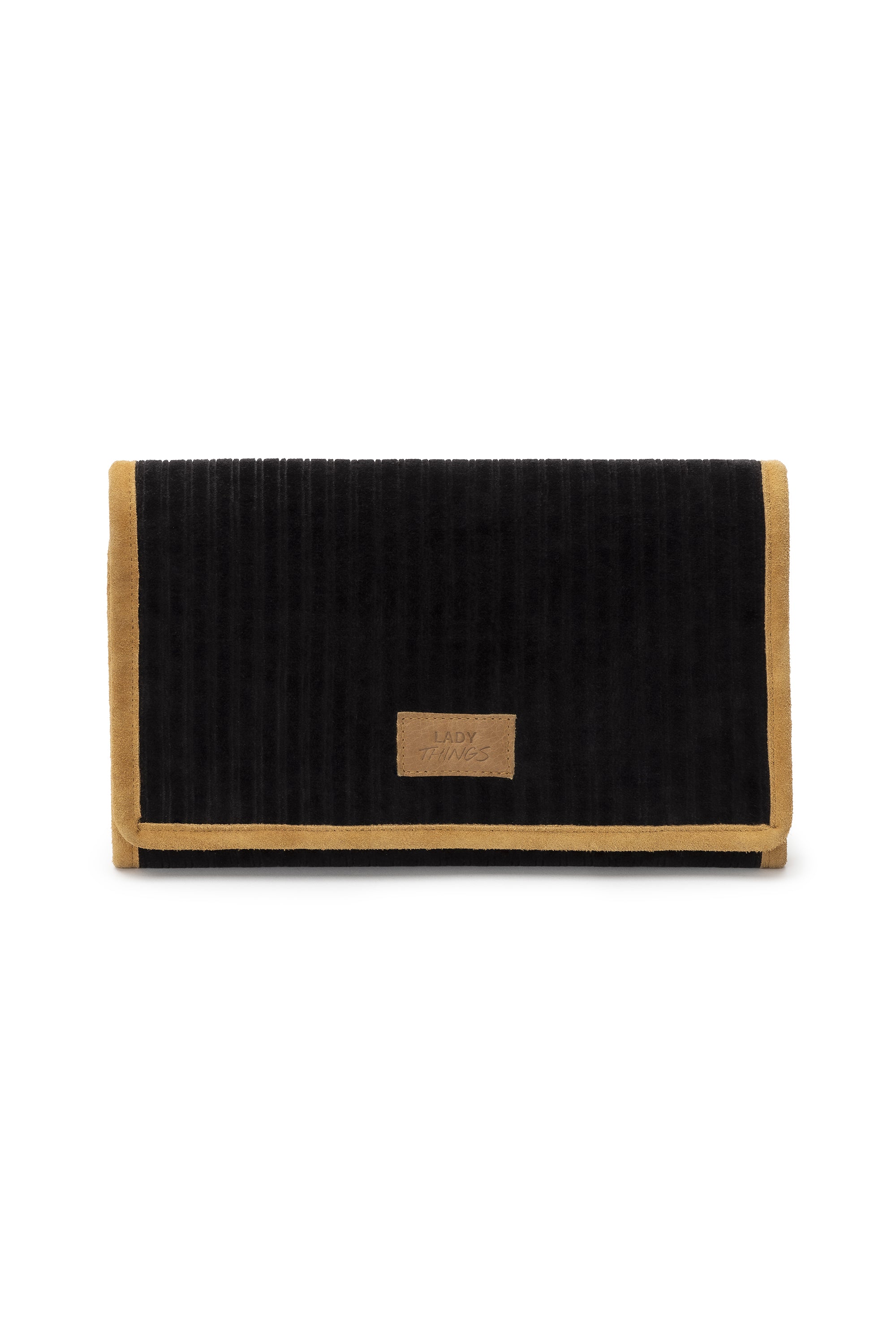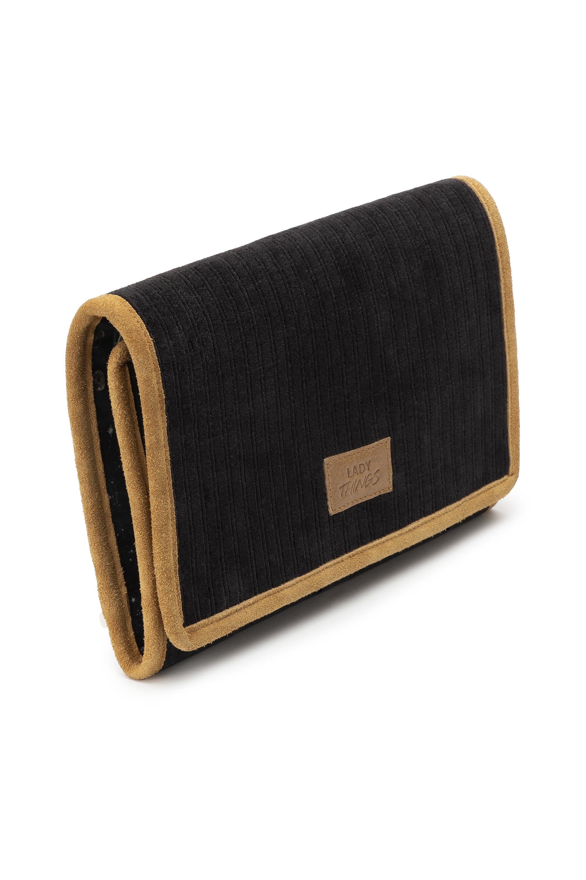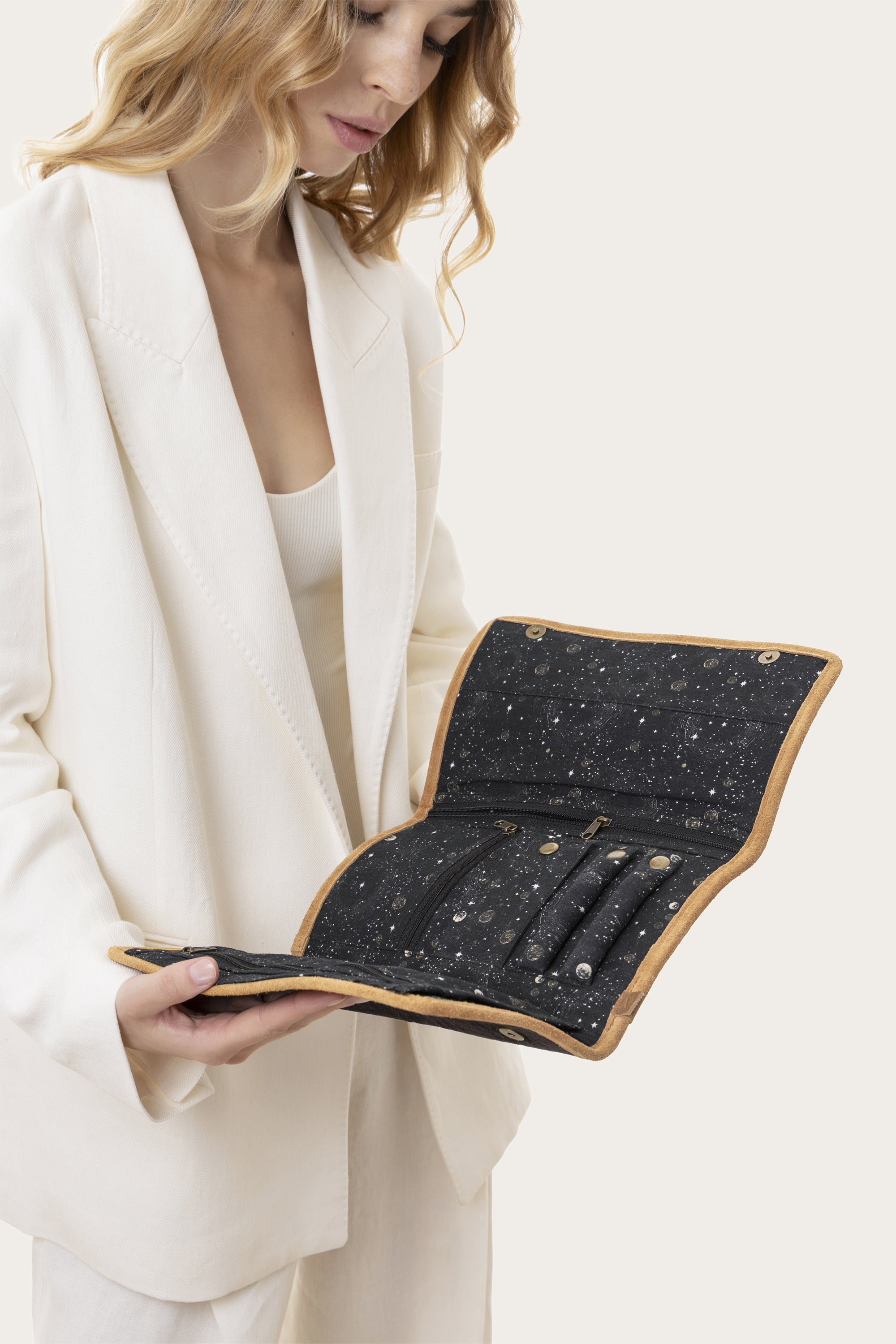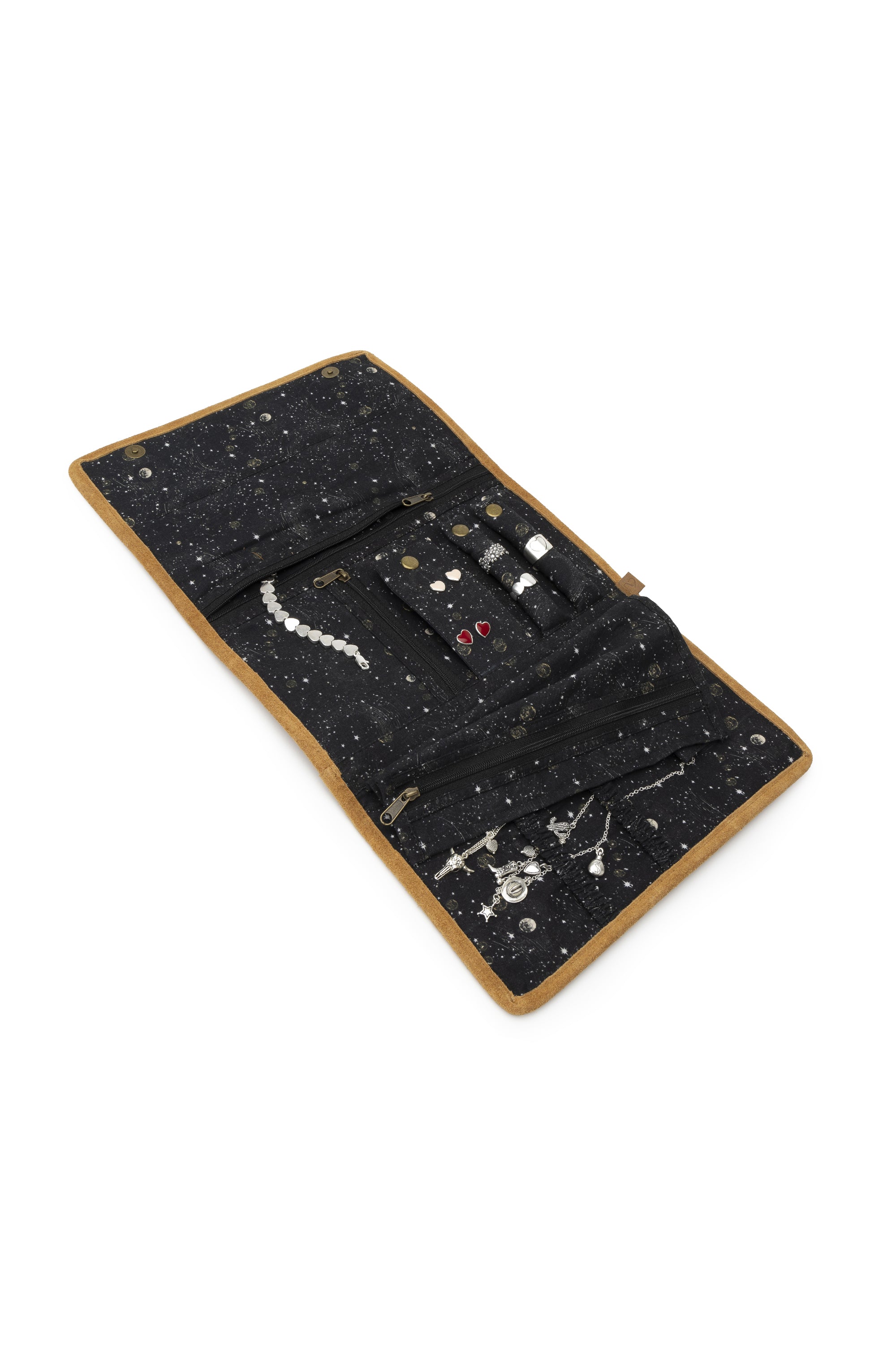 Jewelry Pouch in black. The dream container for your jewelry—take your favourite pieces wherever you go. Soft and practical, perfect for a weekend away or to slip inside a large travel tote. Also available in ochre. Body: 100 % cotton. Star-pattern lining: 100 % cotton. Inner pockets: three zip. Fastening: magnetic button. Size: 26 (W) × 17 (H) cm.