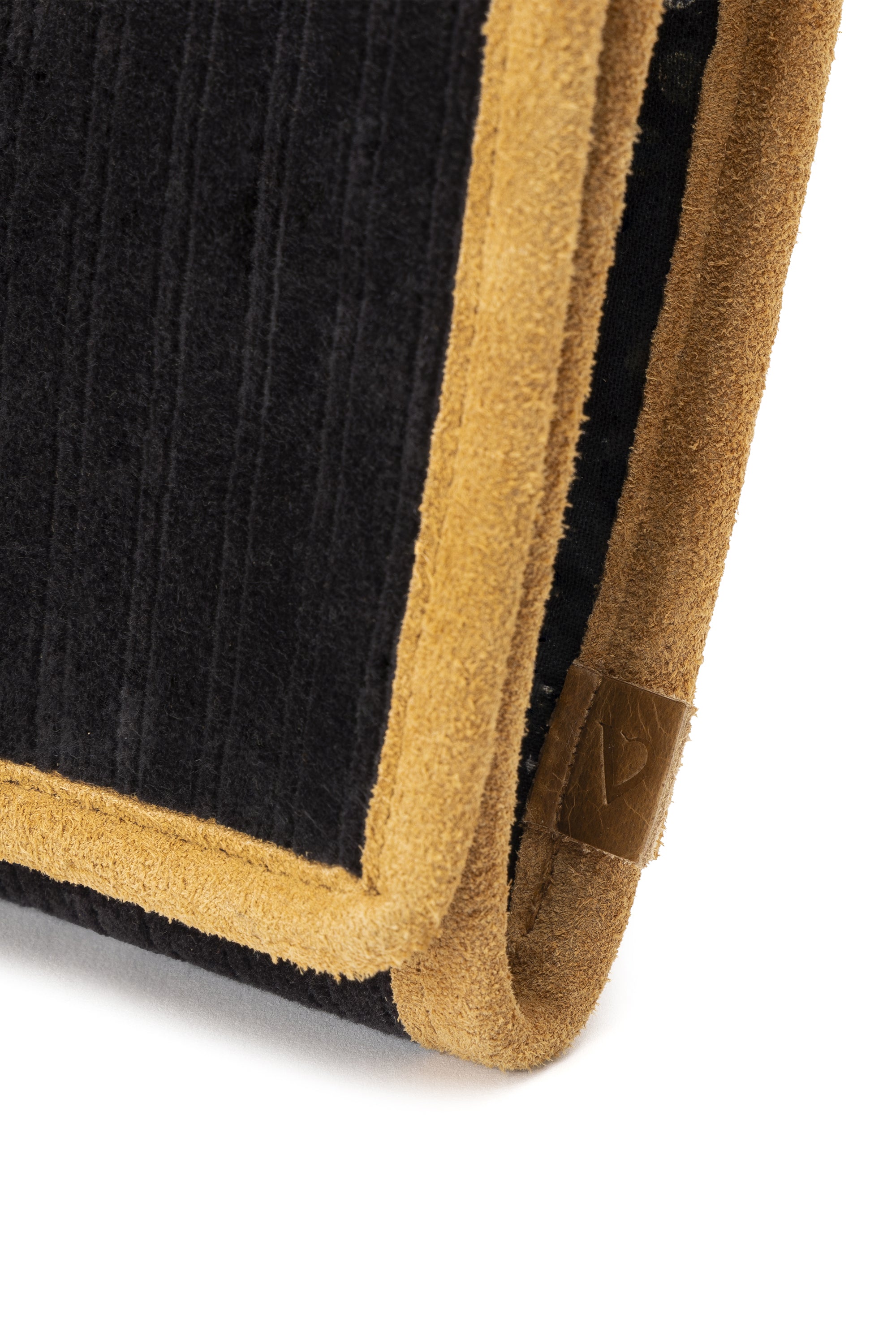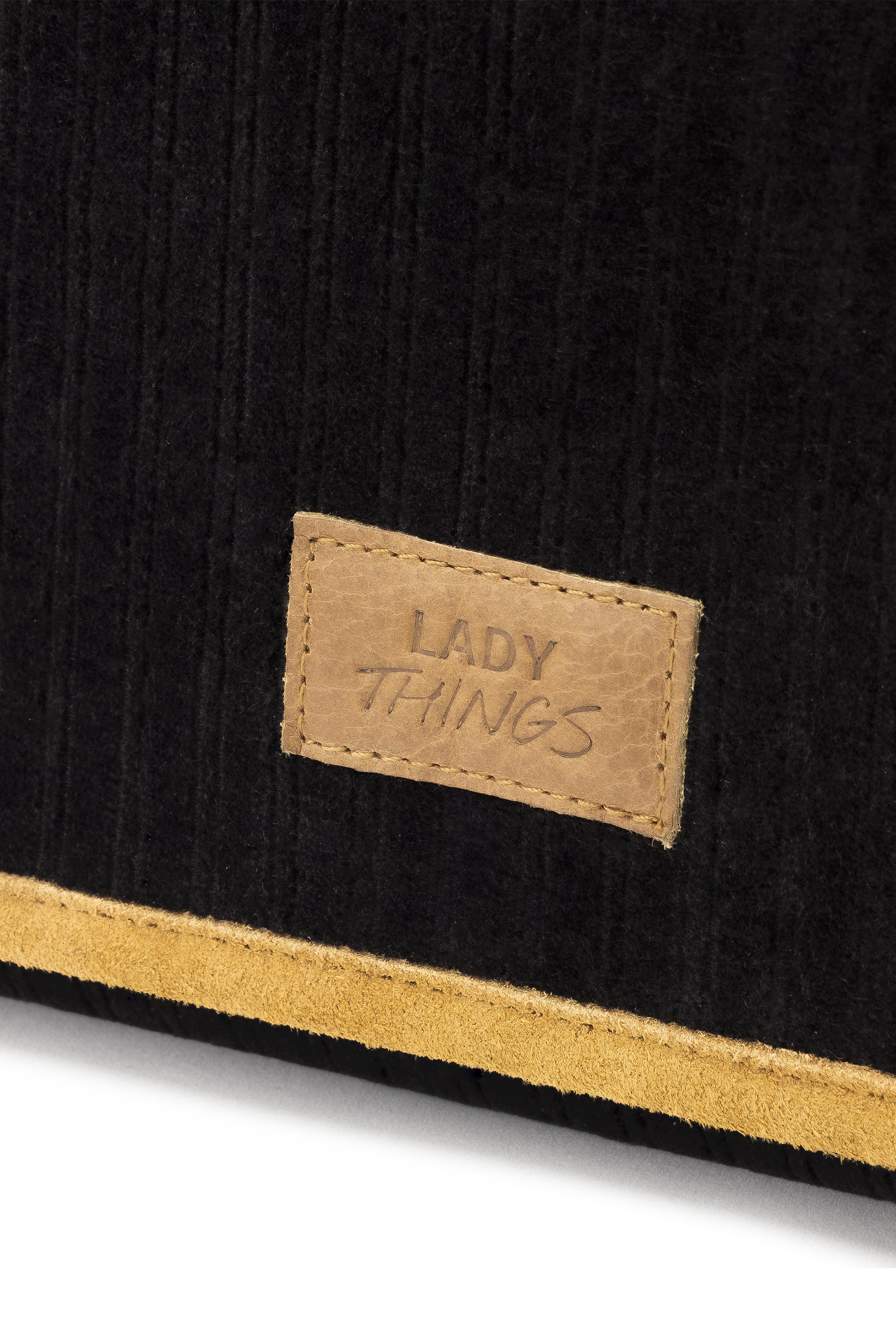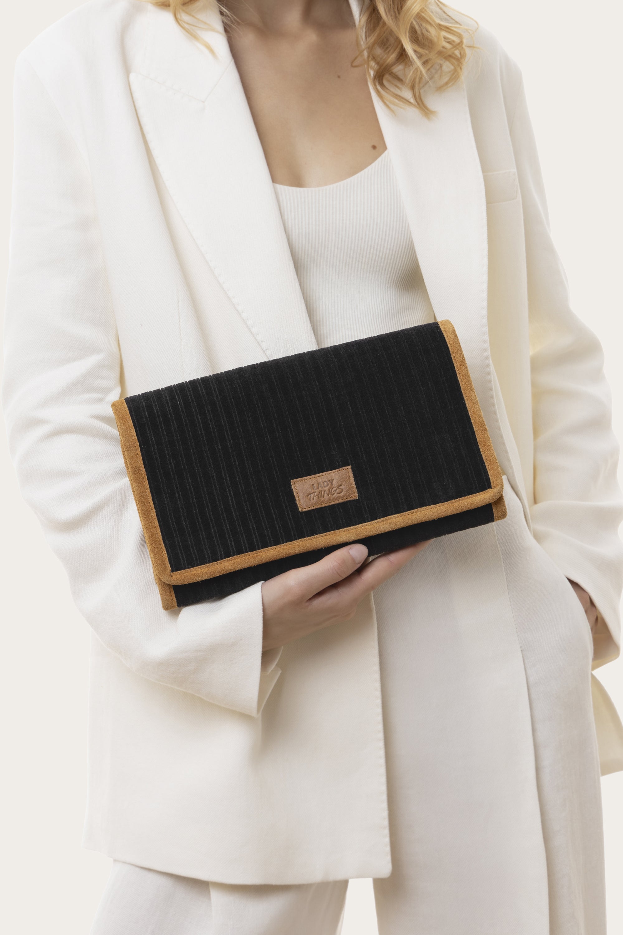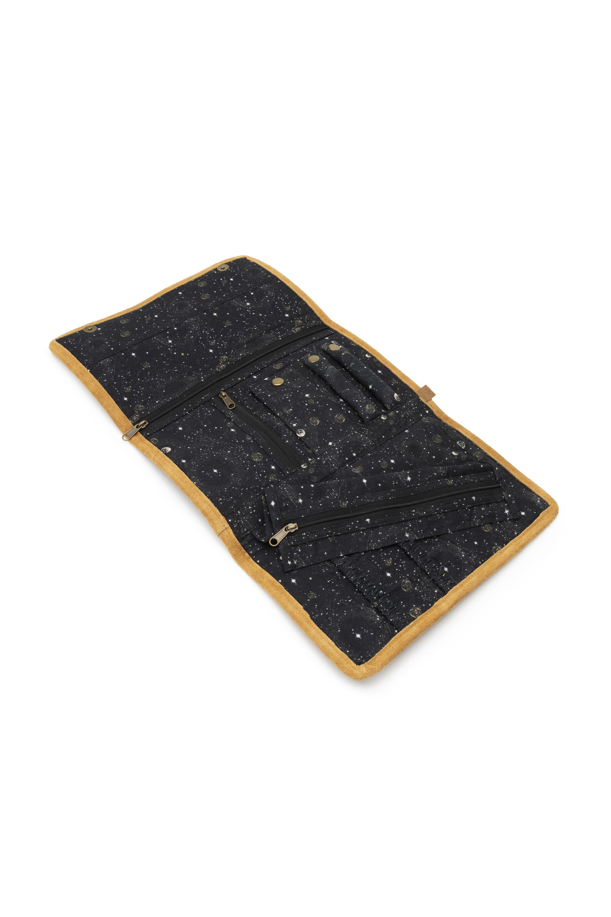 Jewelry Pouch in black. The dream container for your jewelry—take your favourite pieces wherever you go. Soft and practical, perfect for a weekend away or to slip inside a large travel tote. Also available in ochre. Body: 100 % cotton. Star-pattern lining: 100 % cotton. Inner pockets: three zip. Fastening: magnetic button. Size: 26 (W) × 17 (H) cm.