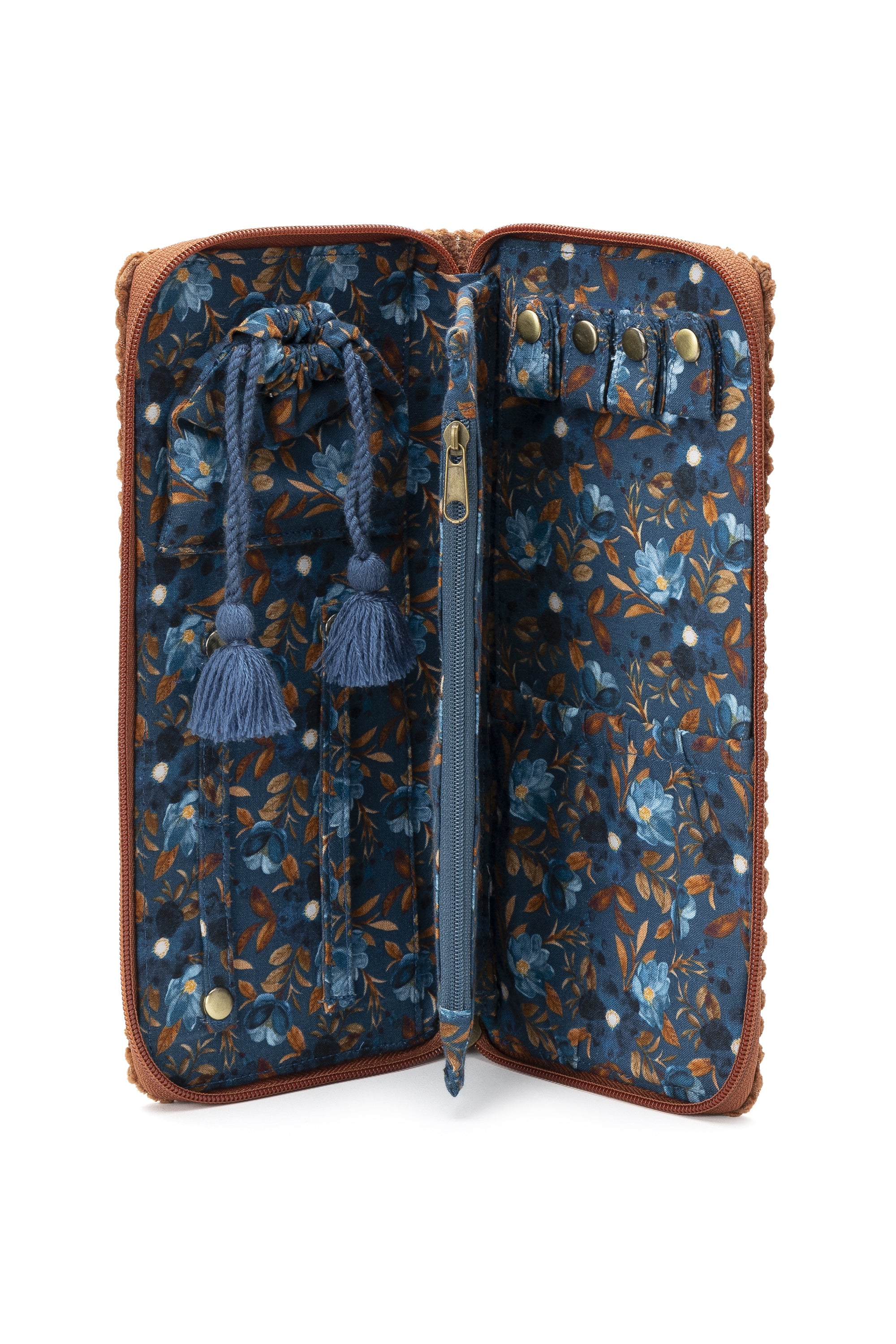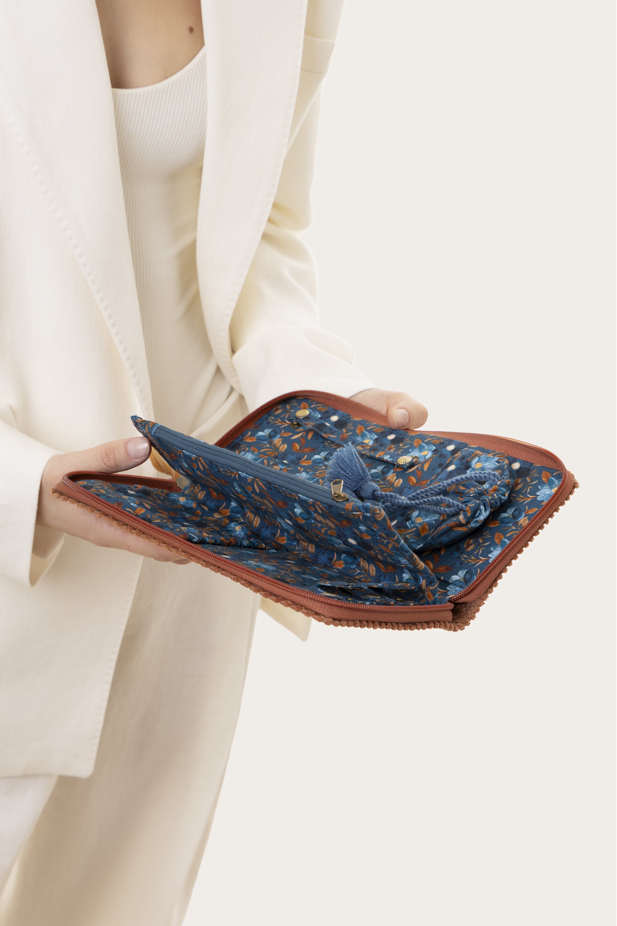 jewelry Pouch in rust. The dream container for your jewelry—take your favourite pieces wherever you go. Soft and practical, perfect for a weekend away or to slip inside a large travel tote. Also available in teal. Body: 100 % cotton. Floral-pattern lining: 100 % cotton. Inner pocket: one zip plus drawstring. Fastening: zip. Size: 25 (W) × 12 (H) × 3 (D) cm.