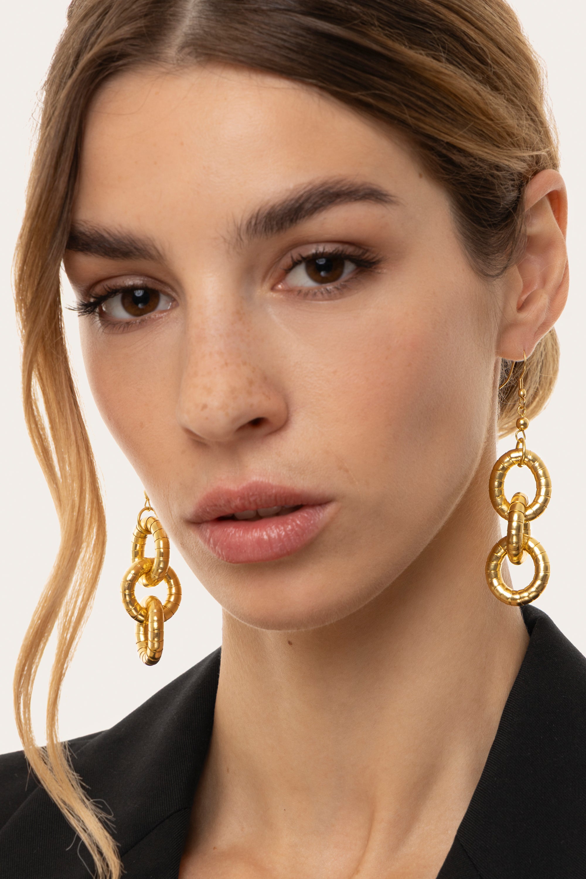 Chain never goes out of style. Dangle earrings in recycled brass with a double interlocking chain ring design, bold and contemporary. The rounded shapes and striking design draw attention, ideal for both casual chic and elegant looks. Hook fastening, practical and versatile for easy wear. Nickel tested. Artisan craftsmanship. Handmade, unique and artisanal jewelry, perfect for all your looks or as a gift idea.