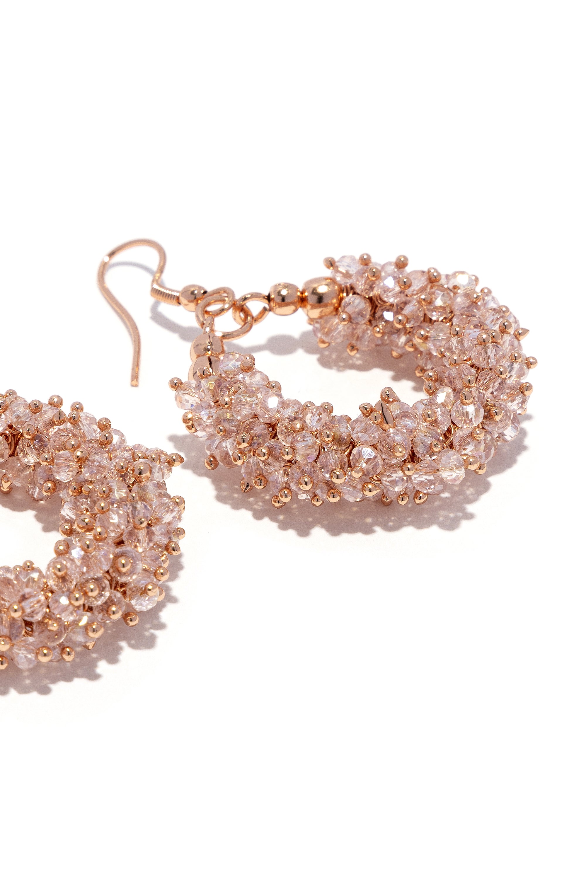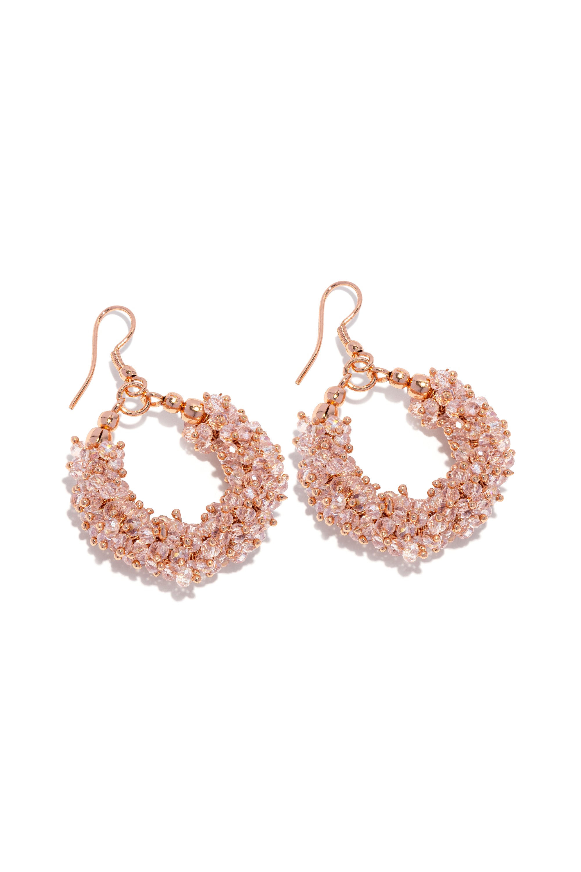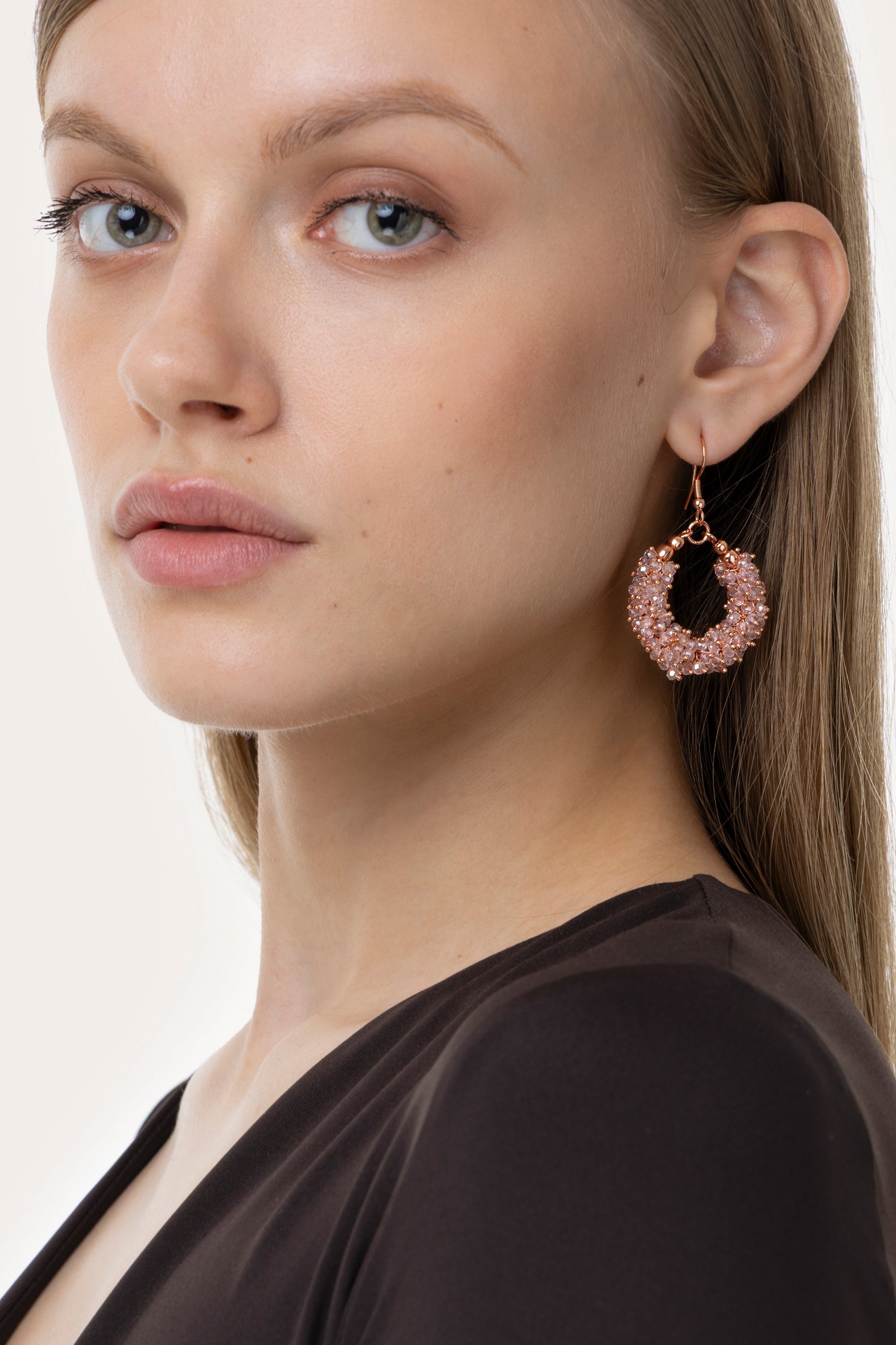 Movement and brilliance in an enveloping design: these copper?plated hoop drop earrings feature an irresistible cluster of glass crystals. The powder?pink micro?elements are hand?applied using the mogra technique, making each piece unique. Hook closure; diameter 3.5?cm. Handmade artisanal jewelry, unique pieces ideal for any look or as a gift idea. Nickel?tested.