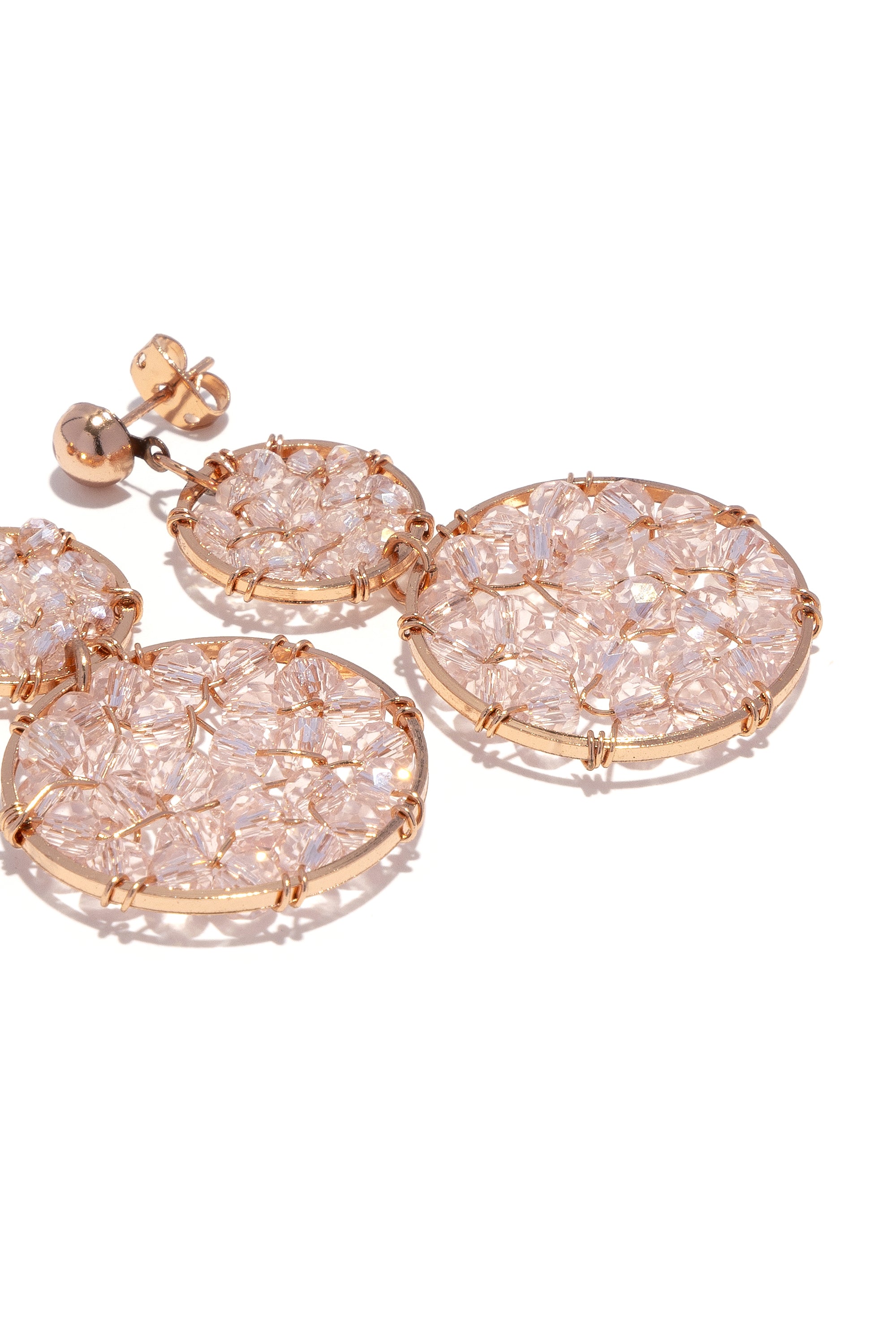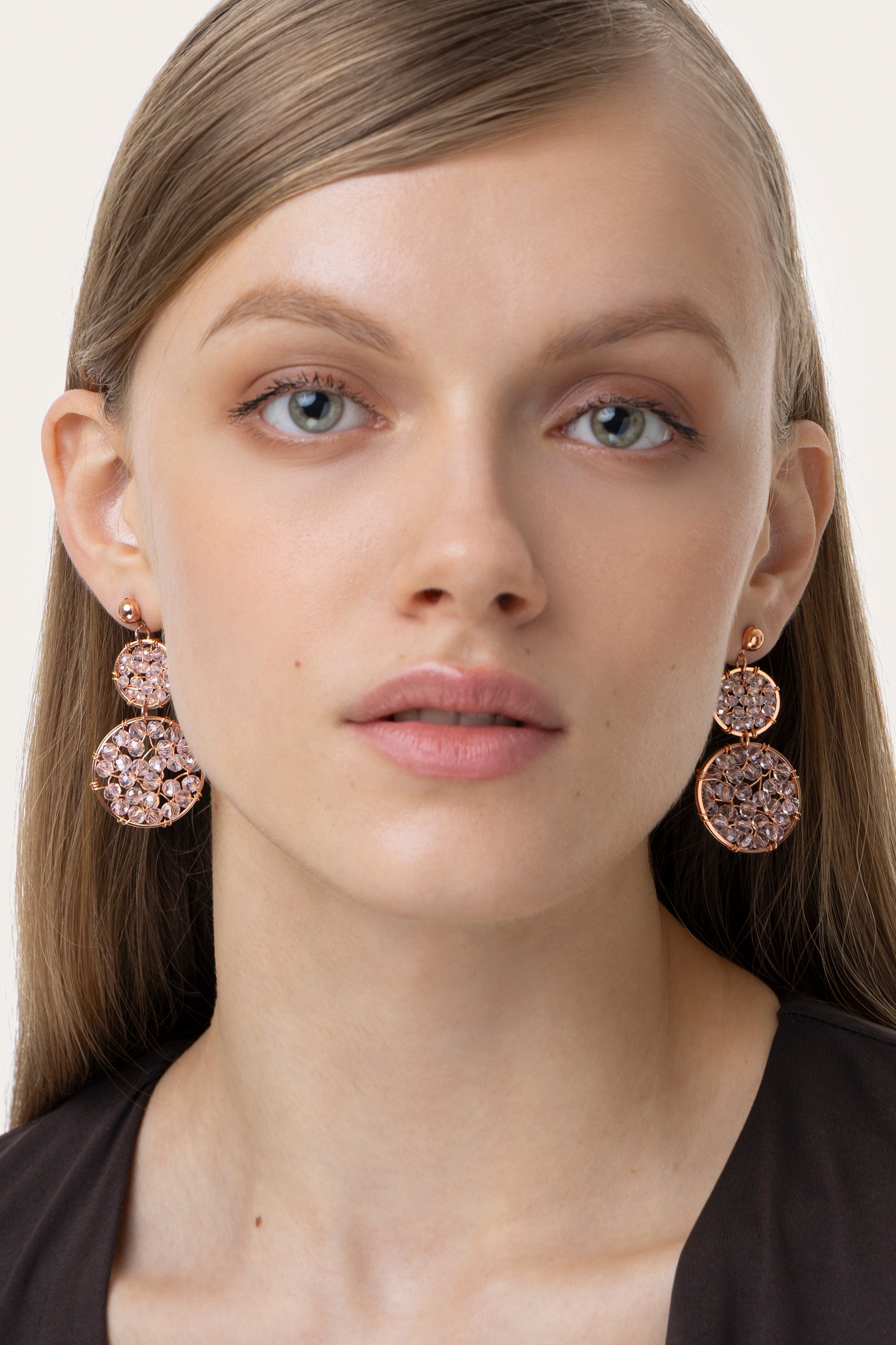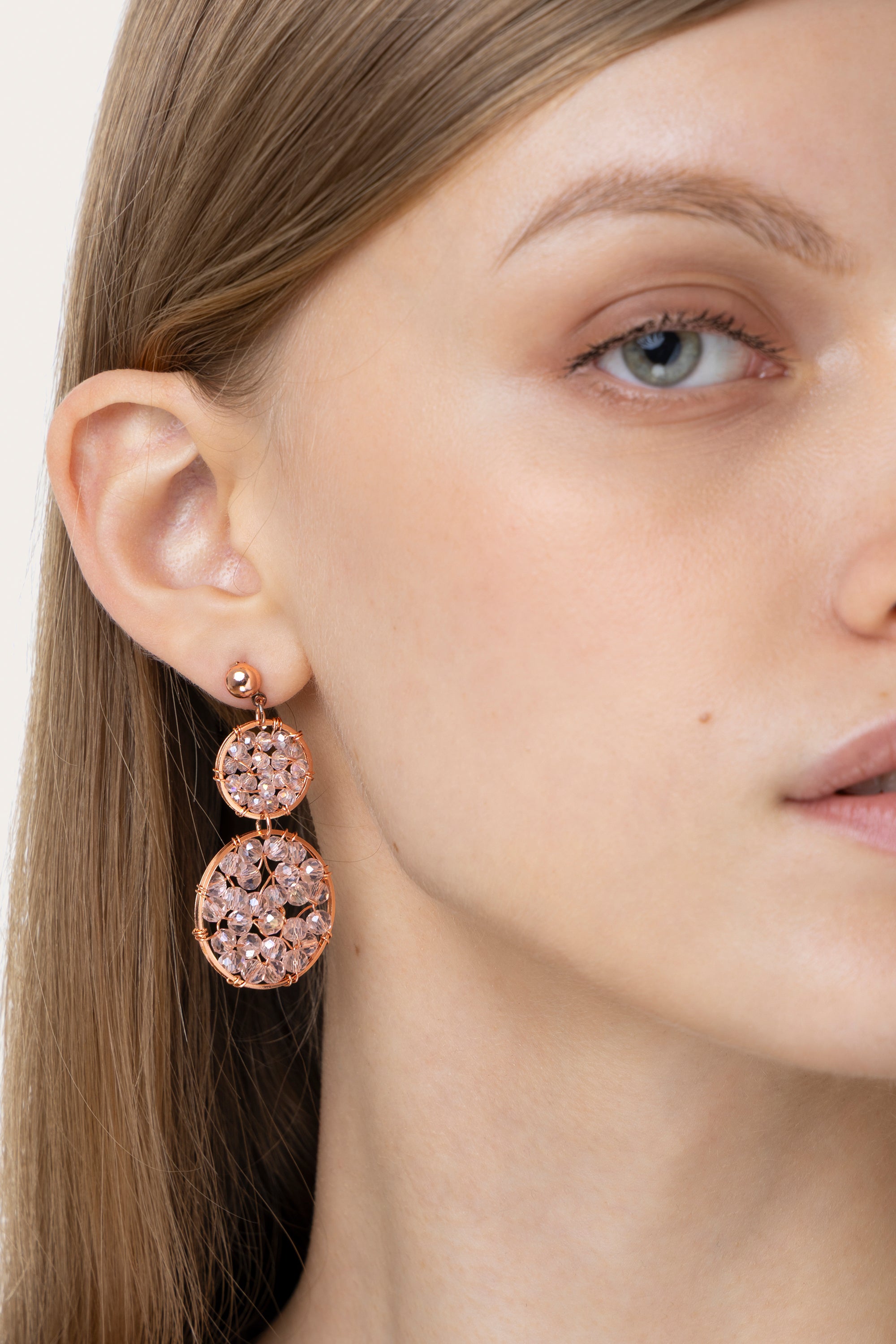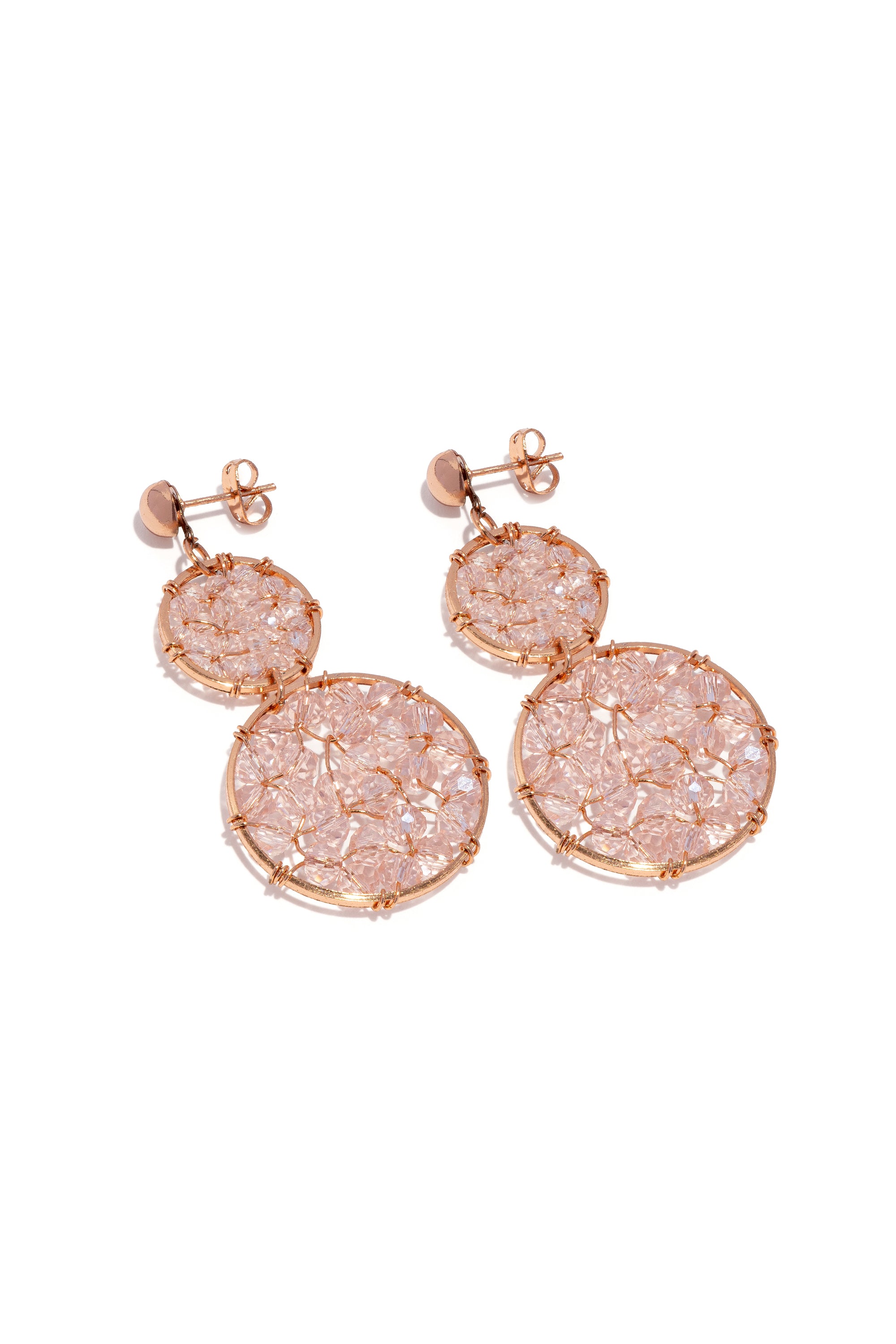Copper?plated double?hoop drop earrings: the pattern is defined by a layer of powder?pink crystals applied with micro?wire, creating an irregular, mother?of?pearl effect. Butterfly closure. Handmade artisanal jewelry, unique pieces ideal for any look or as a gift idea. Nickel?tested.