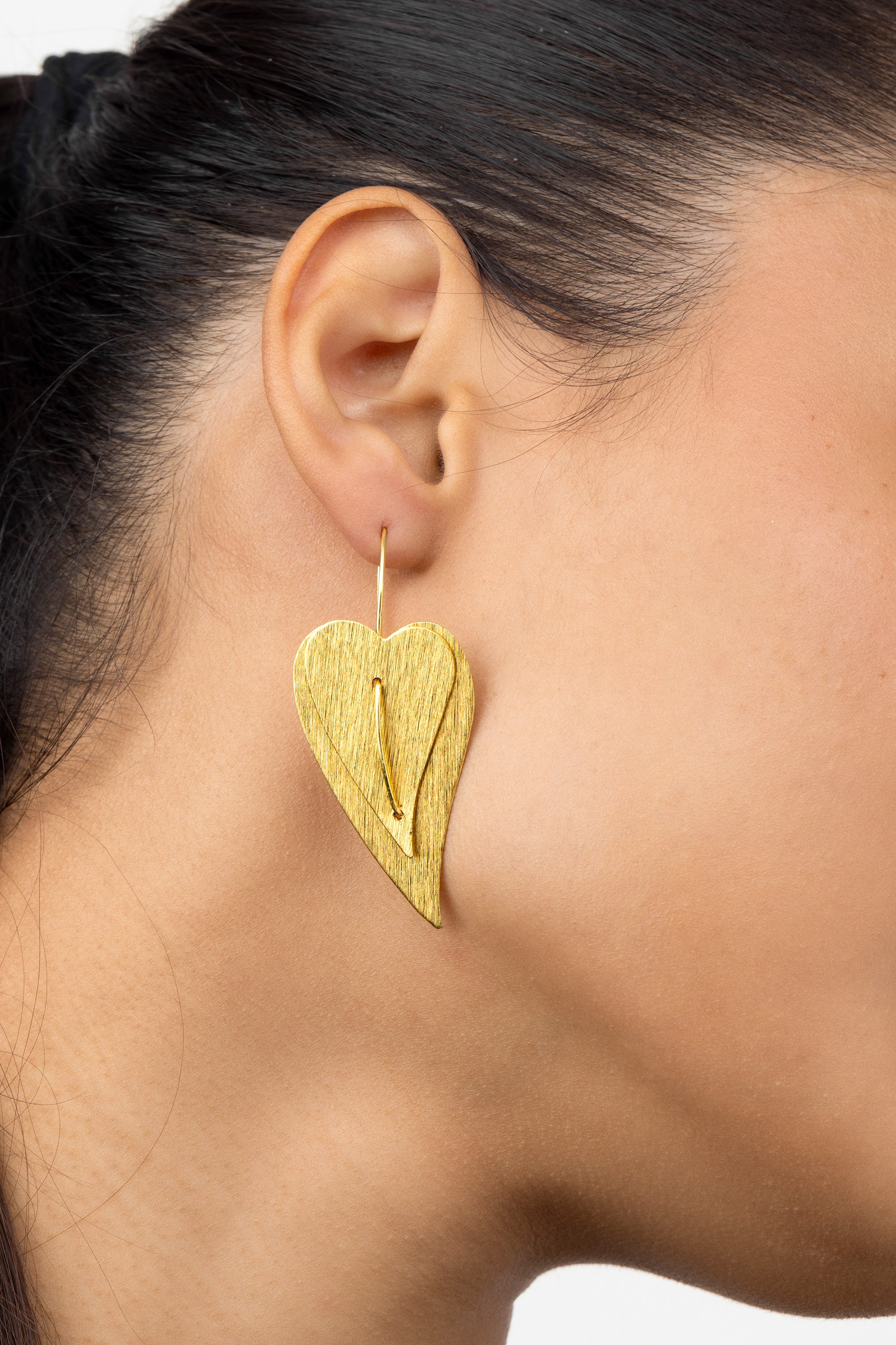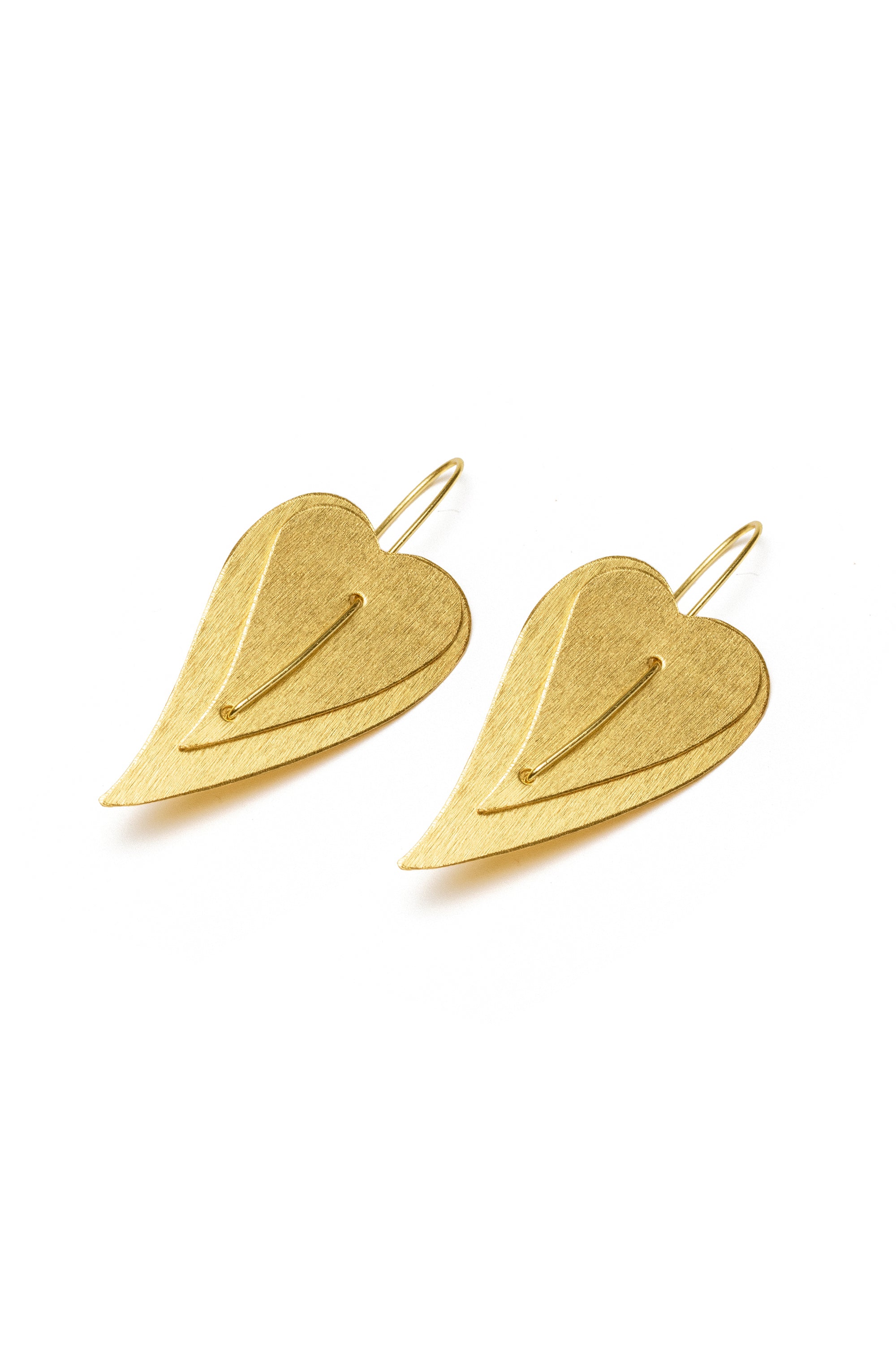 Leaf/heart-shaped drop earrings with a hand-worked central vein: a tapered silhouette, satin finish, and a vibrant mood for your day-to-night looks. Hook fastening. Length 4,8 cm. Handmade in recycled brass. Nickel tested. Handmade, unique, handcrafted jewelry perfect for all your looks or as a gift idea.