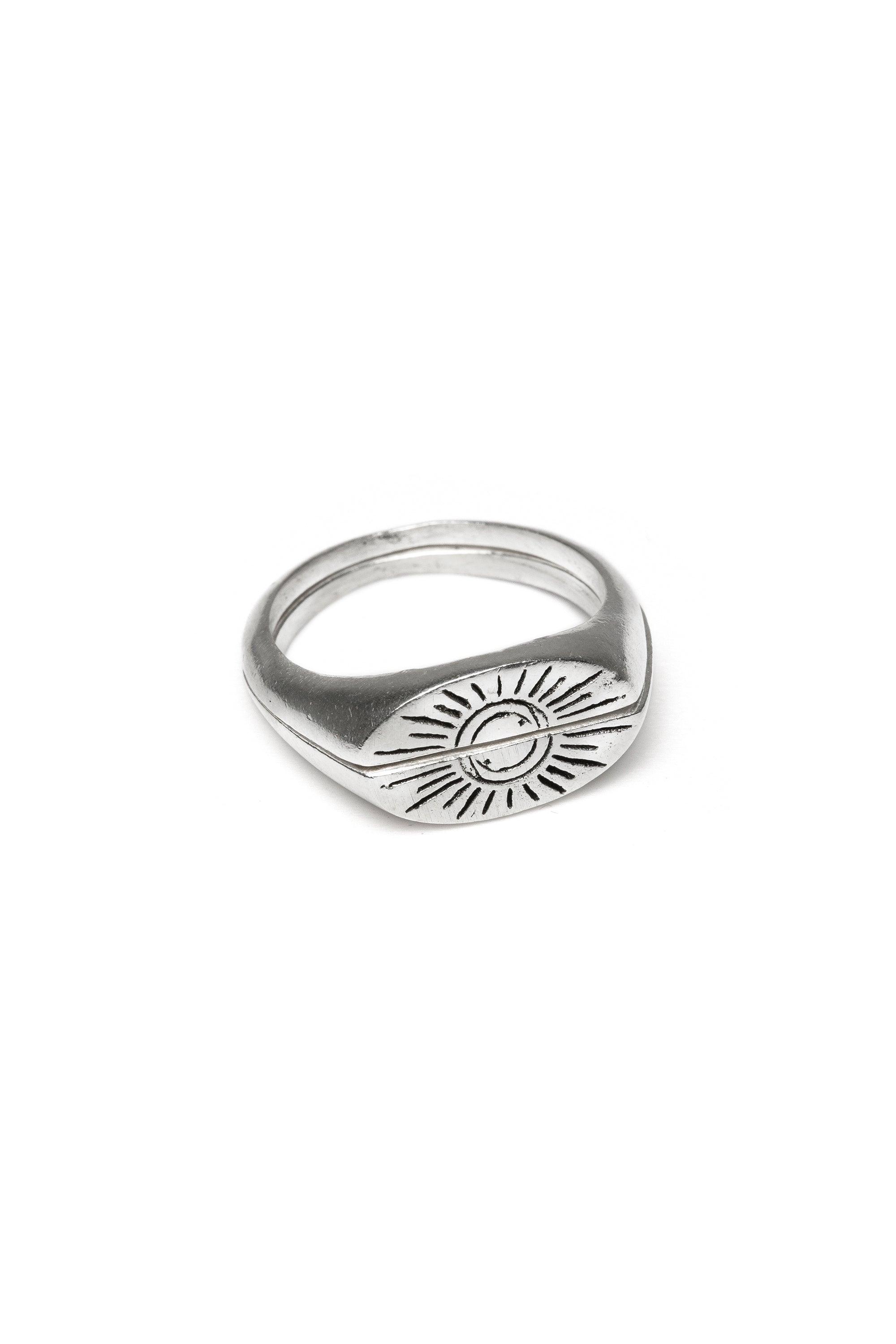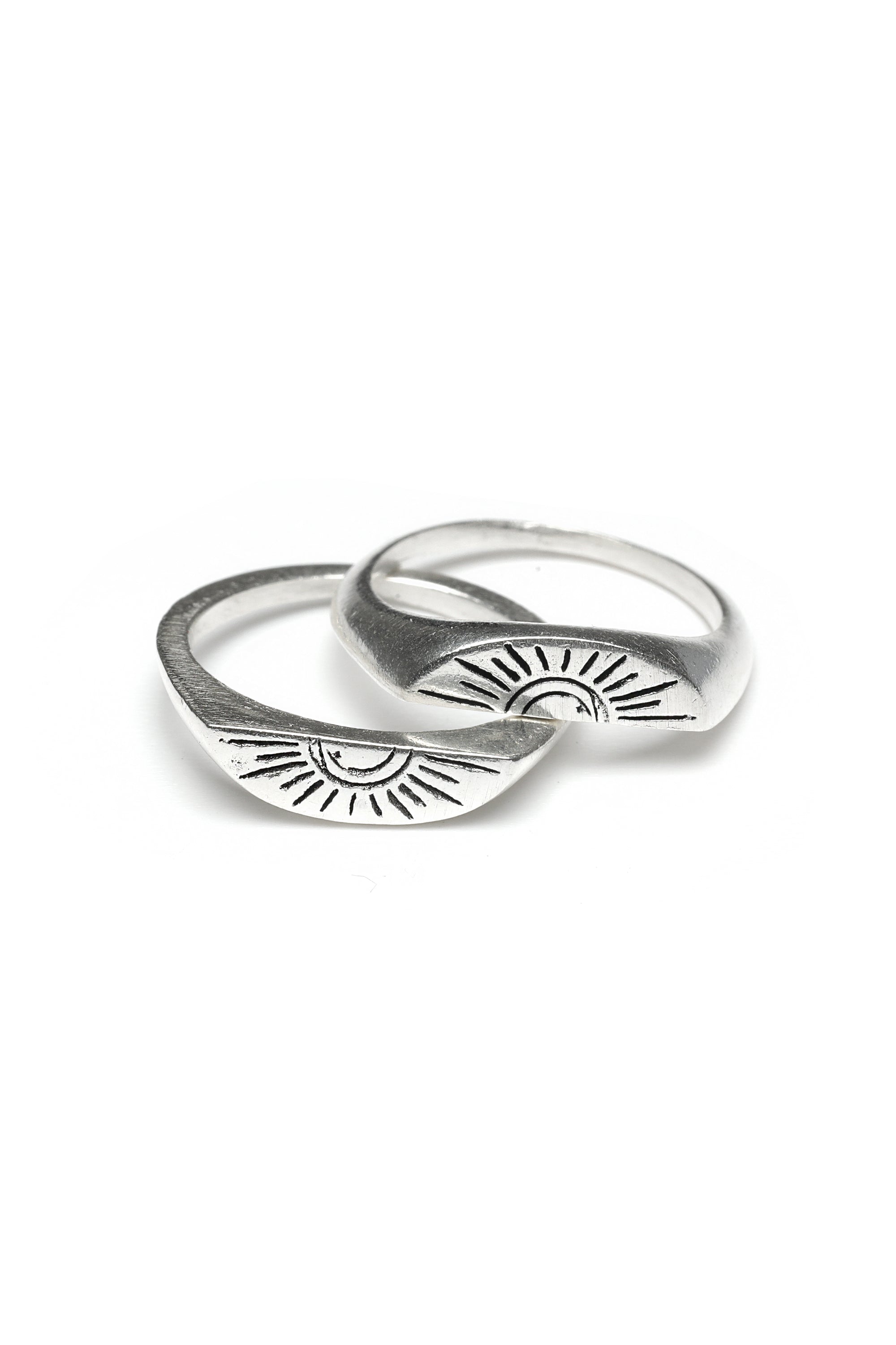 A twist, your way. This engraved-sun ring is a modular style to wear as one piece or by splitting the two bands to mix across other fingers. Material: 100% handcrafted silver plating. Nickel tested. Handmade, unique, handcrafted jewelry perfect for all your looks or as a gift idea.